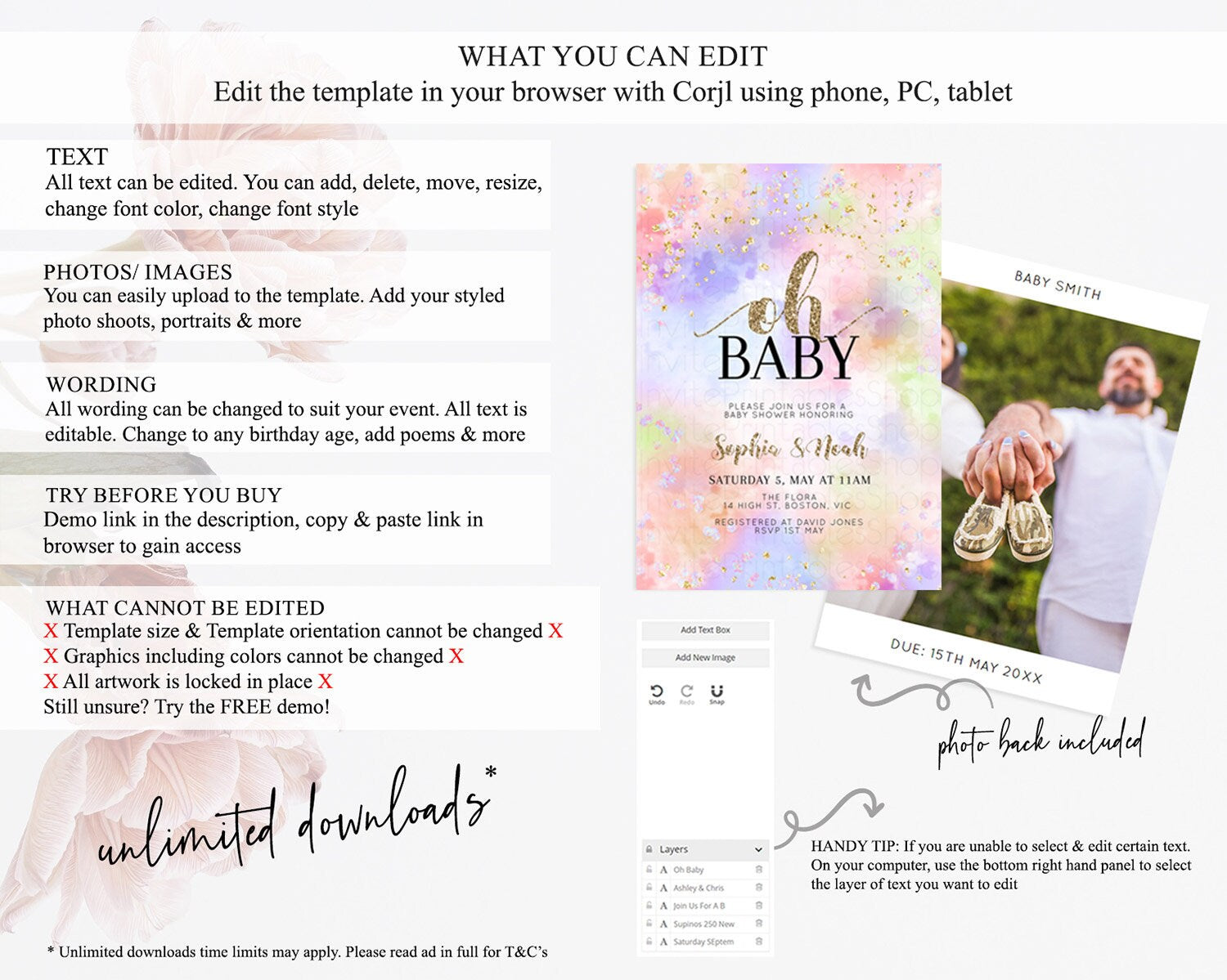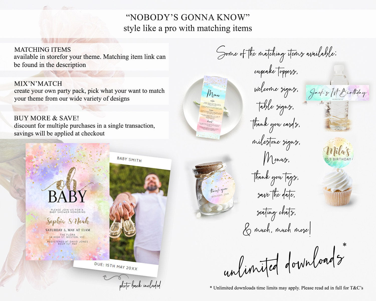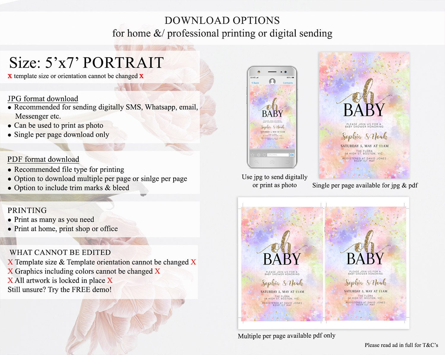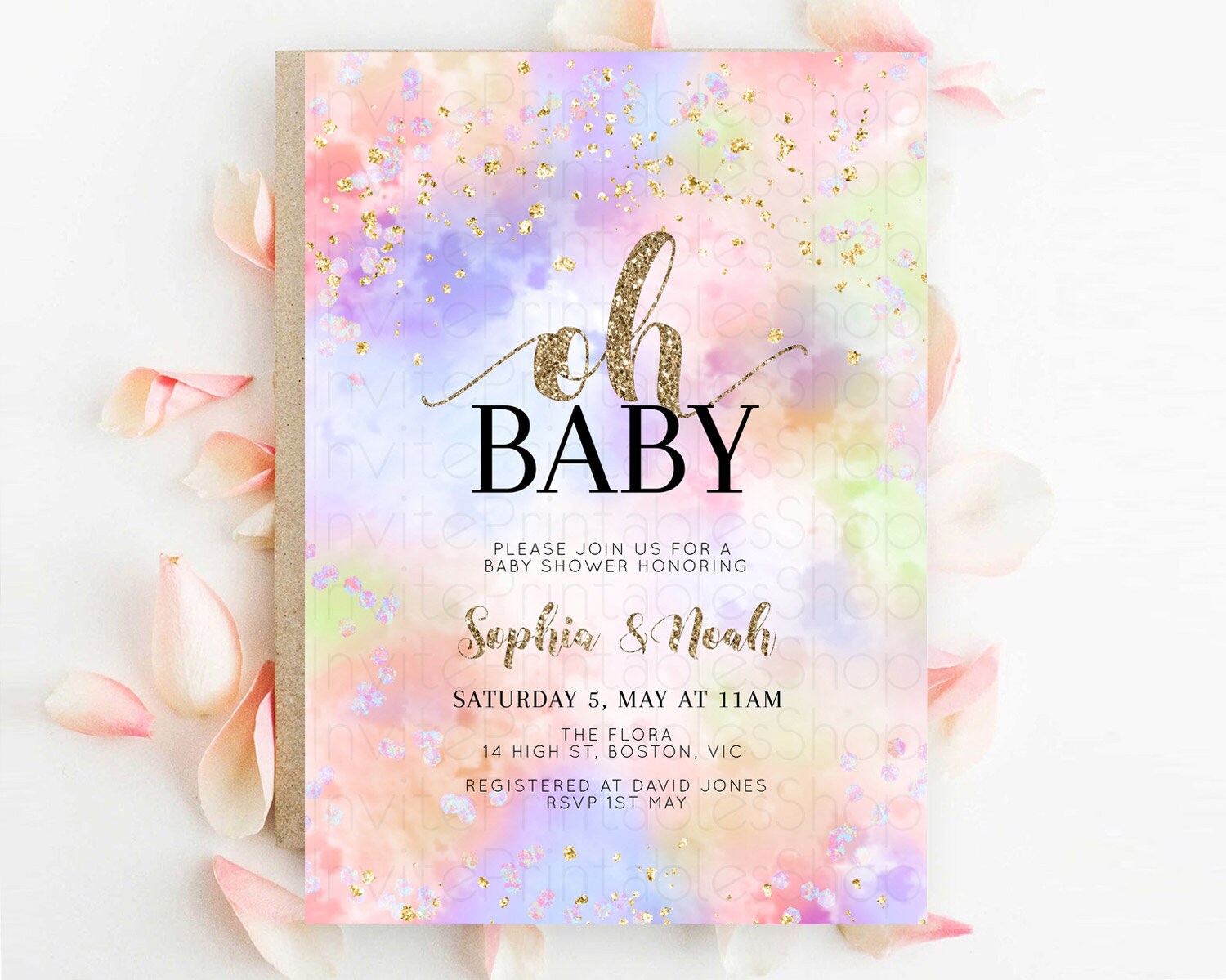 Pastel Baby Shower Invitation Rainbow Baby Shower Invitation Colorful Pastel Watercolor Invitation Gold Glitter Sprinkles Ombre D11019