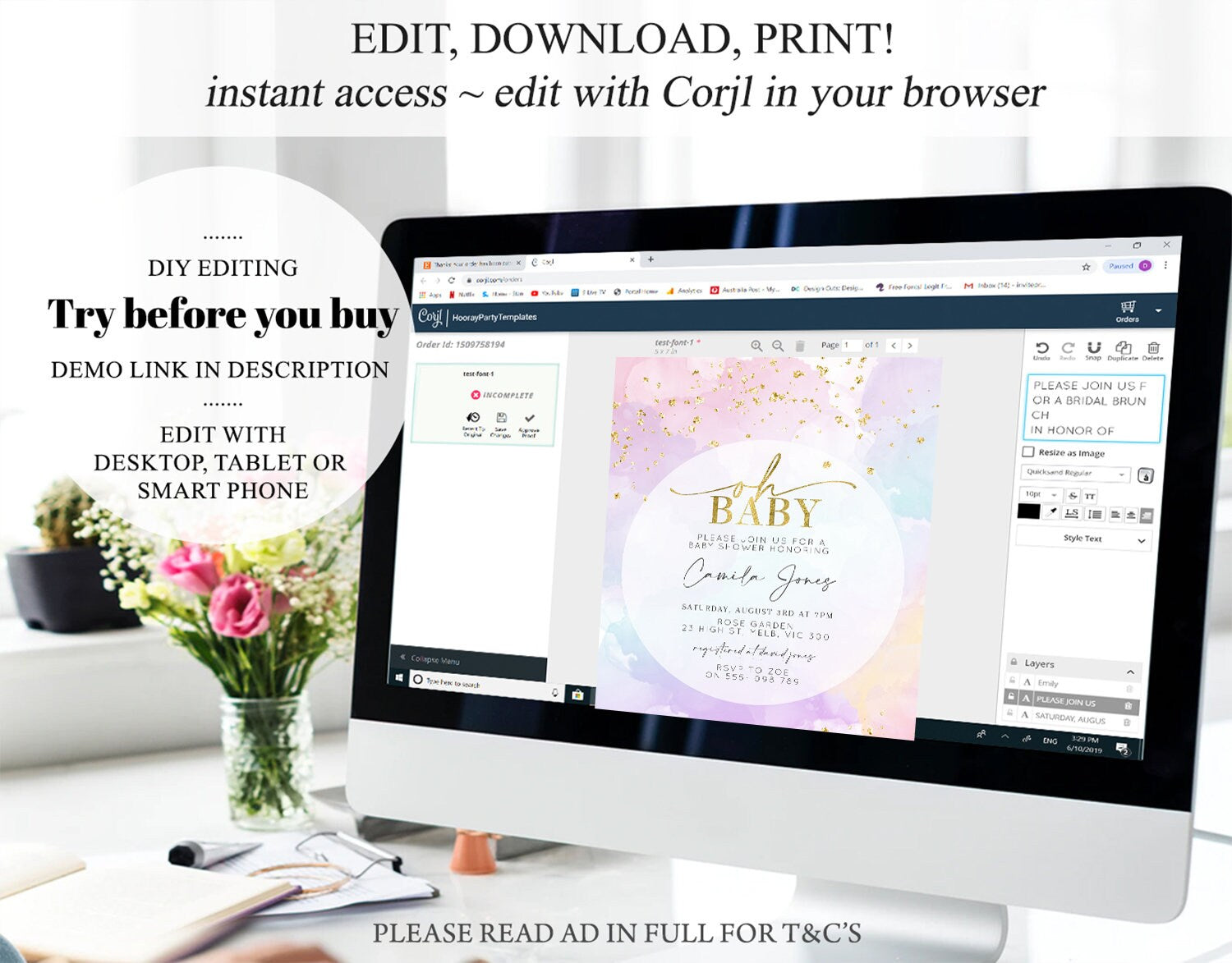 • After purchase, Corjl emails your editing link. Allow up to 15 minutes for delivery.