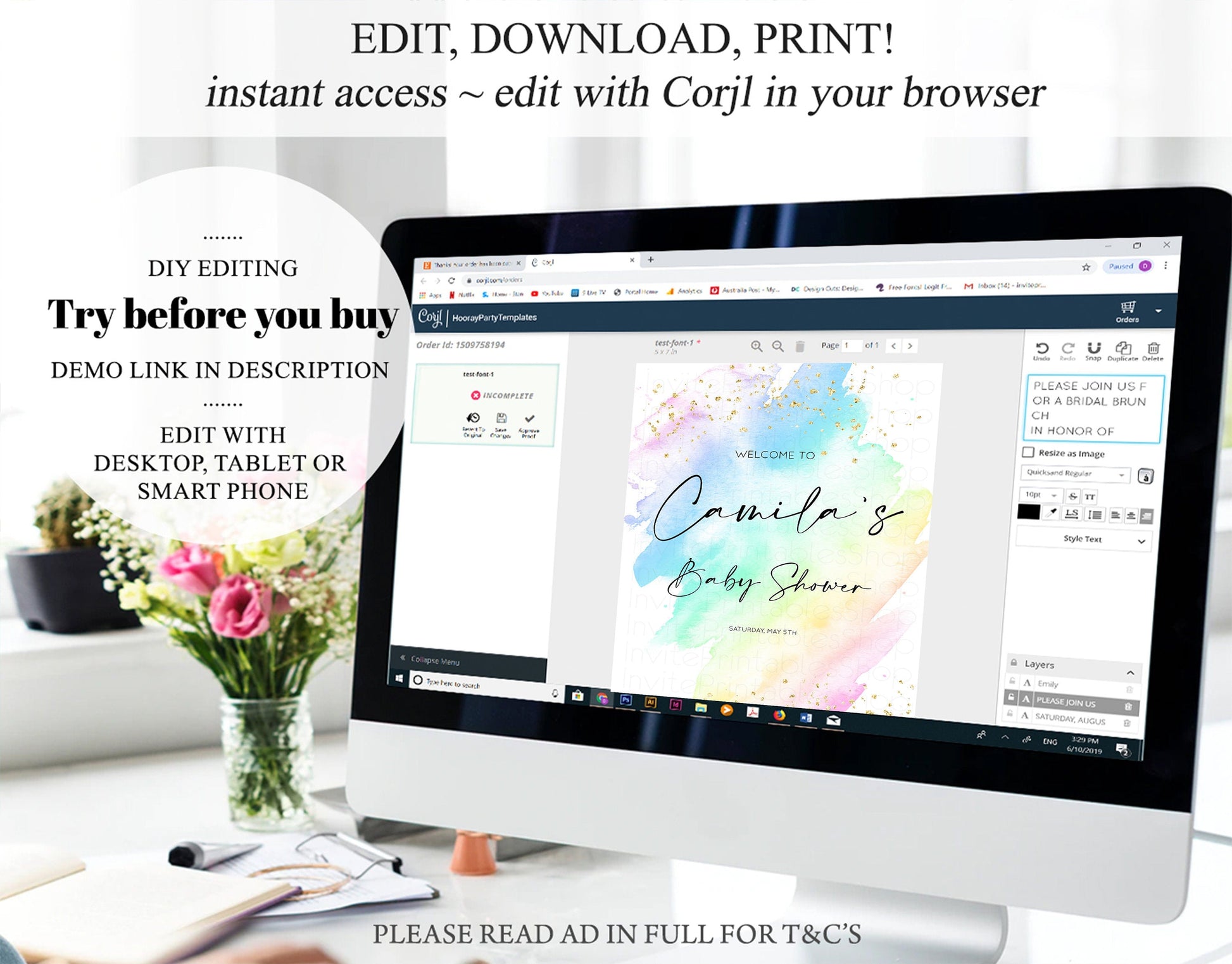 • After purchase, Corjl emails your editing link. Allow up to 15 minutes for delivery.