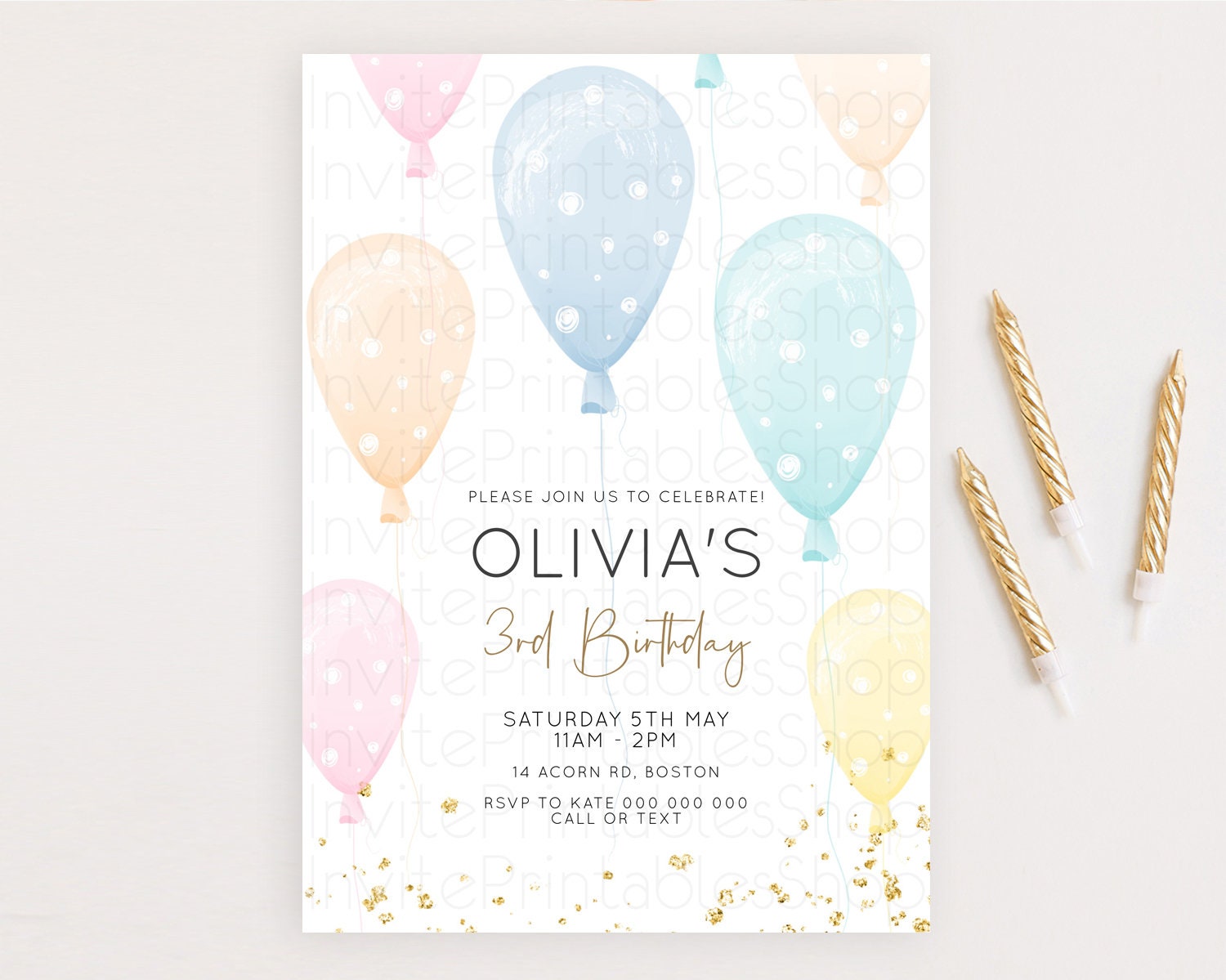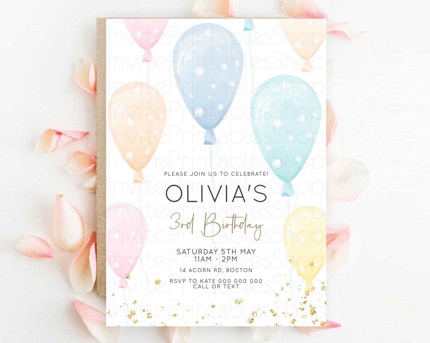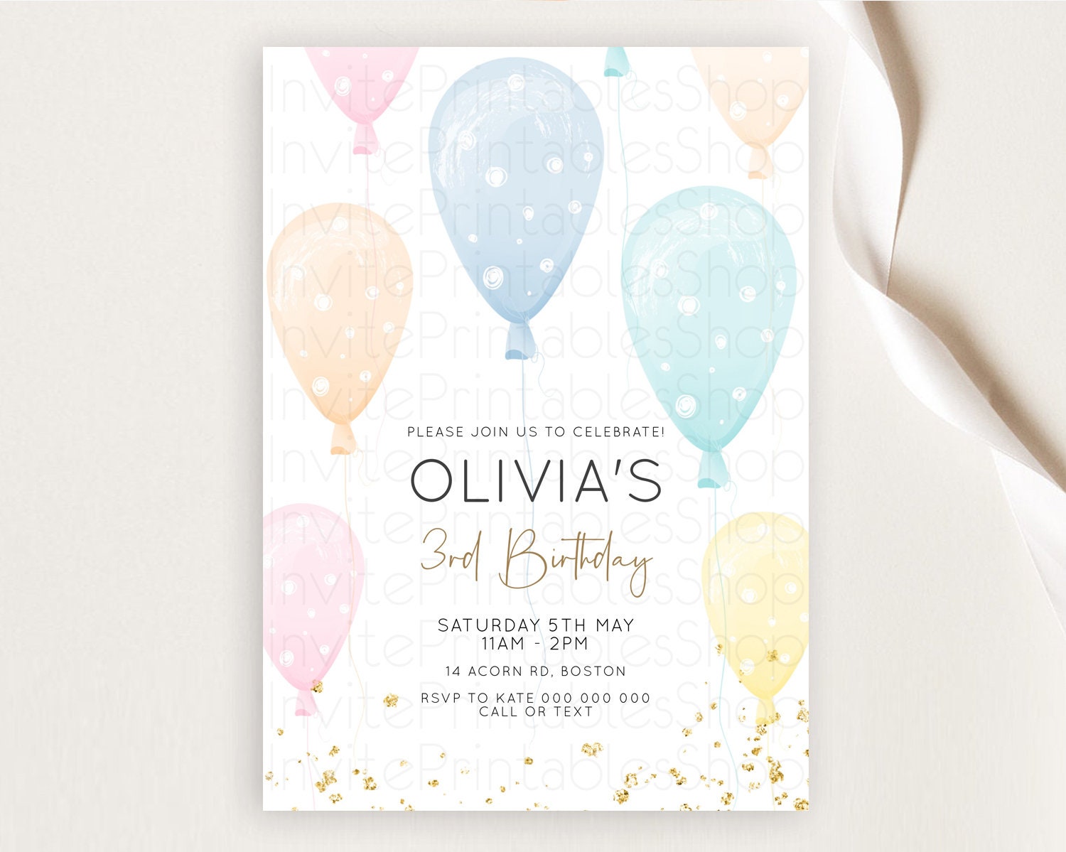 Pastel Balloon Birthday Invitation Rainbow Colorful Glitter Sprinkles Confetti Watercolor Balloons Pink Blue Green Yellow Editable D10776