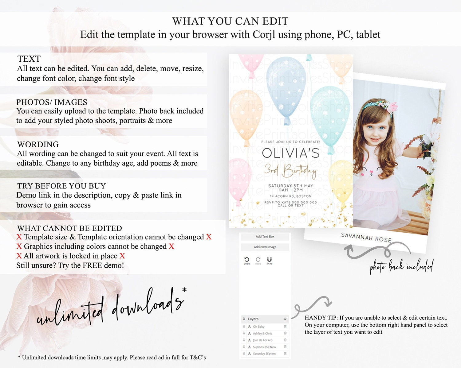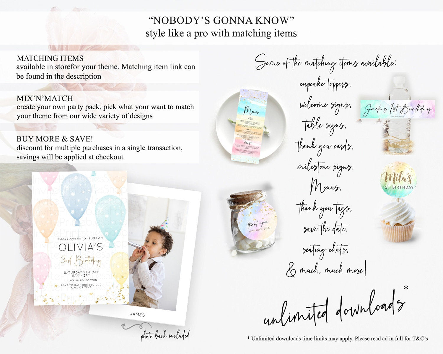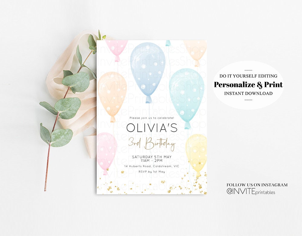 Pastel Balloon Birthday Invitation Rainbow Colorful Glitter Sprinkles Confetti Watercolor Balloons Pink Blue Green Yellow Editable D10776