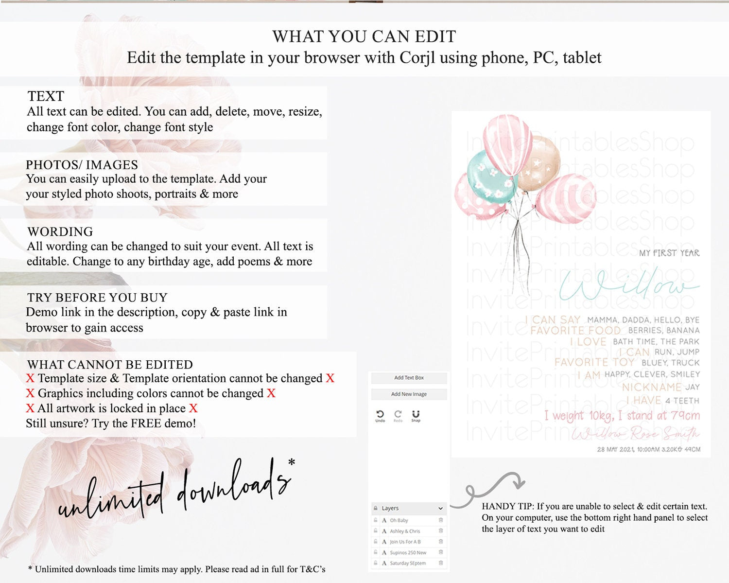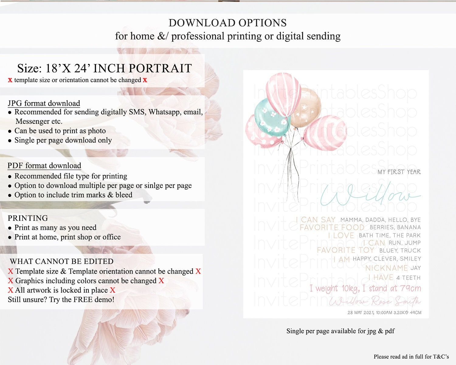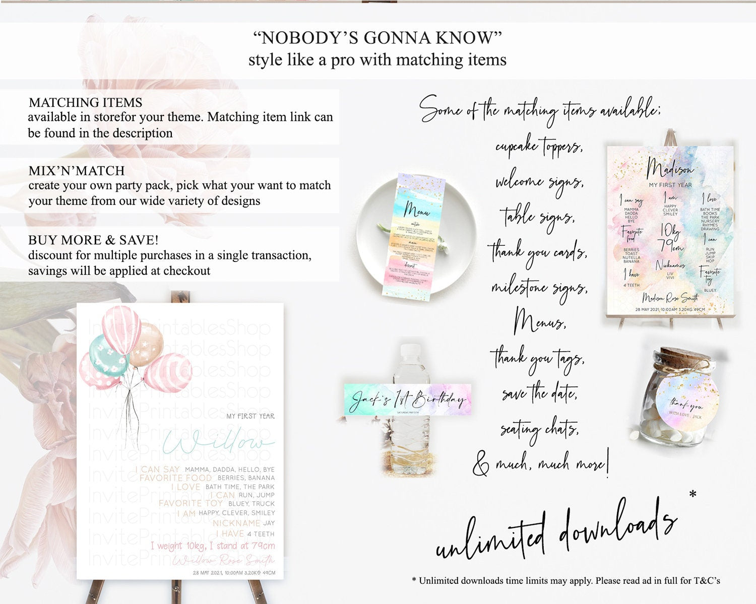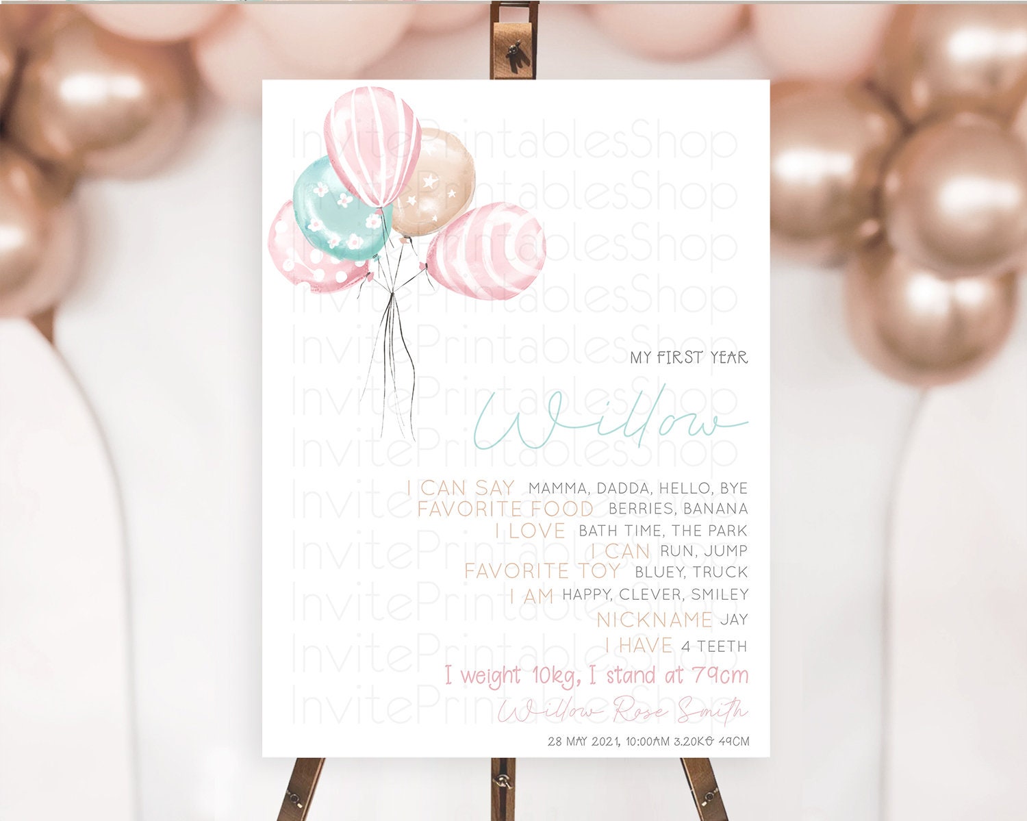 Pastel Balloons First Birthday Milestone Board Colorful Balloon Milestone Poster Rainbow Balloon Confetti 1st Birthday Welcome Sign D10687