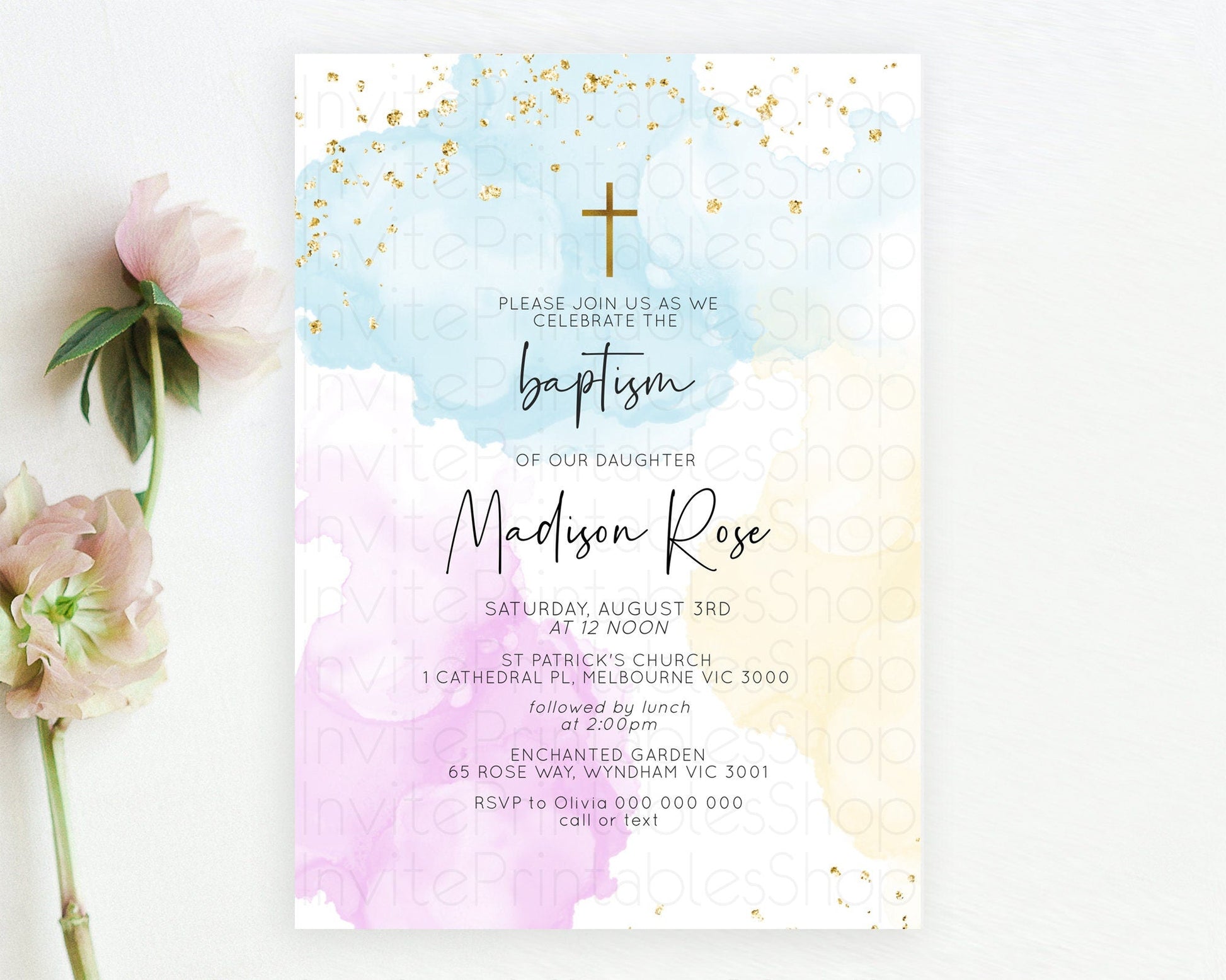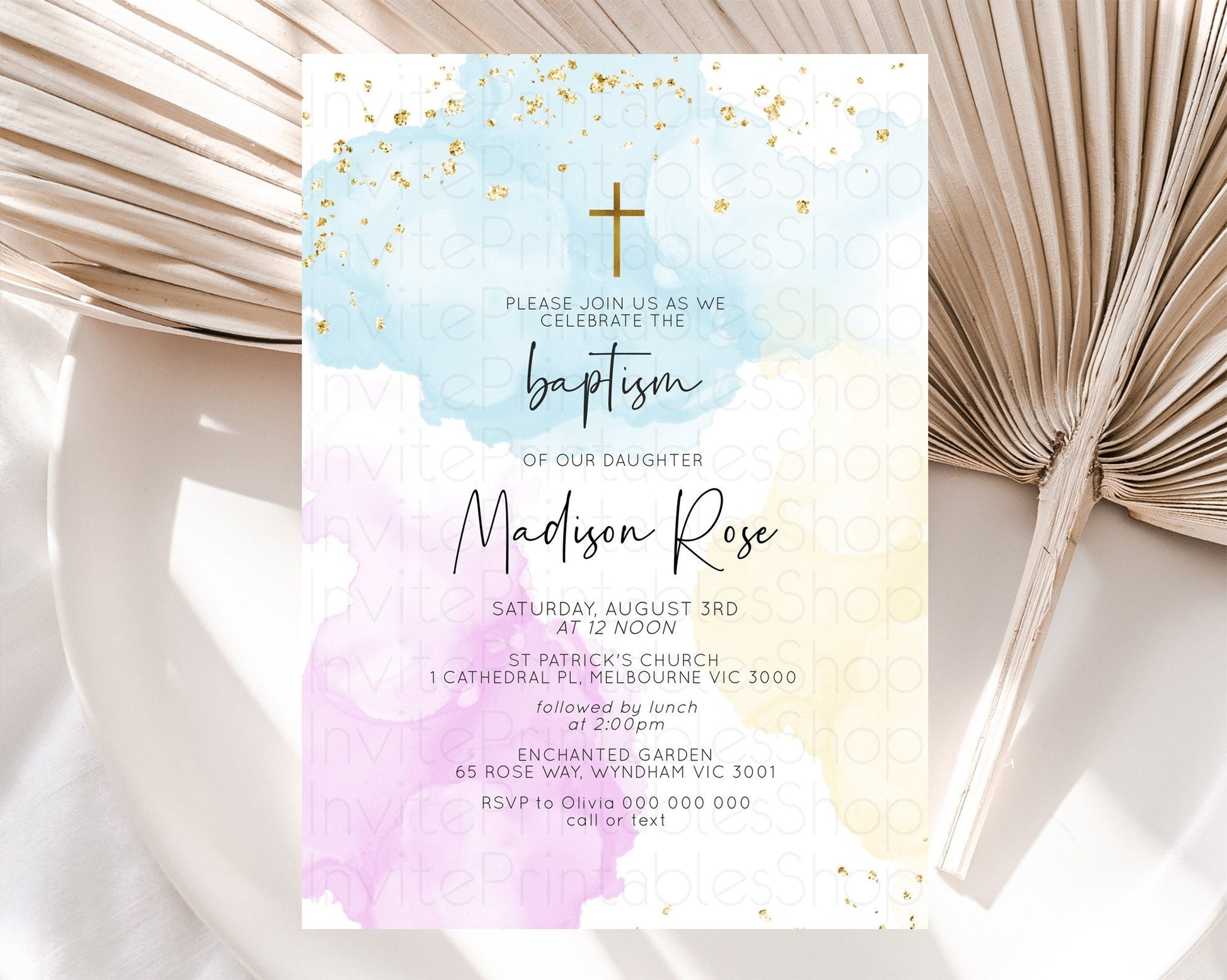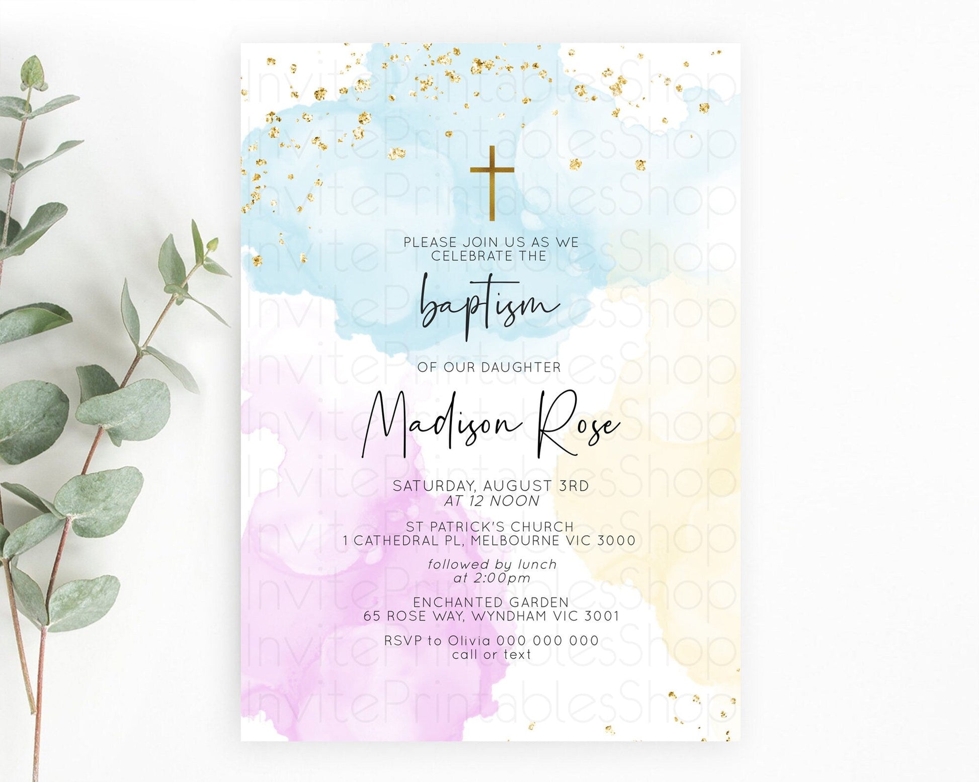 Pastel Baptism Invitation Pastel Colors Watercolor Baptism 1st Birthday Party Gold Ombre Pastel Rainbow Christening Holy Communion D10155