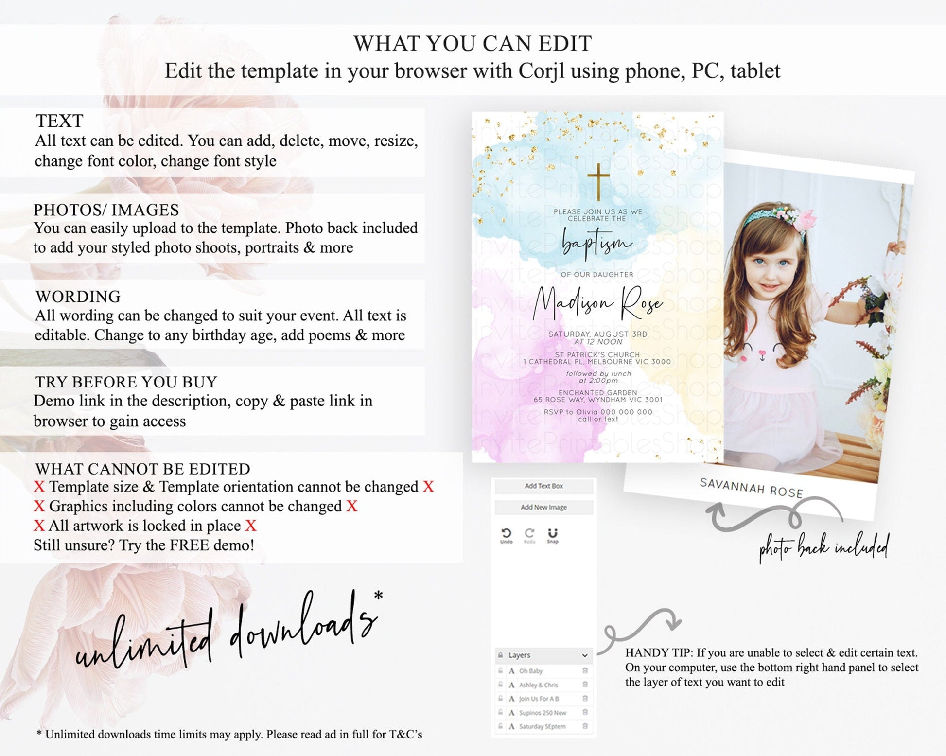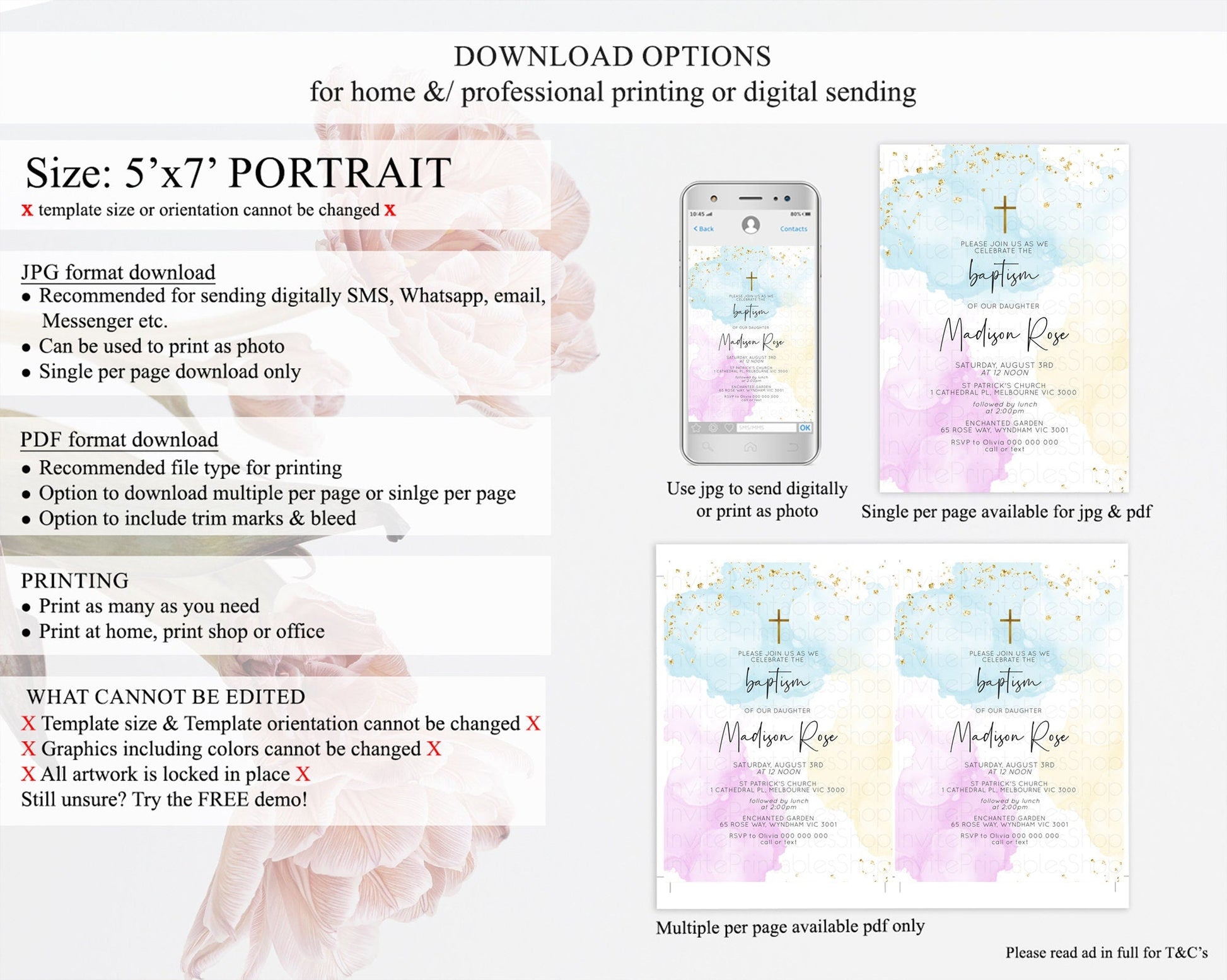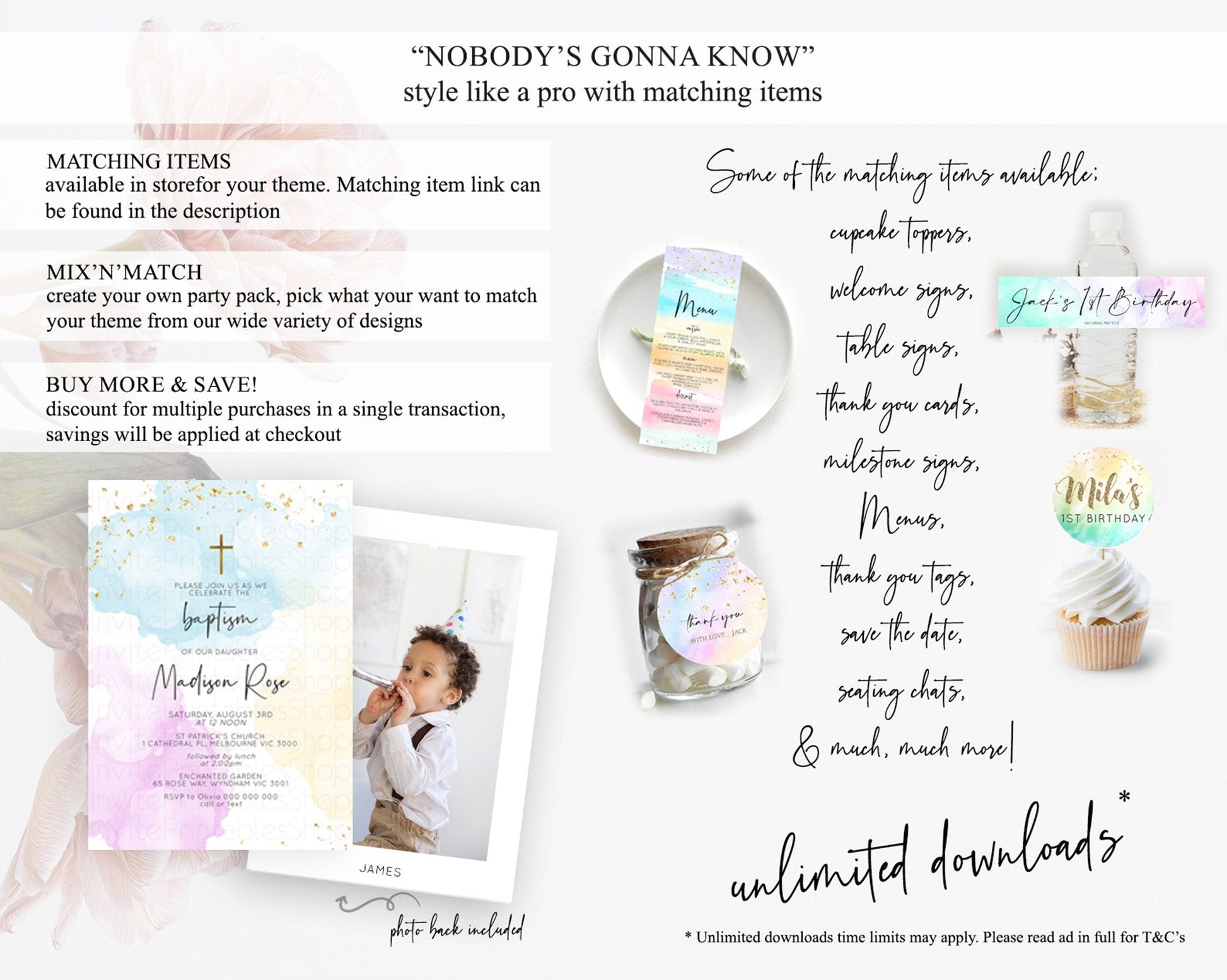 Pastel Baptism Invitation Pastel Colors Watercolor Baptism 1st Birthday Party Gold Ombre Pastel Rainbow Christening Holy Communion D10155