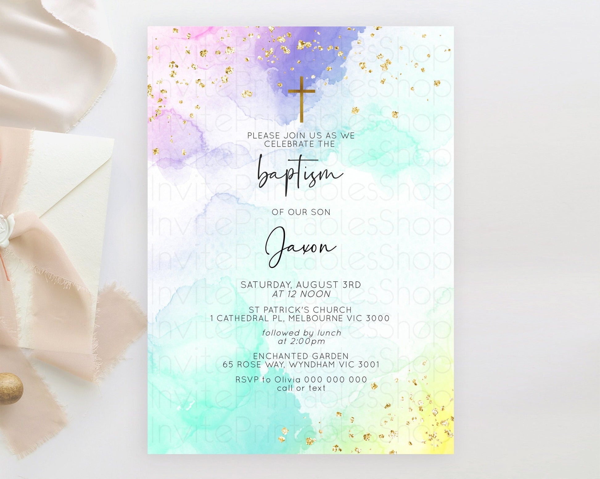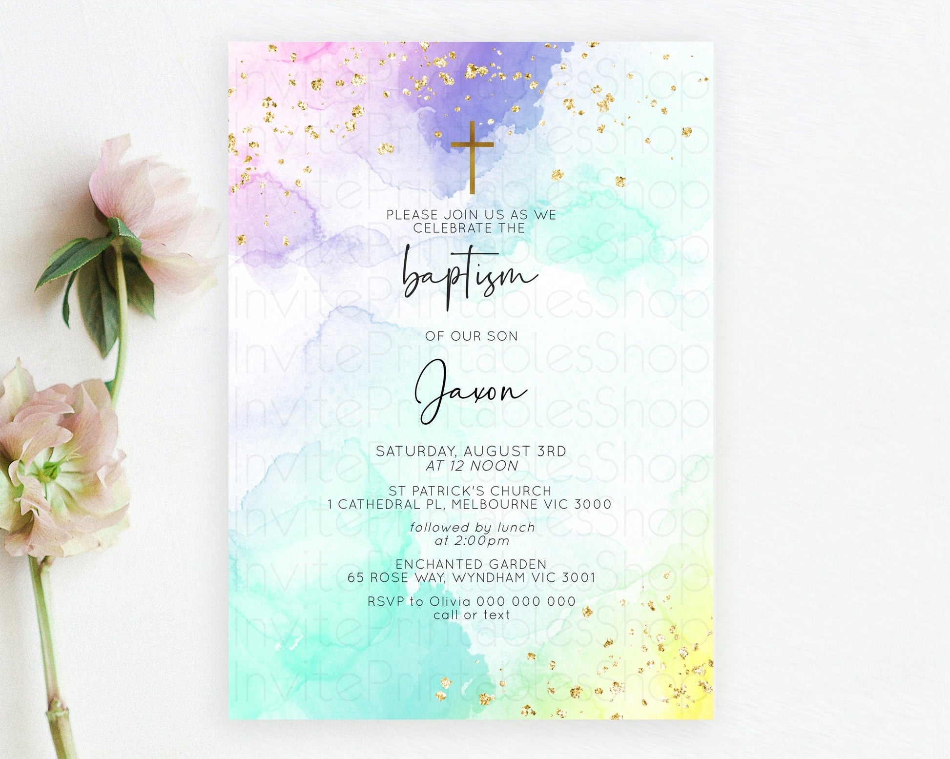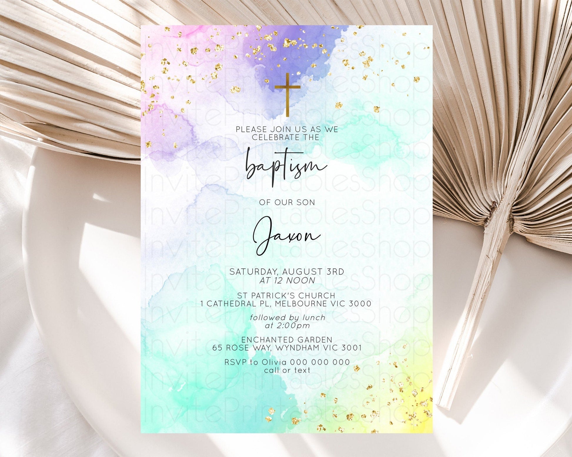 Pastel Baptism Invitation Pastel Colors Watercolor Baptism 1st Birthday Party Gold Ombre Pastel Rainbow Christening Holy Communion D10158