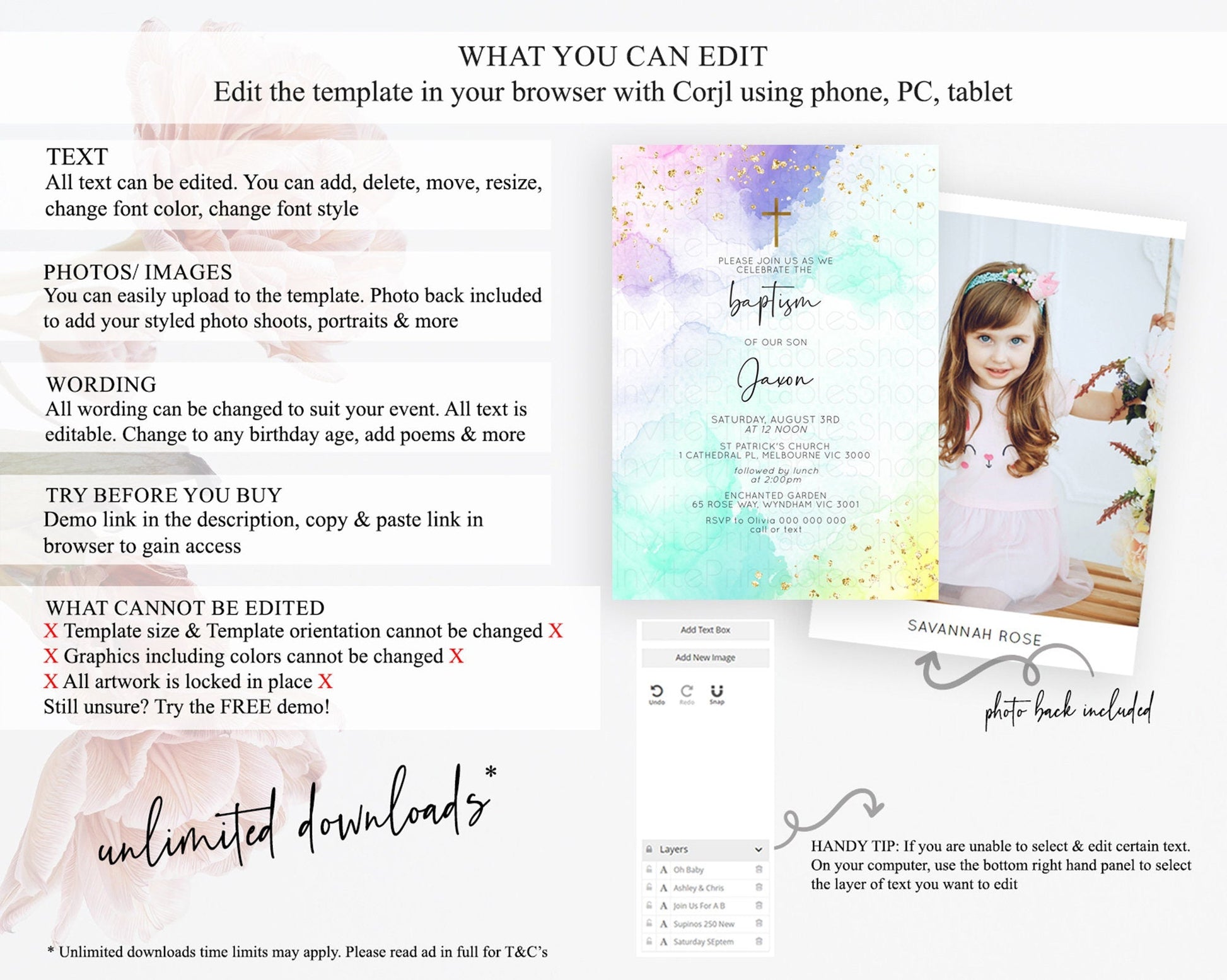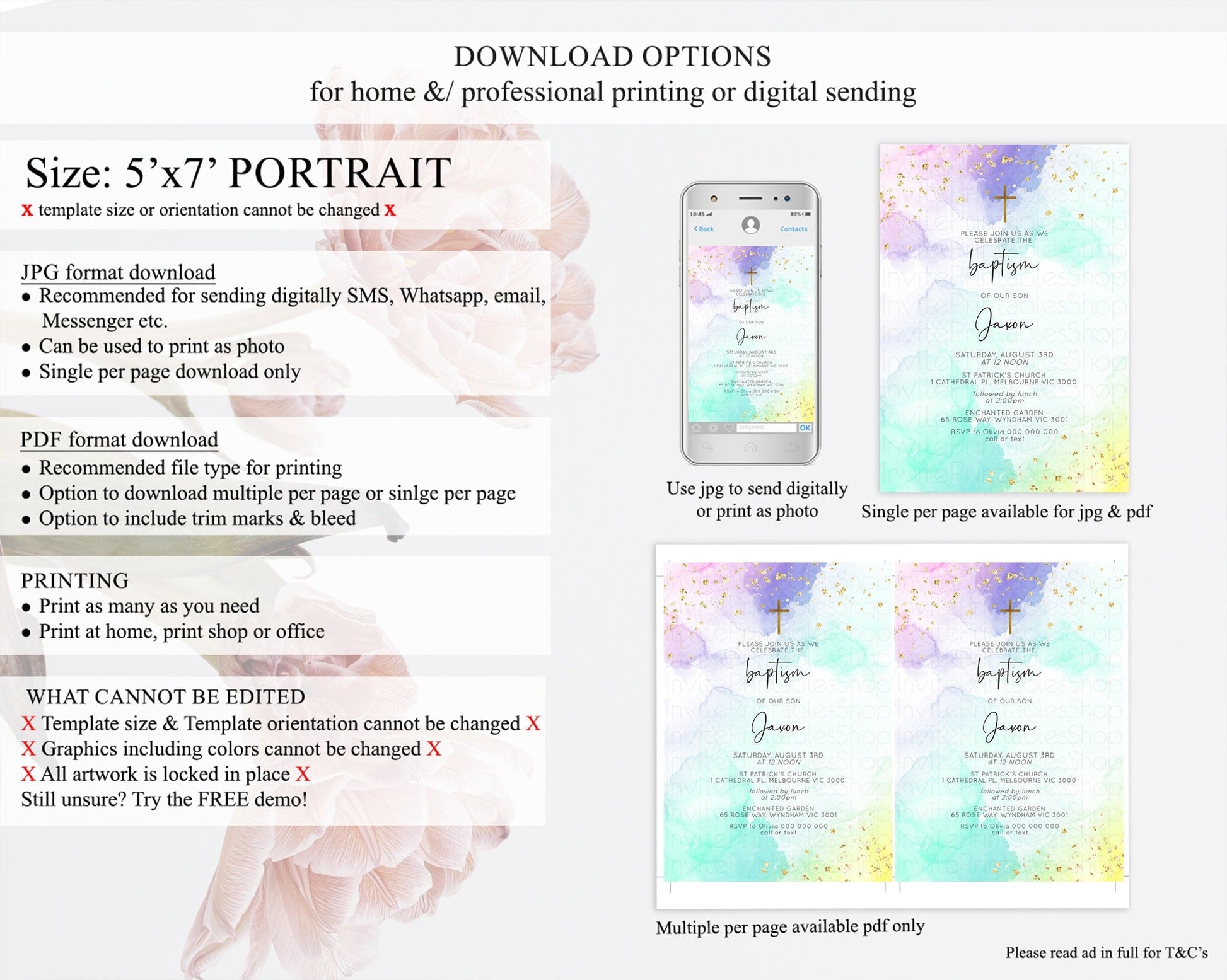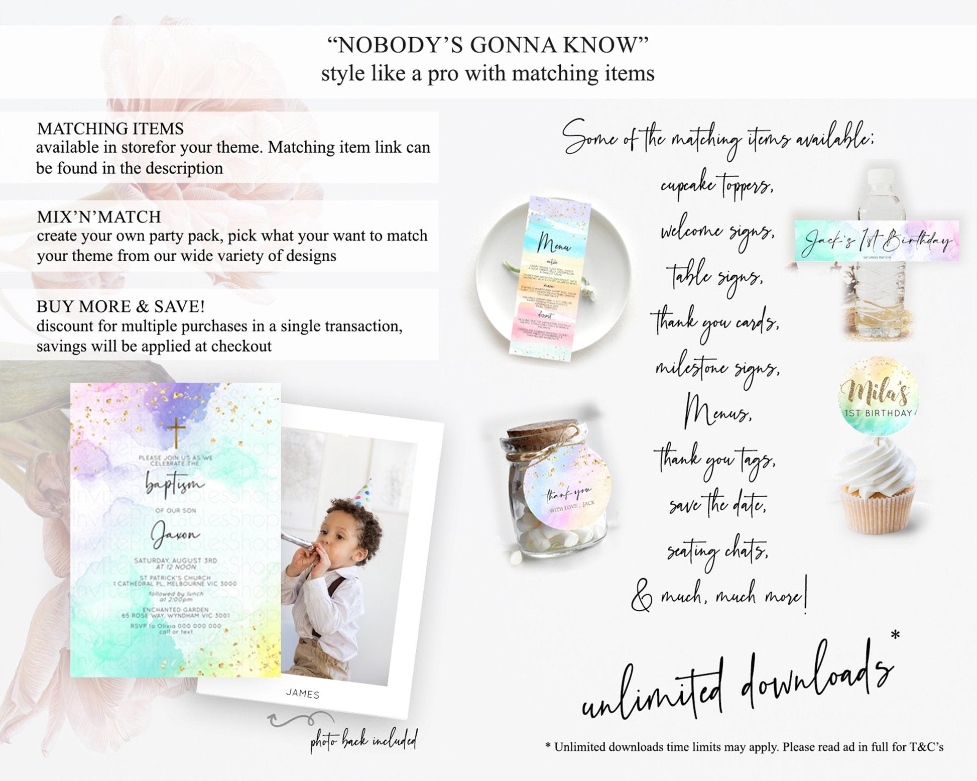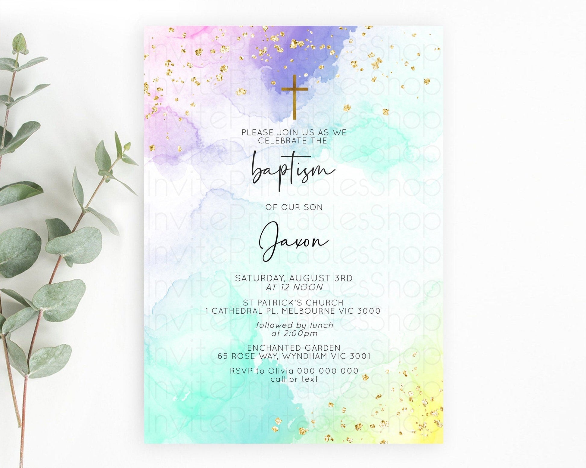 Pastel Baptism Invitation Pastel Colors Watercolor Baptism 1st Birthday Party Gold Ombre Pastel Rainbow Christening Holy Communion D10158