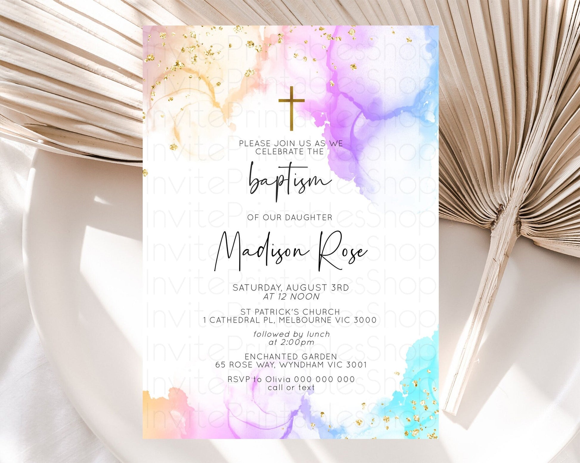Pastel Baptism Invitation Pastel Colors Watercolor Baptism 1st Birthday Party Gold Ombre Pastel Rainbow Christening Holy Communion D10180