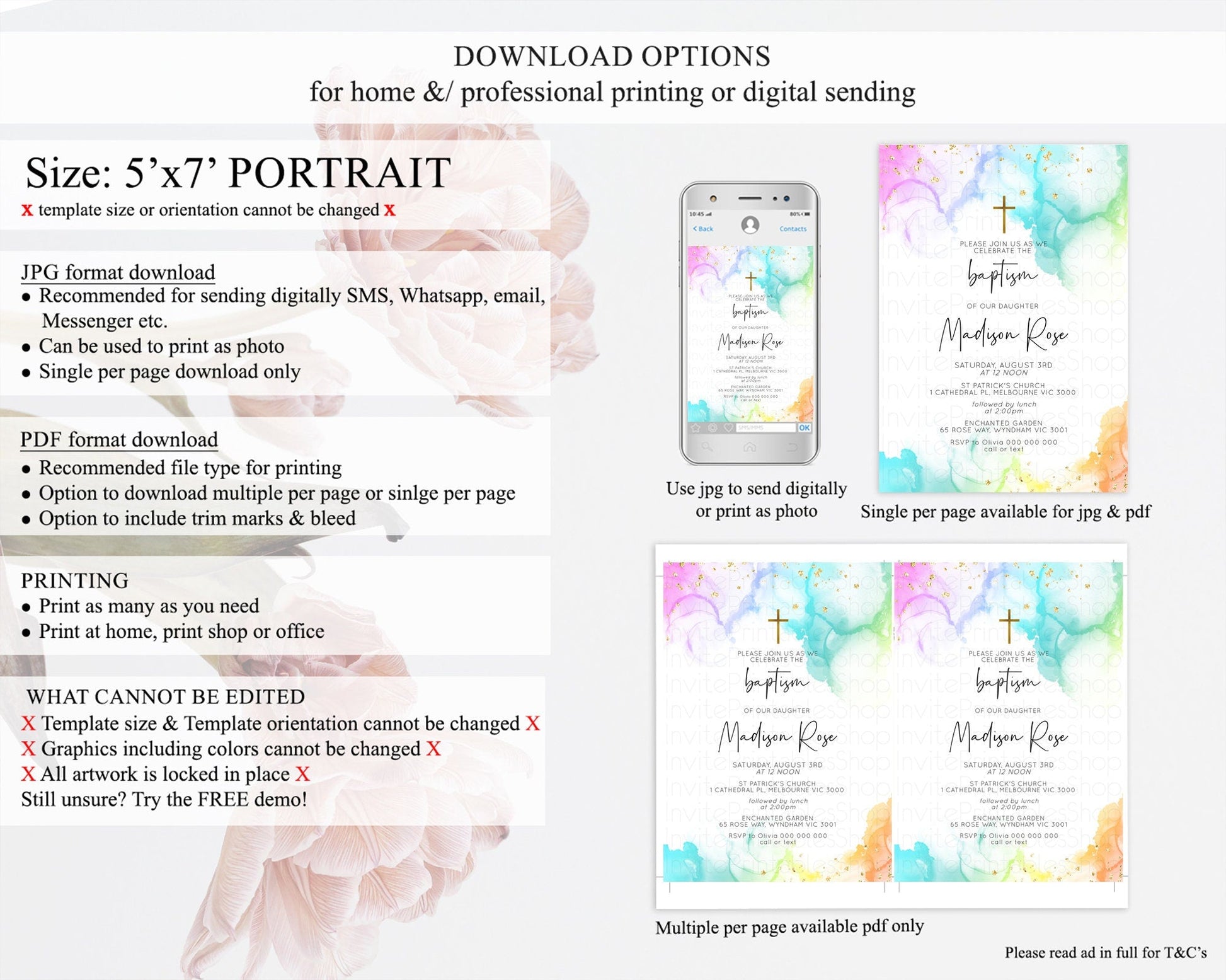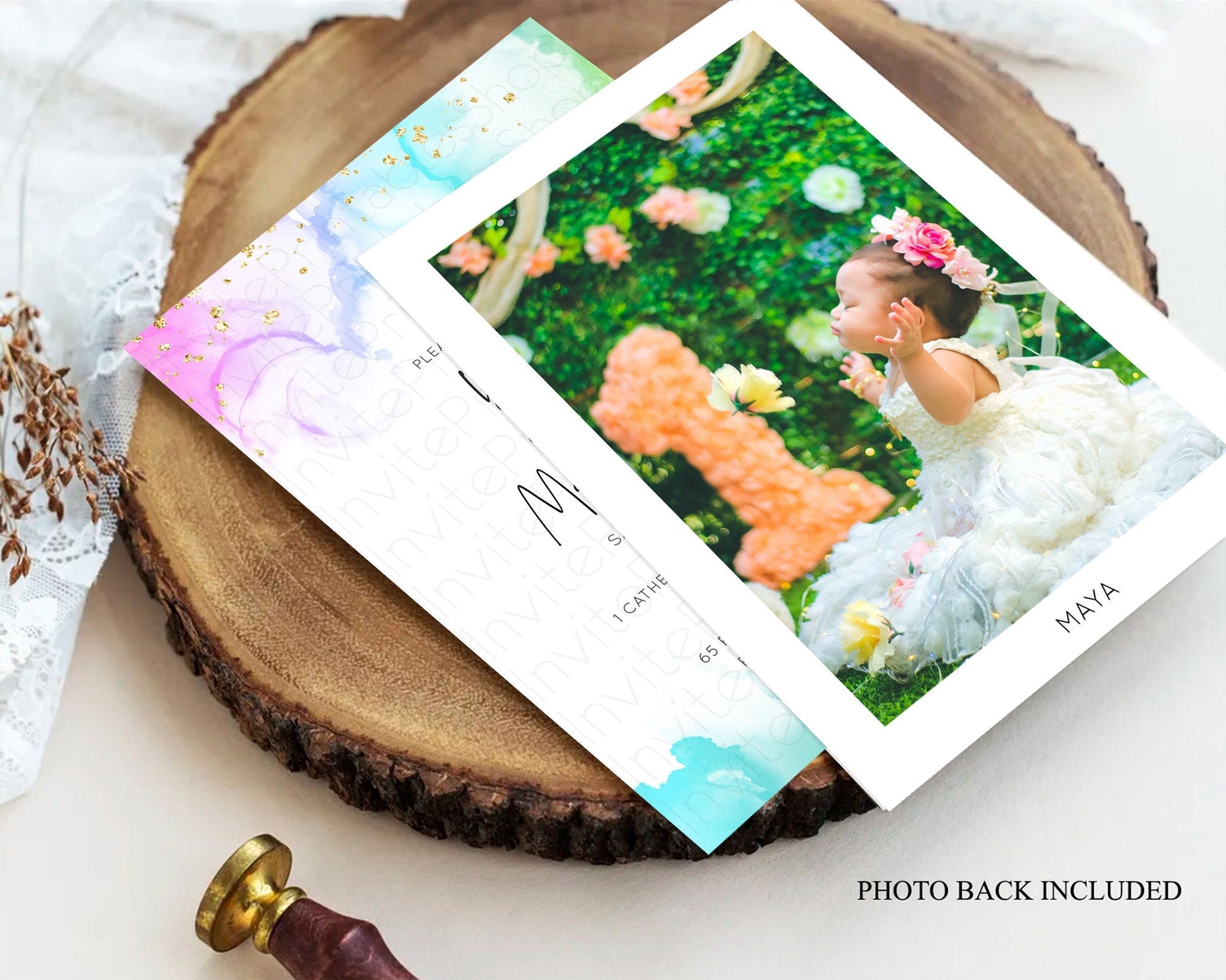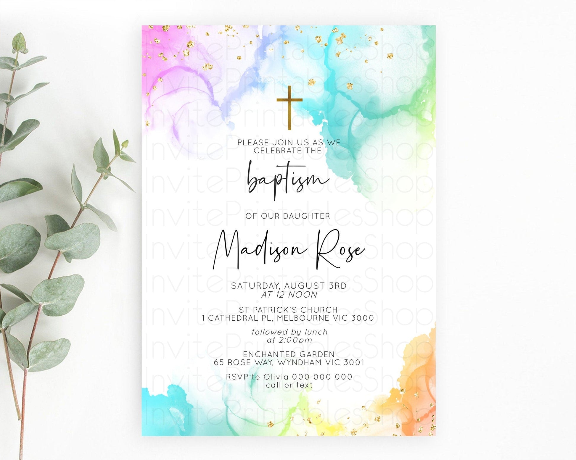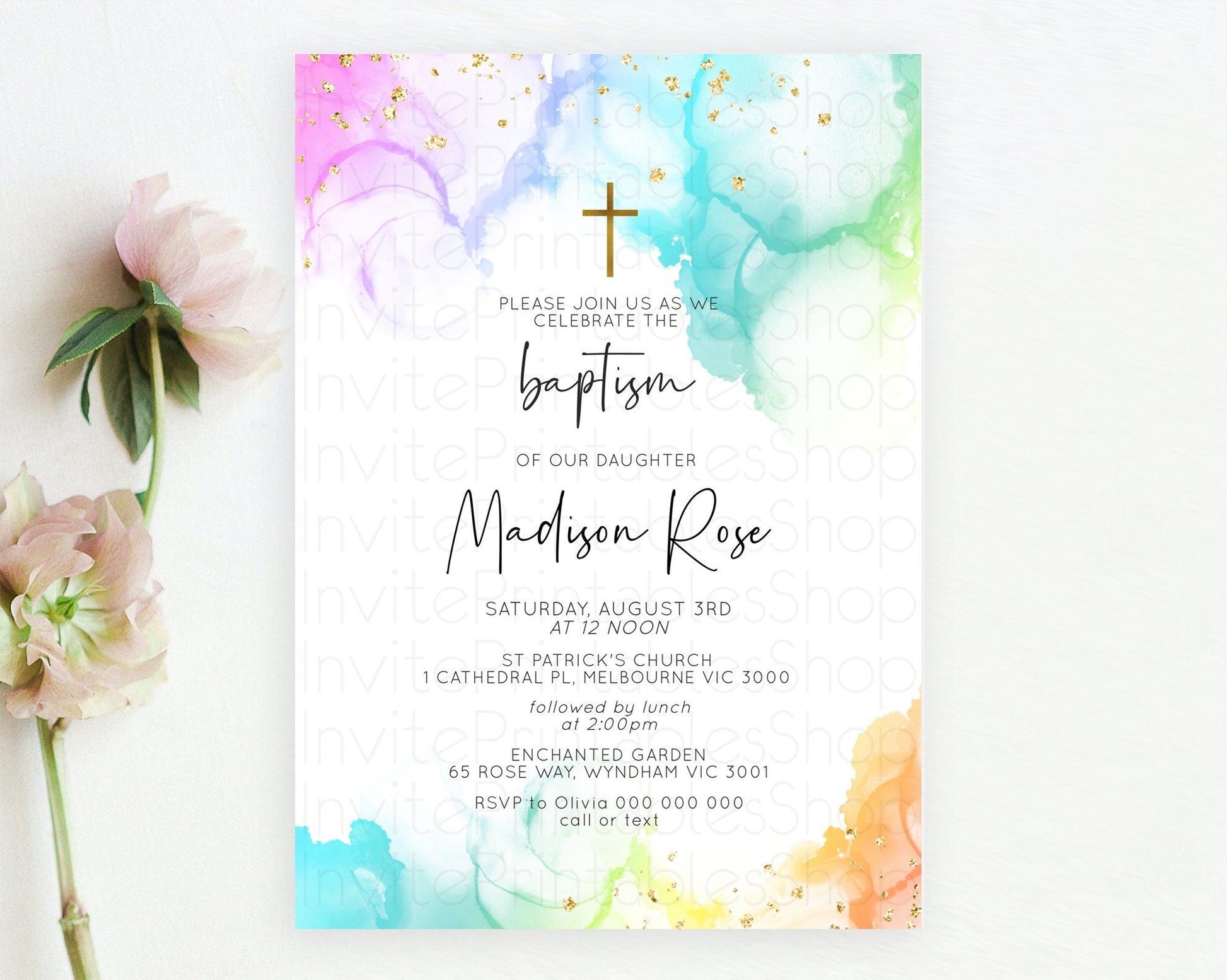 Pastel Baptism Invitation Pastel Colors Watercolor Baptism 1st Birthday Party Gold Ombre Pastel Rainbow Christening Holy Communion D10181