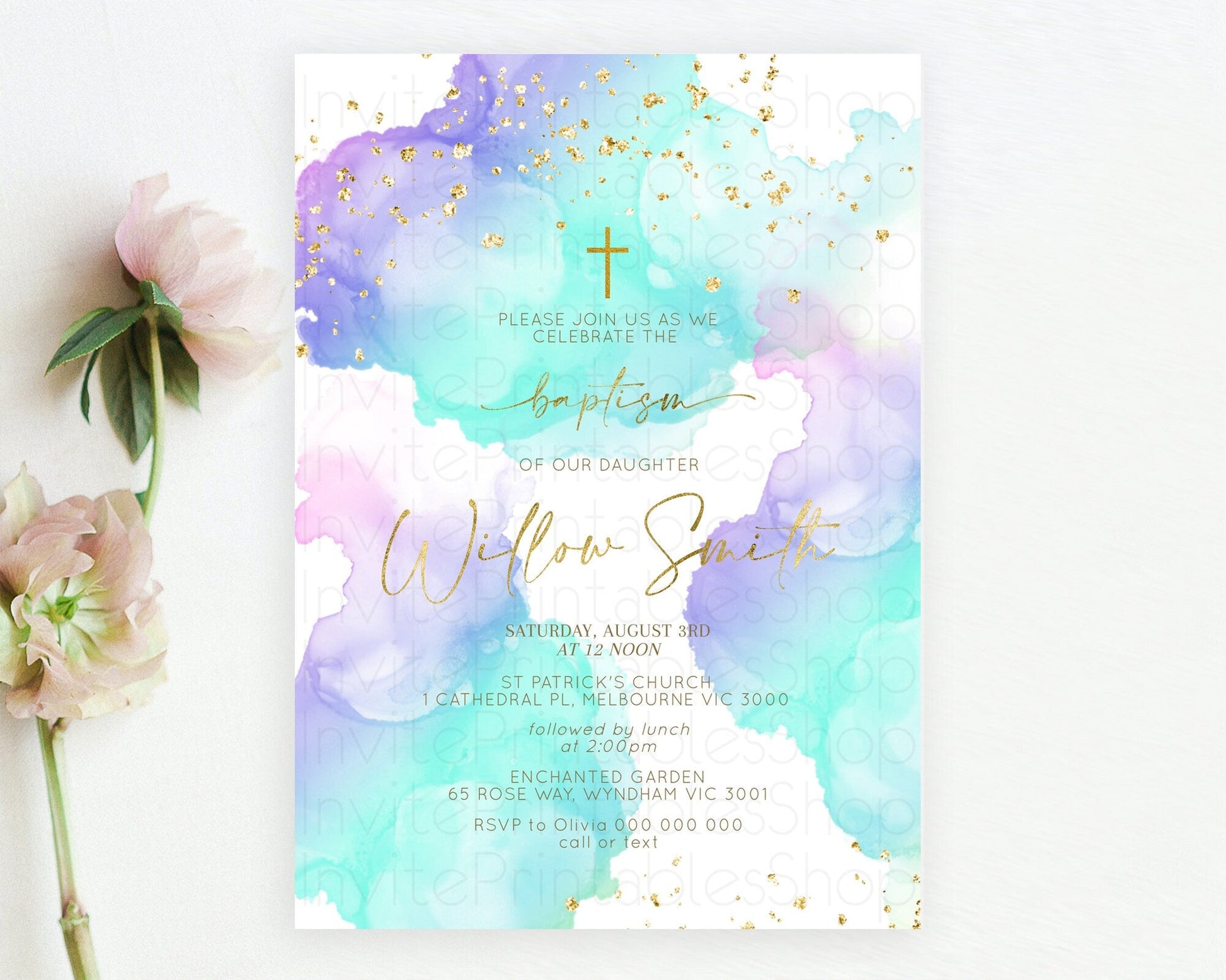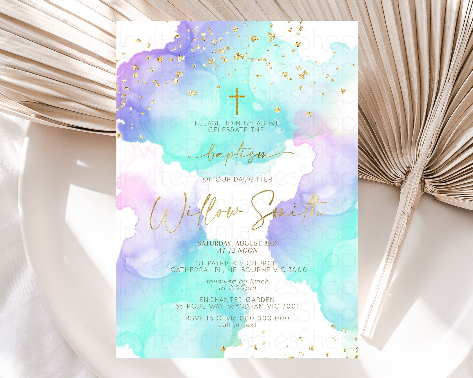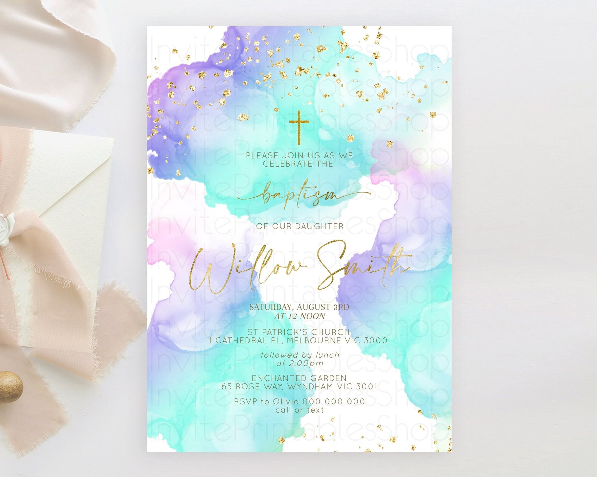 Pastel Baptism Invitation Pastel Colors Watercolor Baptism 1st Birthday Party Gold Ombre Pastel Rainbow Christening Holy Communion D10212