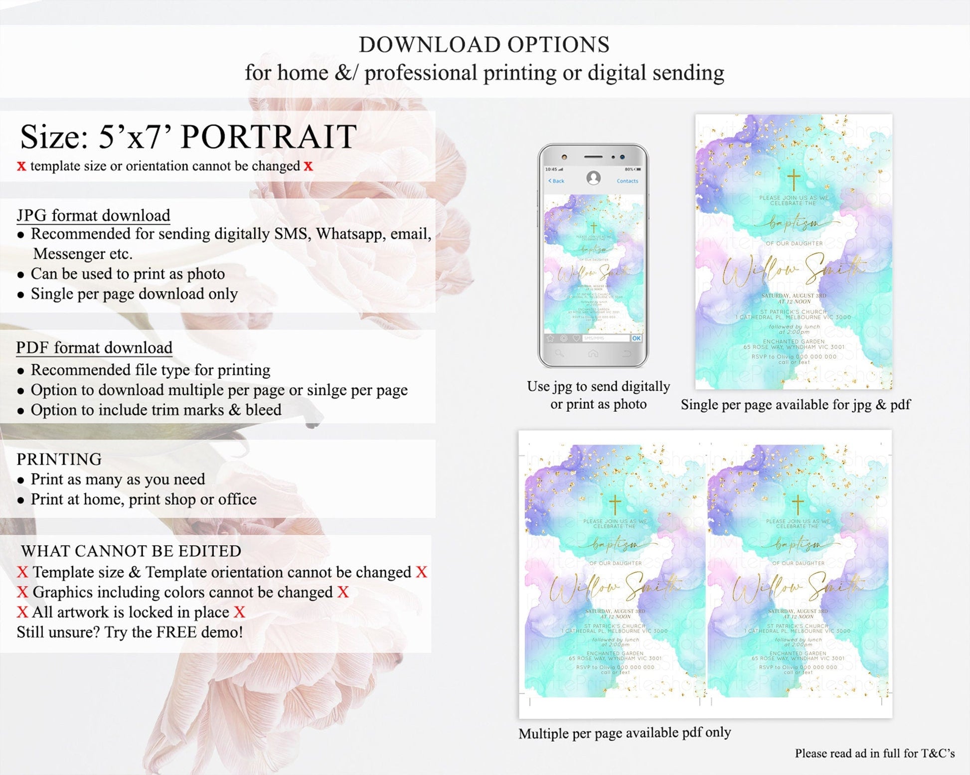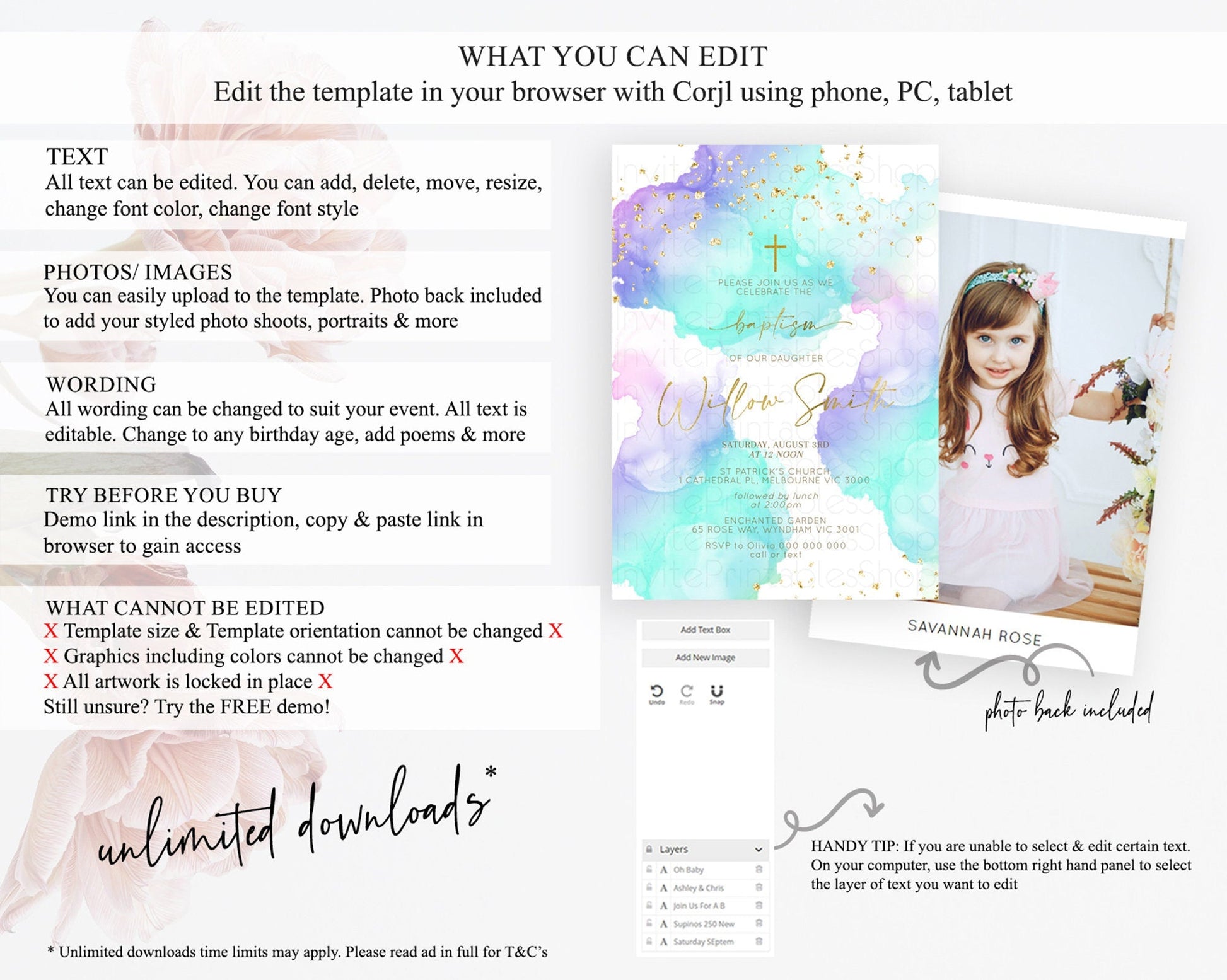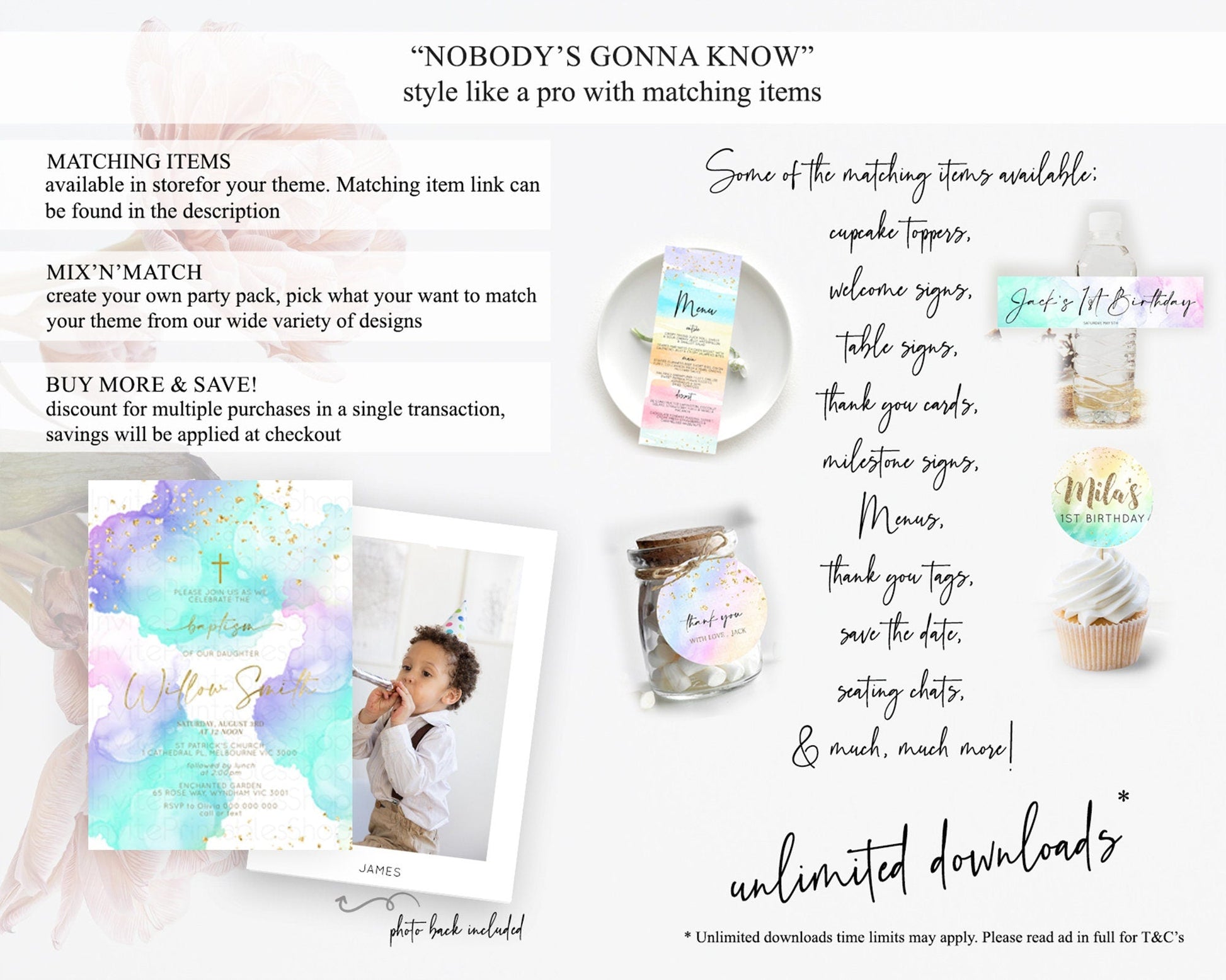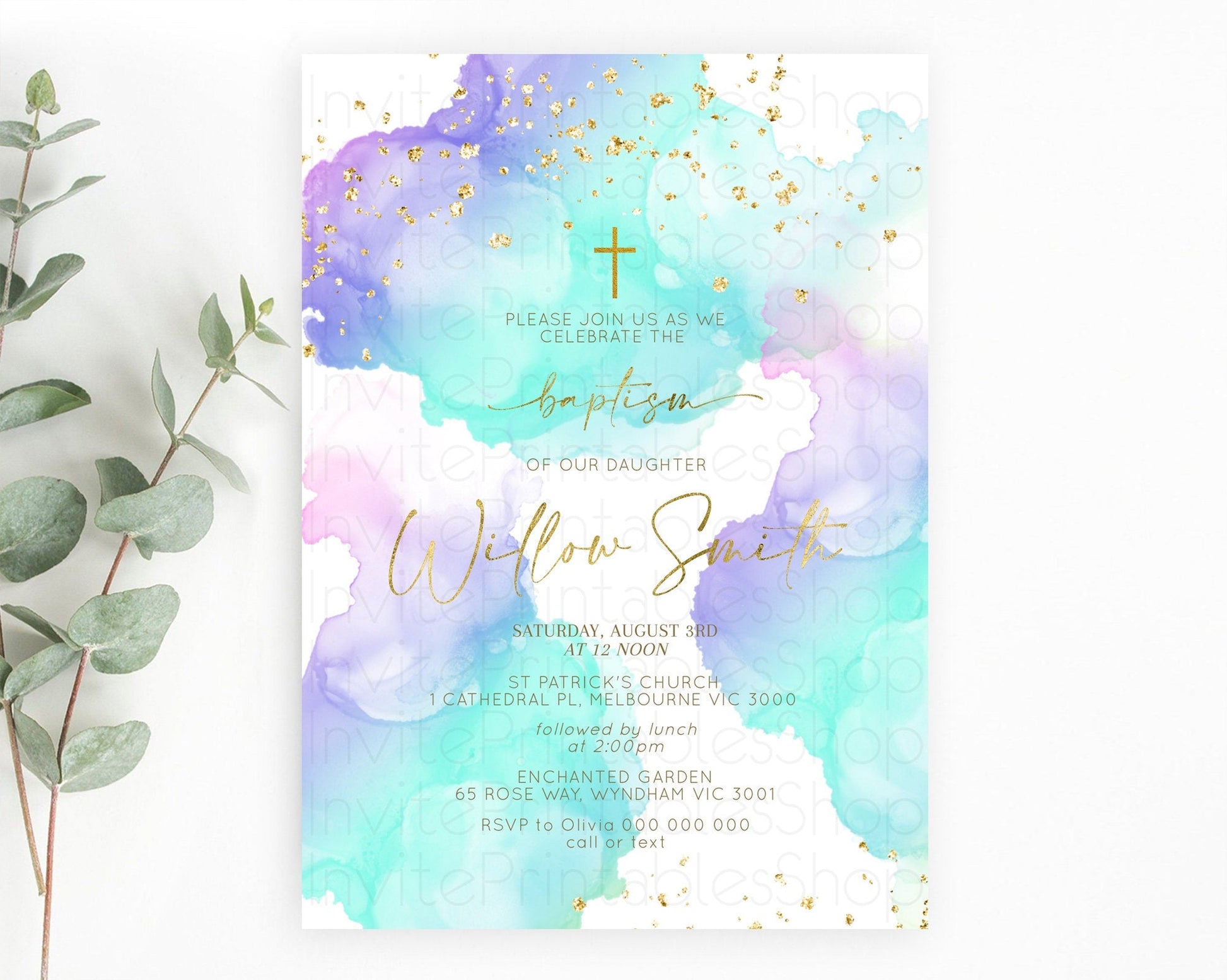 Pastel Baptism Invitation Pastel Colors Watercolor Baptism 1st Birthday Party Gold Ombre Pastel Rainbow Christening Holy Communion D10212