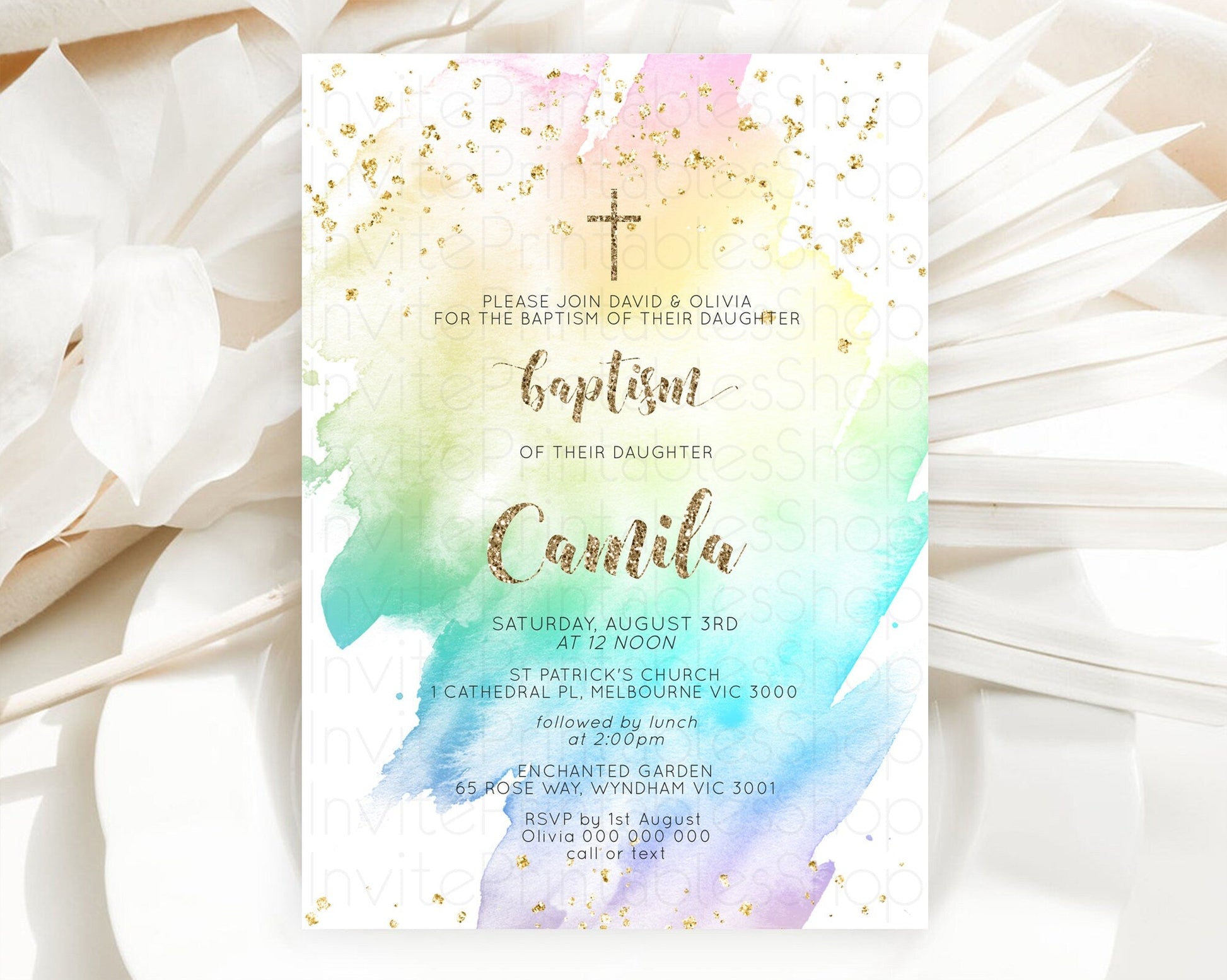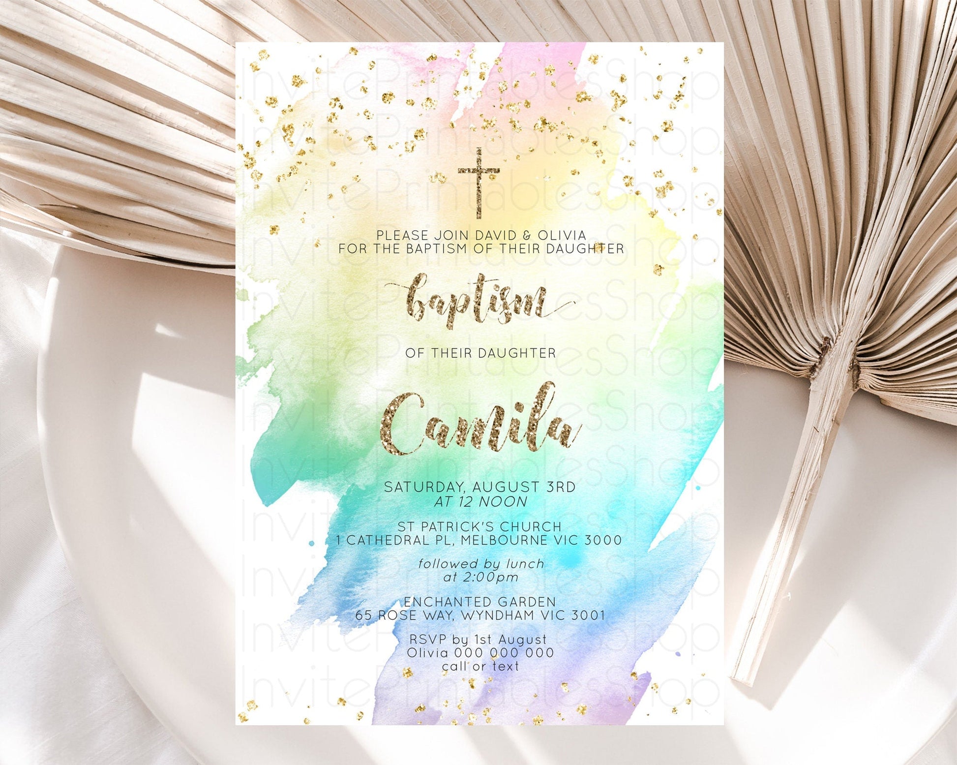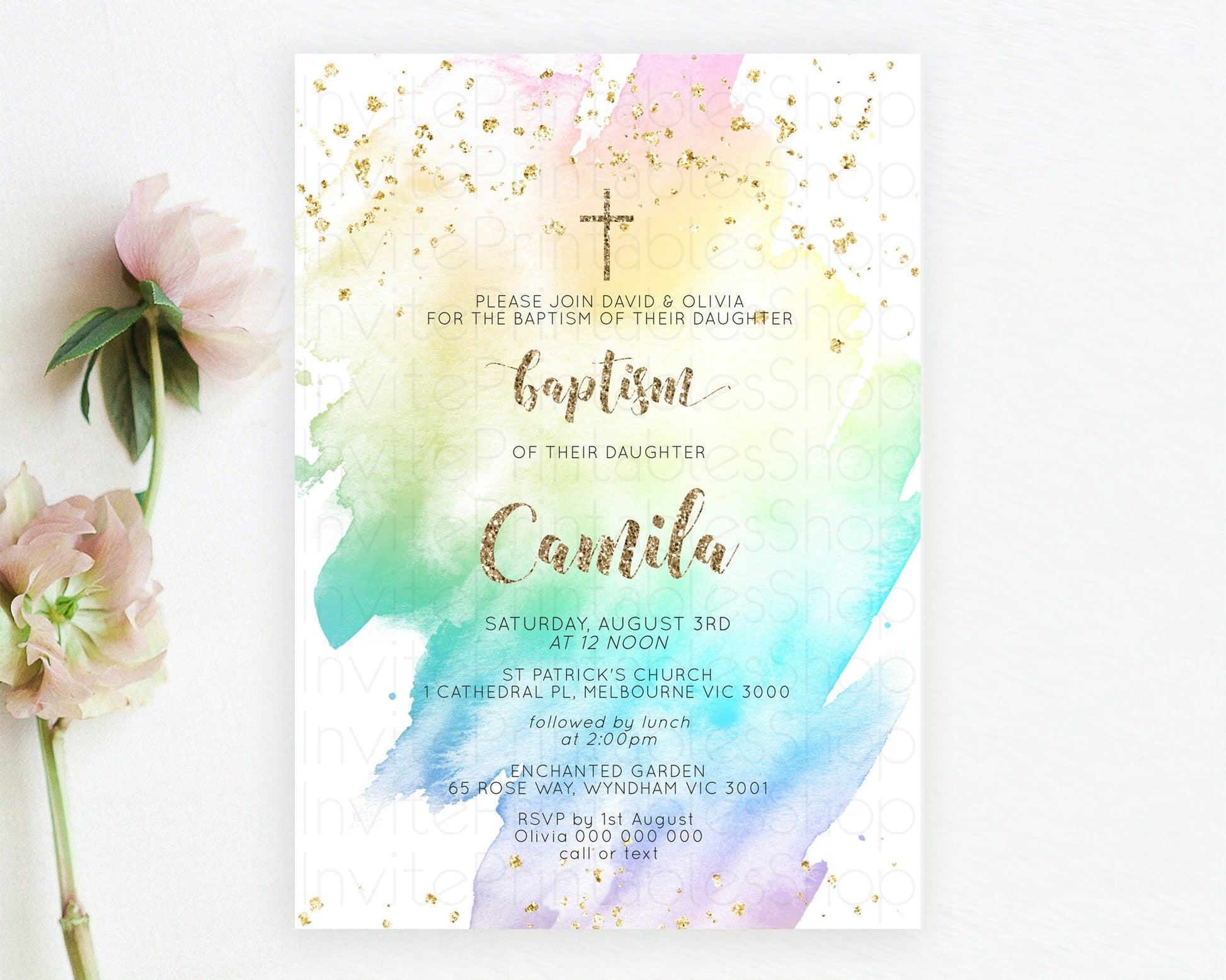 Pastel Baptism Invitation Pastel Colors Watercolor Baptism 1st Birthday Party Gold Ombre Pastel Rainbow Christening Holy Communion D10259