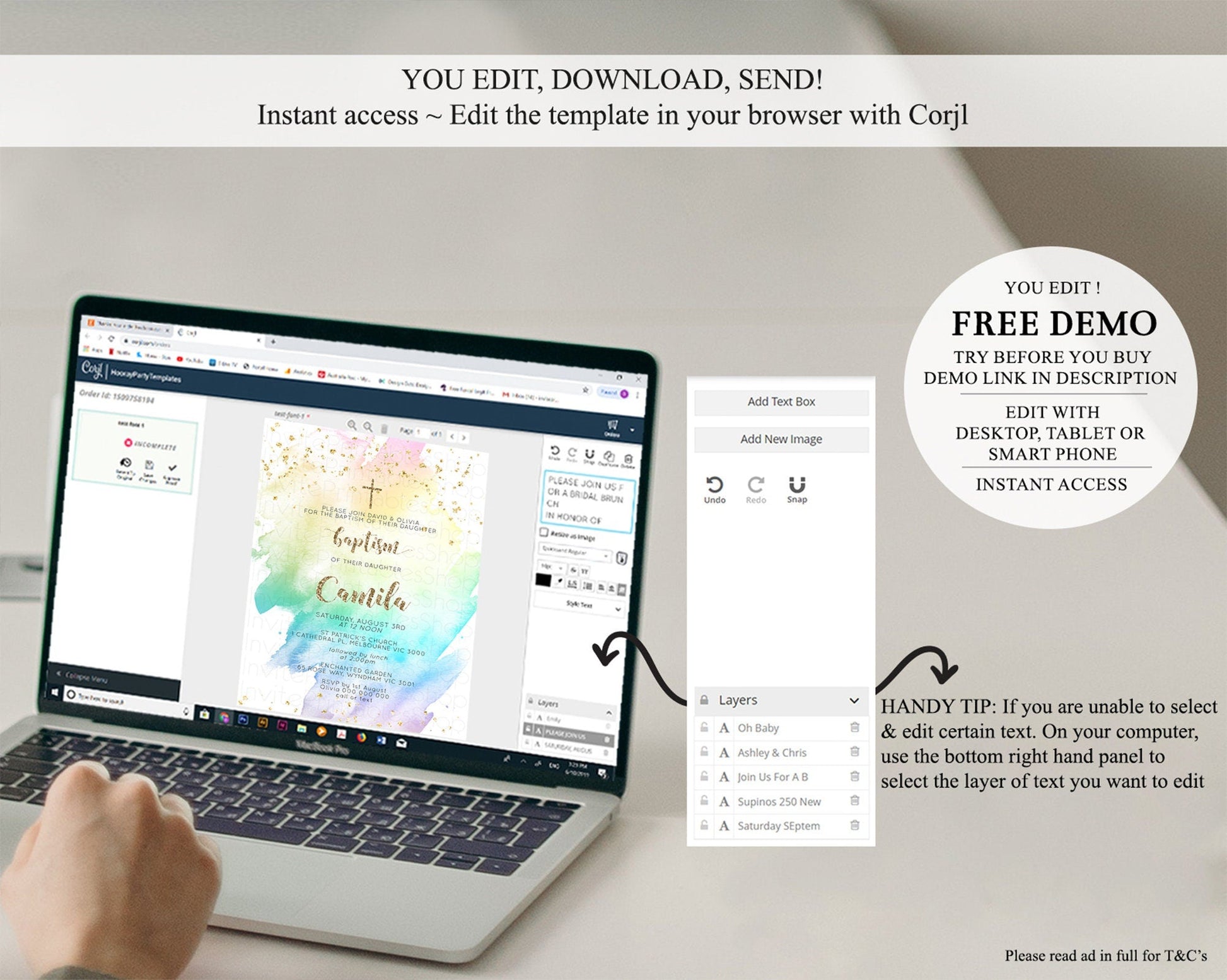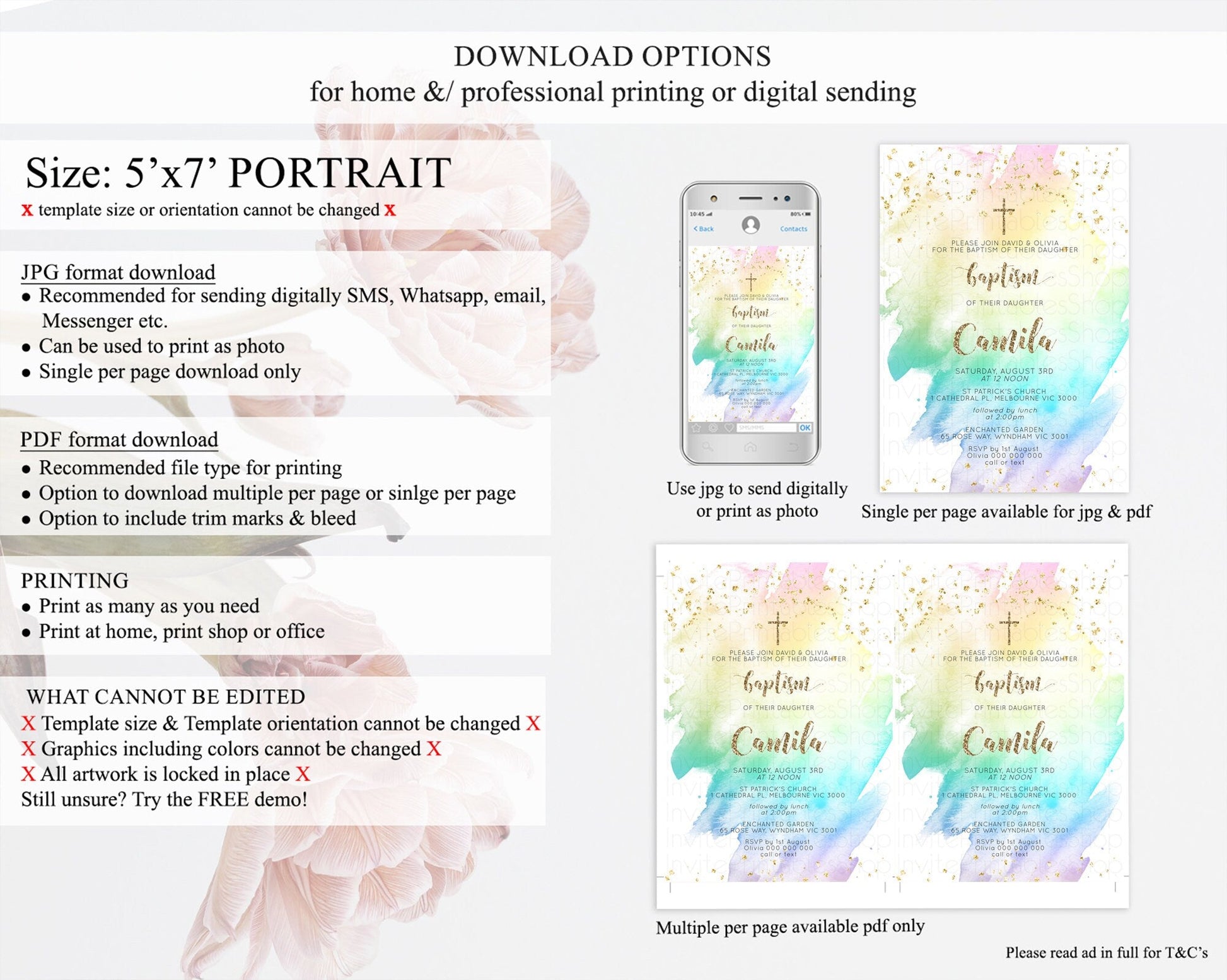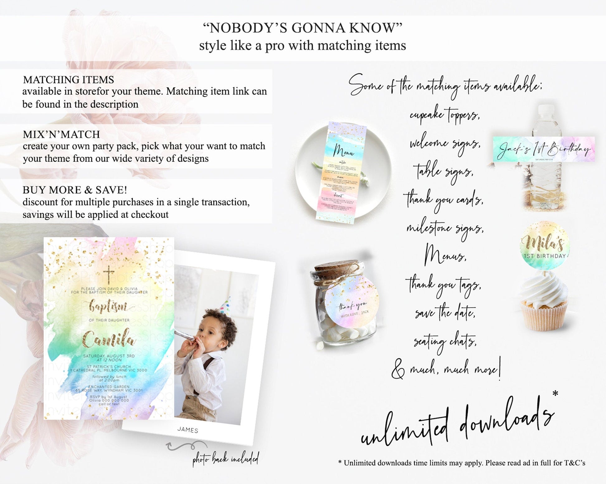 Pastel Baptism Invitation Pastel Colors Watercolor Baptism 1st Birthday Party Gold Ombre Pastel Rainbow Christening Holy Communion D10259