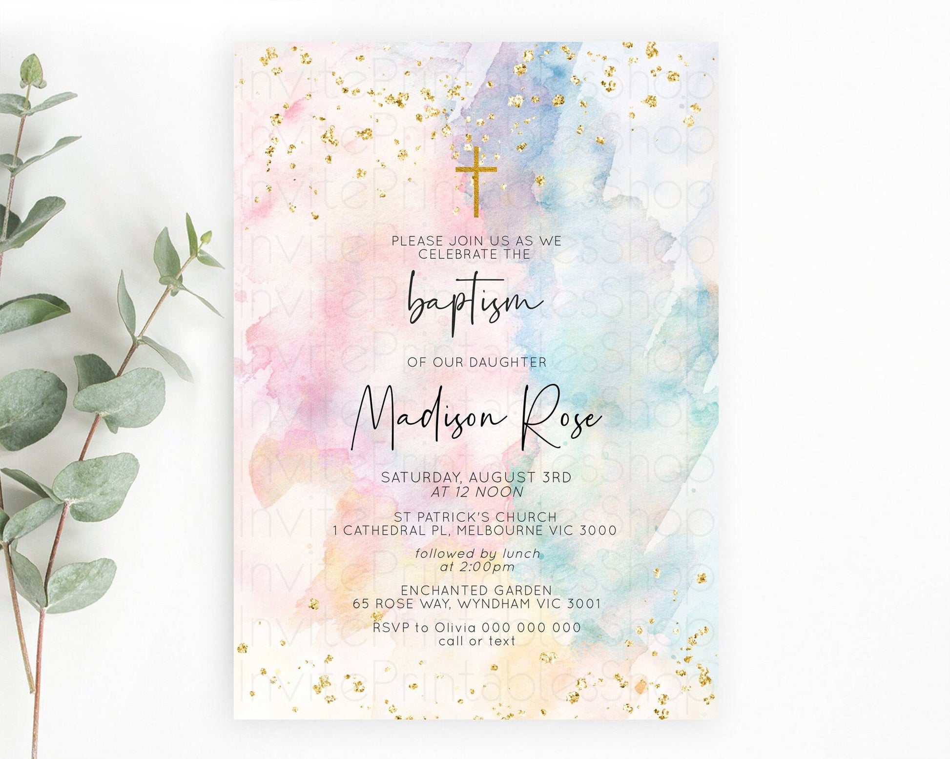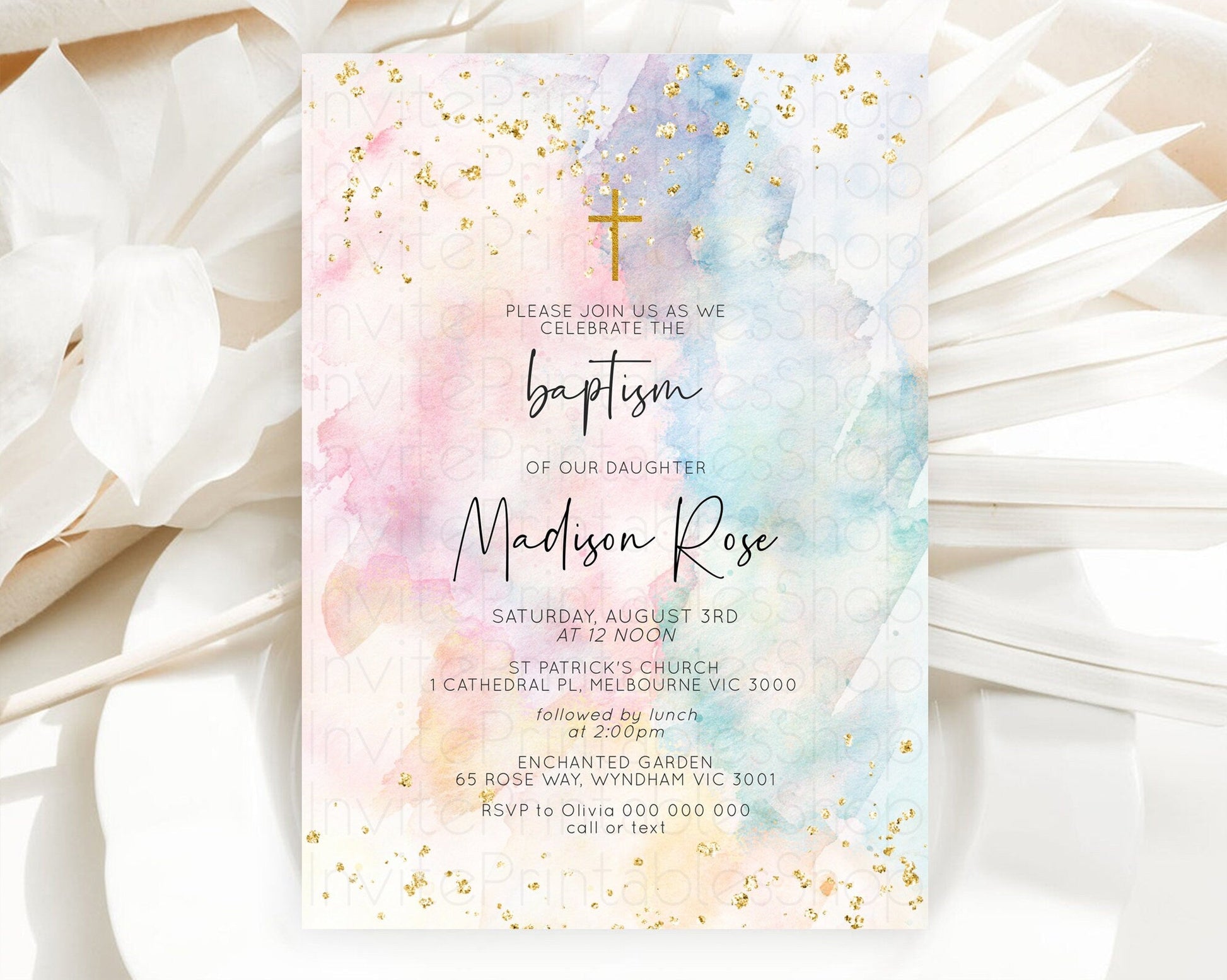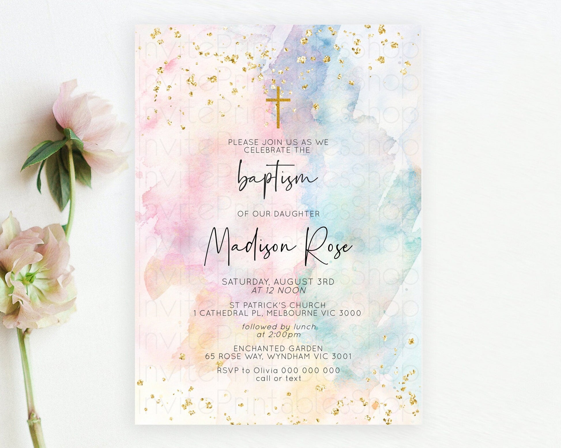 Pastel Baptism Invitation Pastel Colors Watercolor Baptism 1st Birthday Party Gold Ombre Pastel Rainbow Christening Holy Communion D10263