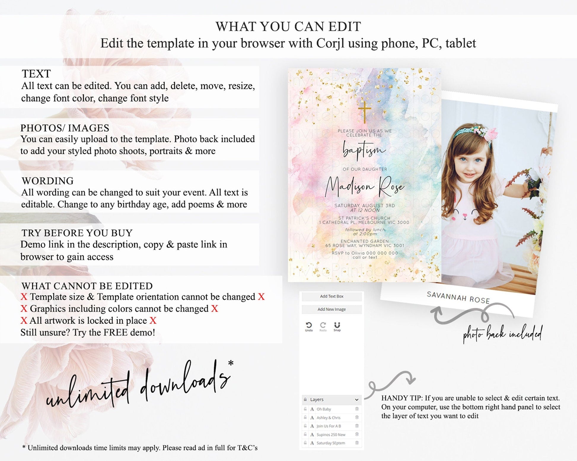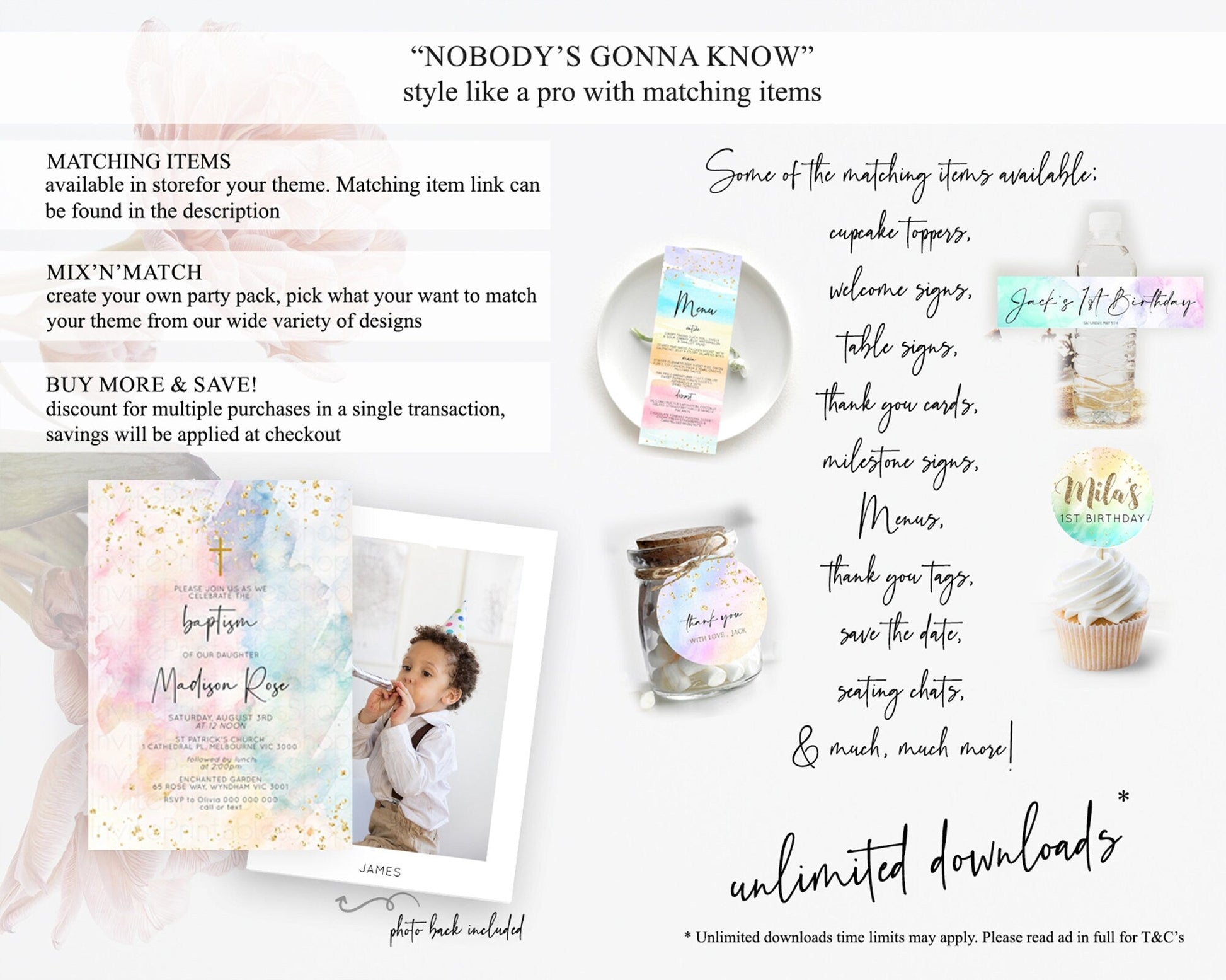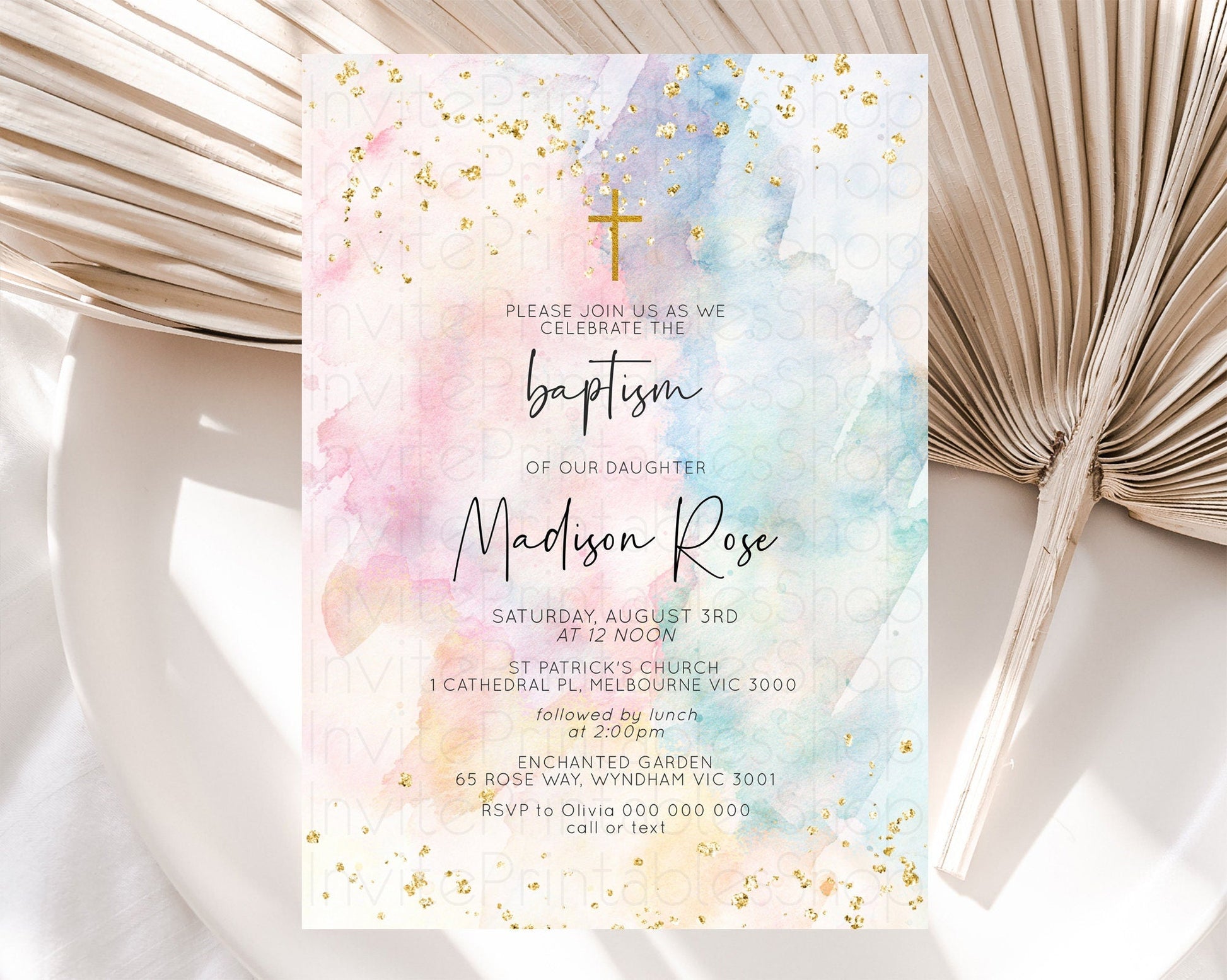 Pastel Baptism Invitation Pastel Colors Watercolor Baptism 1st Birthday Party Gold Ombre Pastel Rainbow Christening Holy Communion D10263