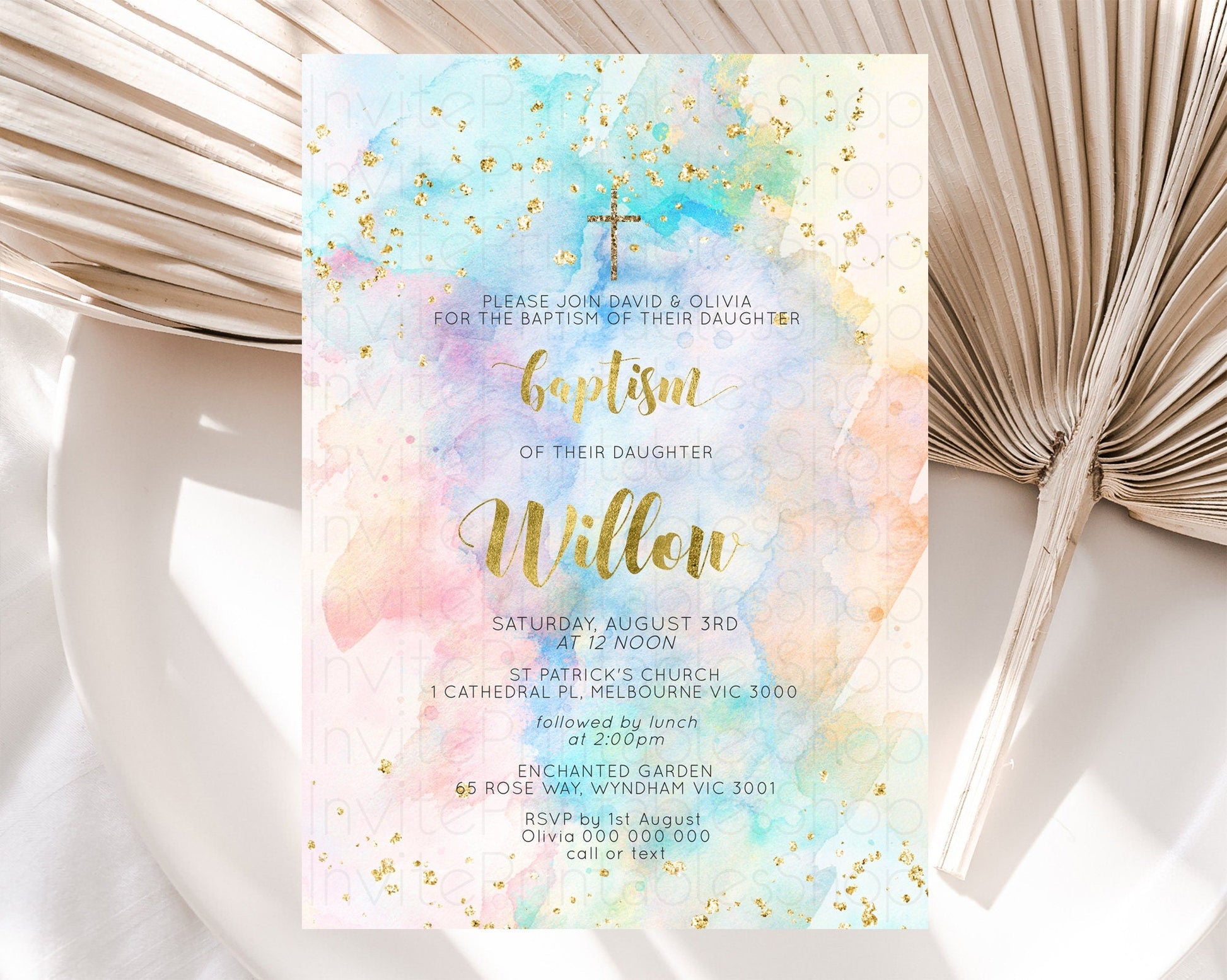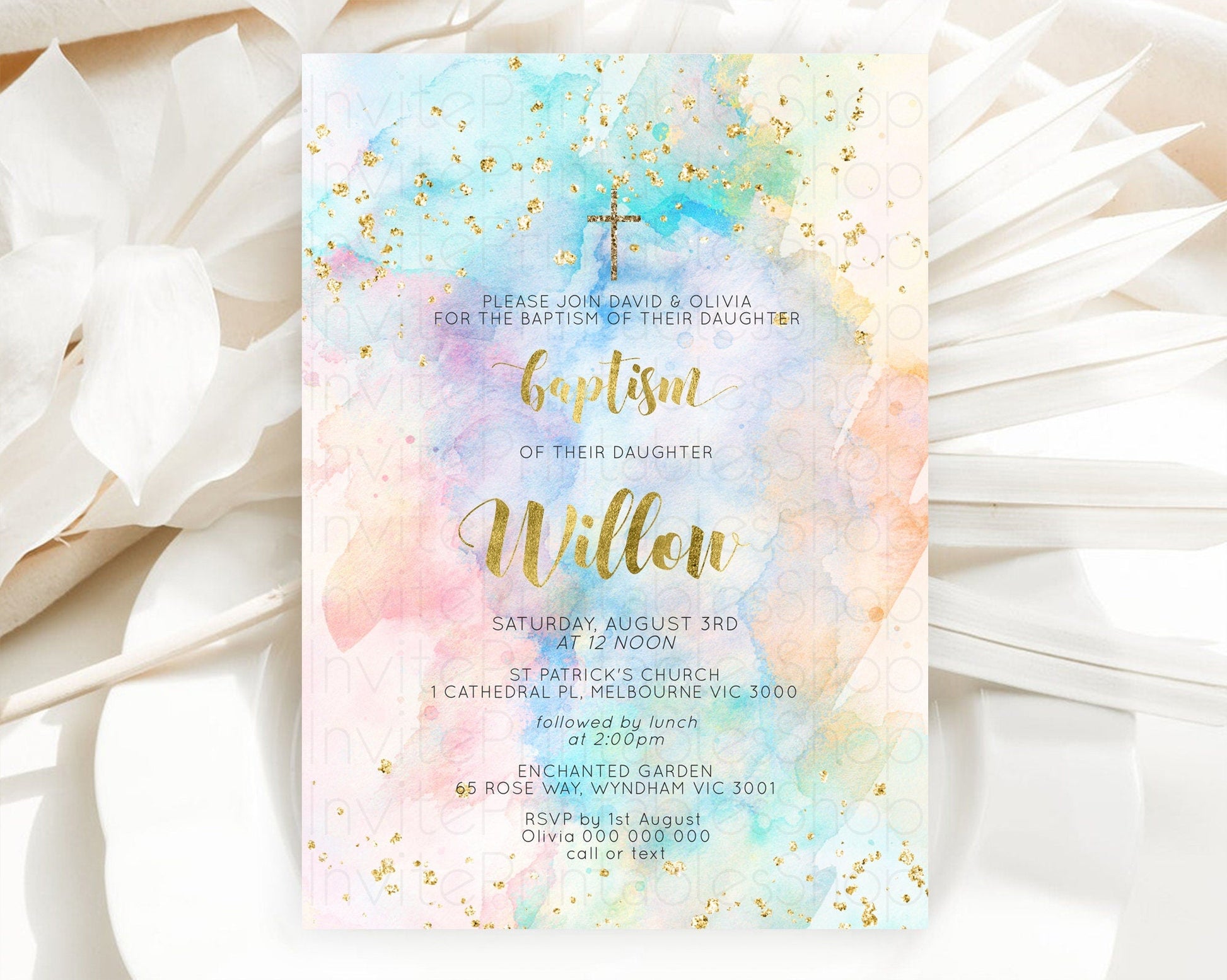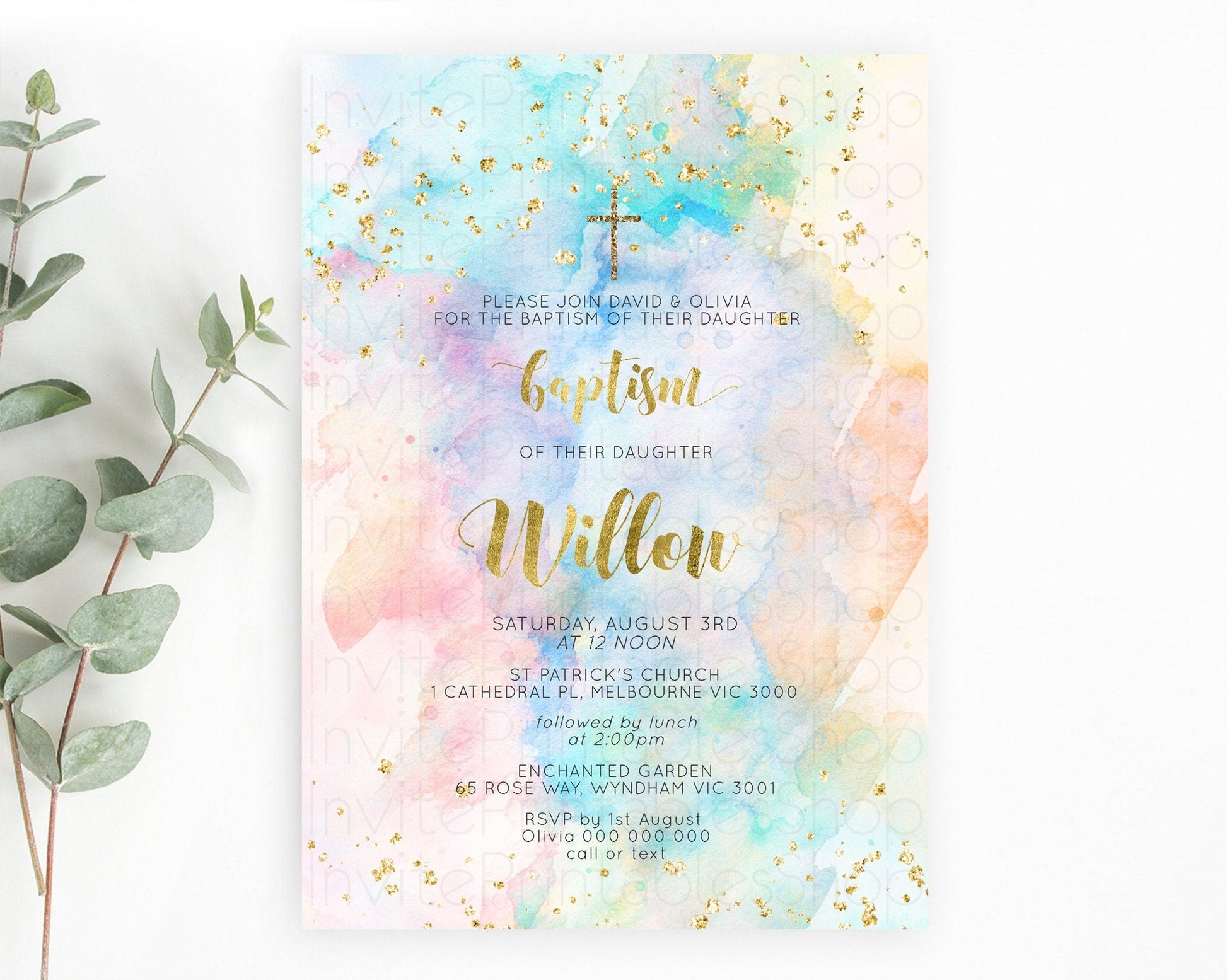 Pastel Baptism Invitation Pastel Colors Watercolor Baptism 1st Birthday Party Gold Ombre Pastel Rainbow Christening Holy Communion D10272