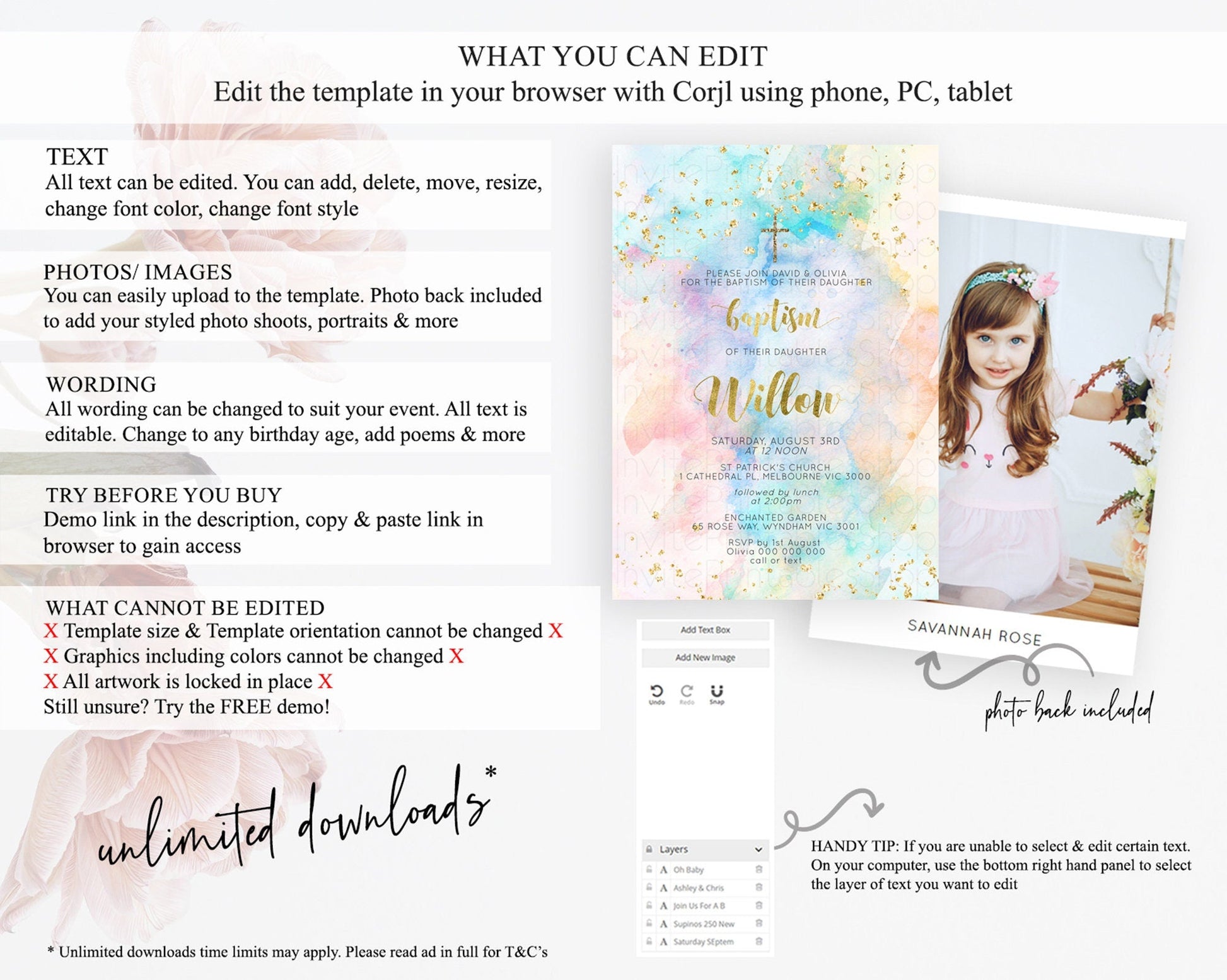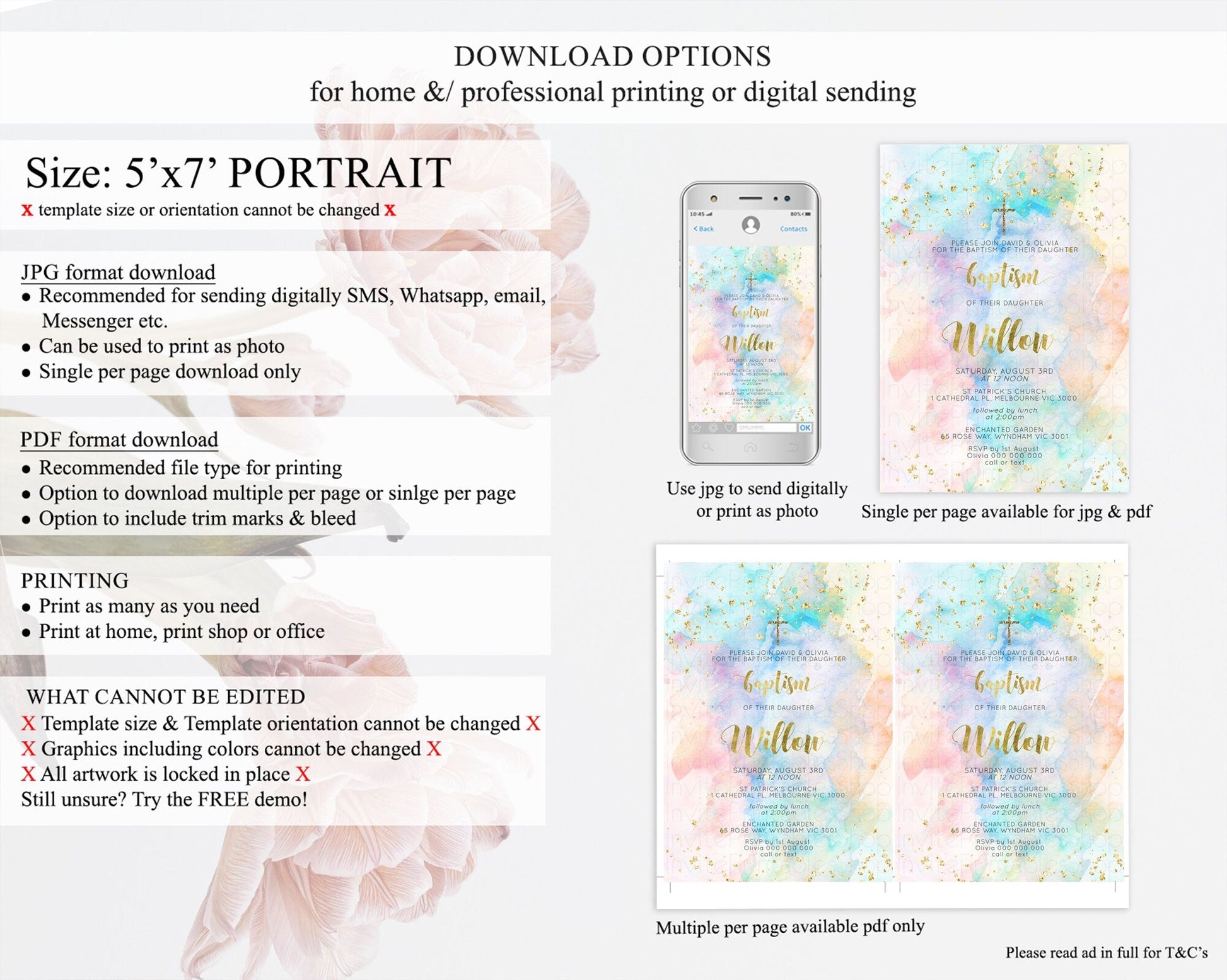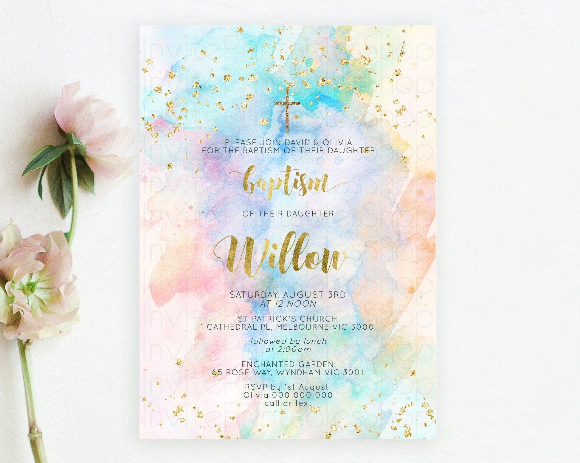 Pastel Baptism Invitation Pastel Colors Watercolor Baptism 1st Birthday Party Gold Ombre Pastel Rainbow Christening Holy Communion D10272