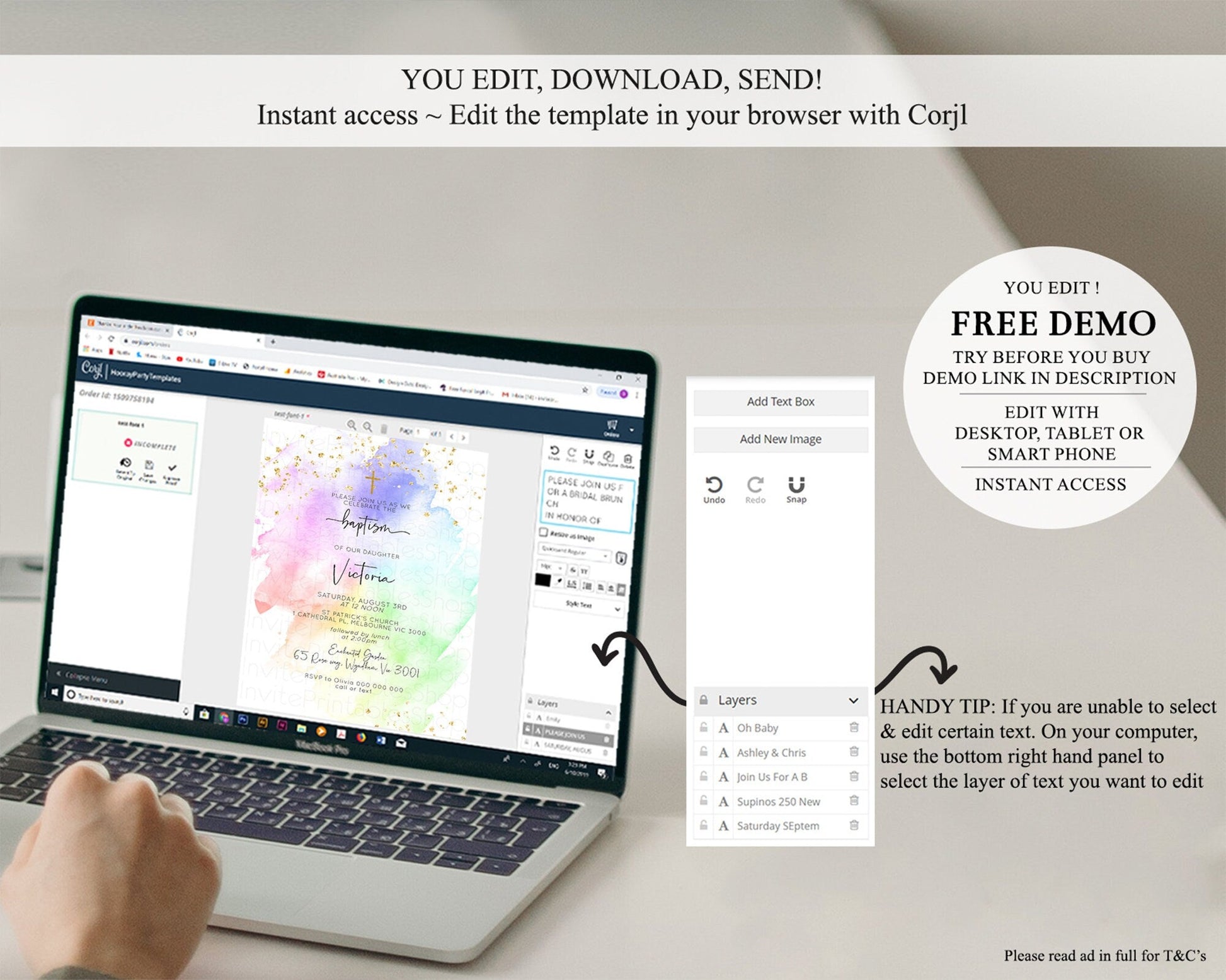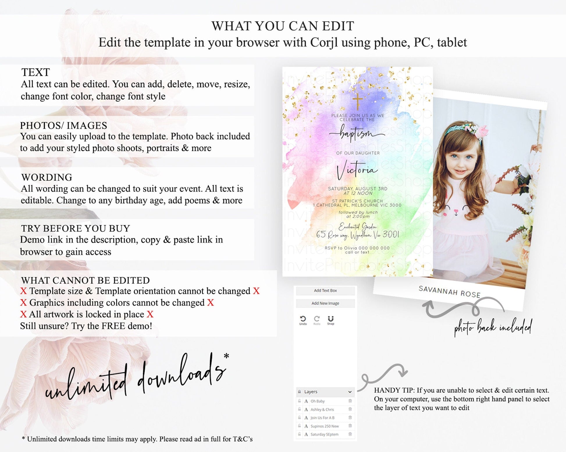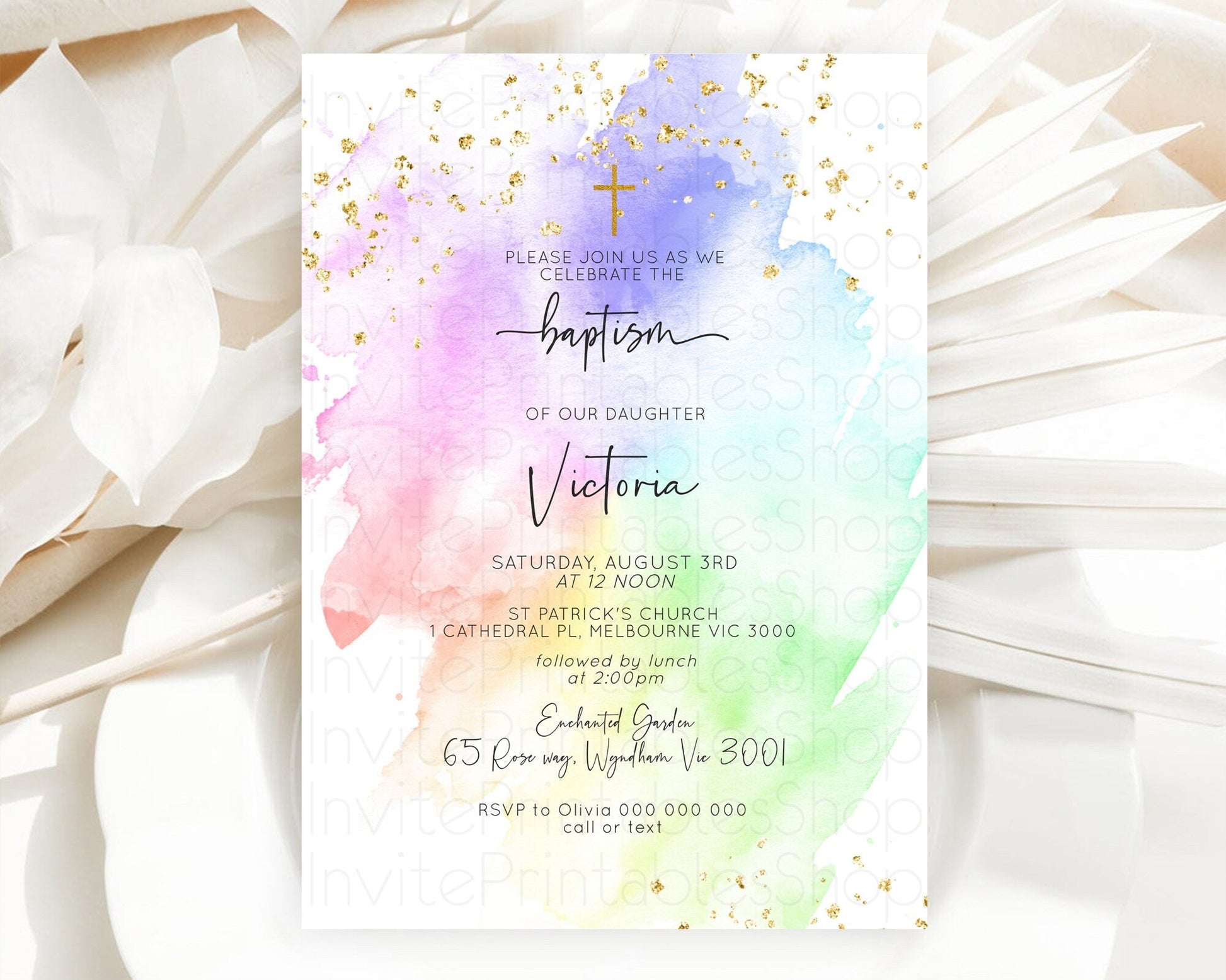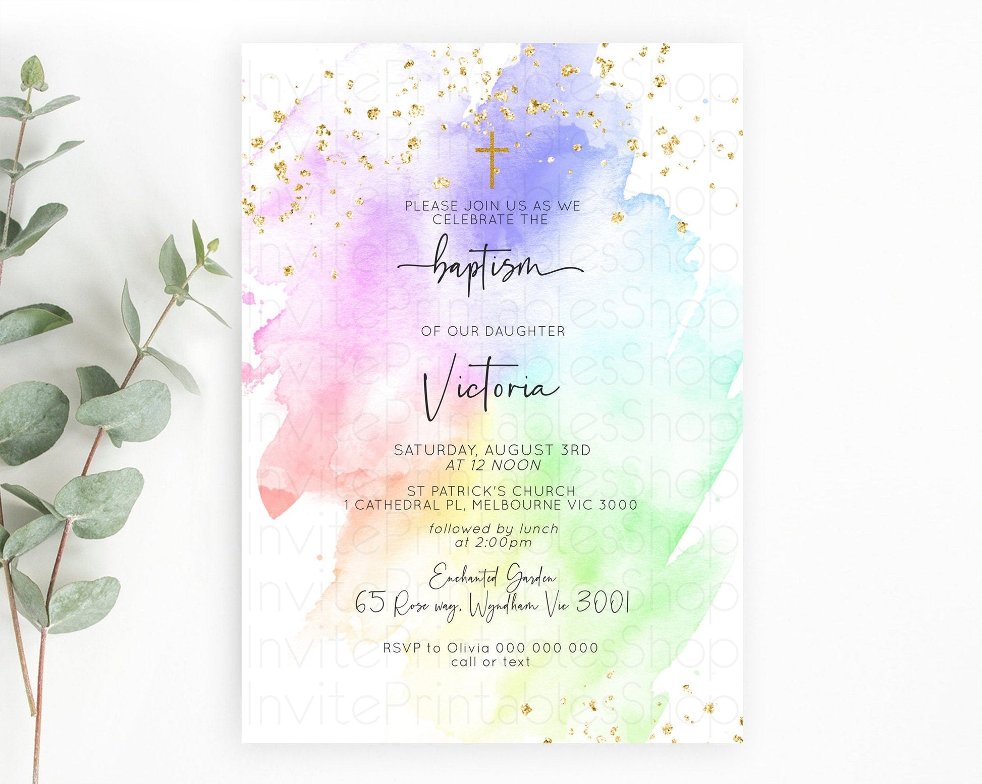 Pastel Baptism Invitation Pastel Colors Watercolor Baptism 1st Birthday Party Gold Ombre Pastel Rainbow Christening Holy Communion D10316