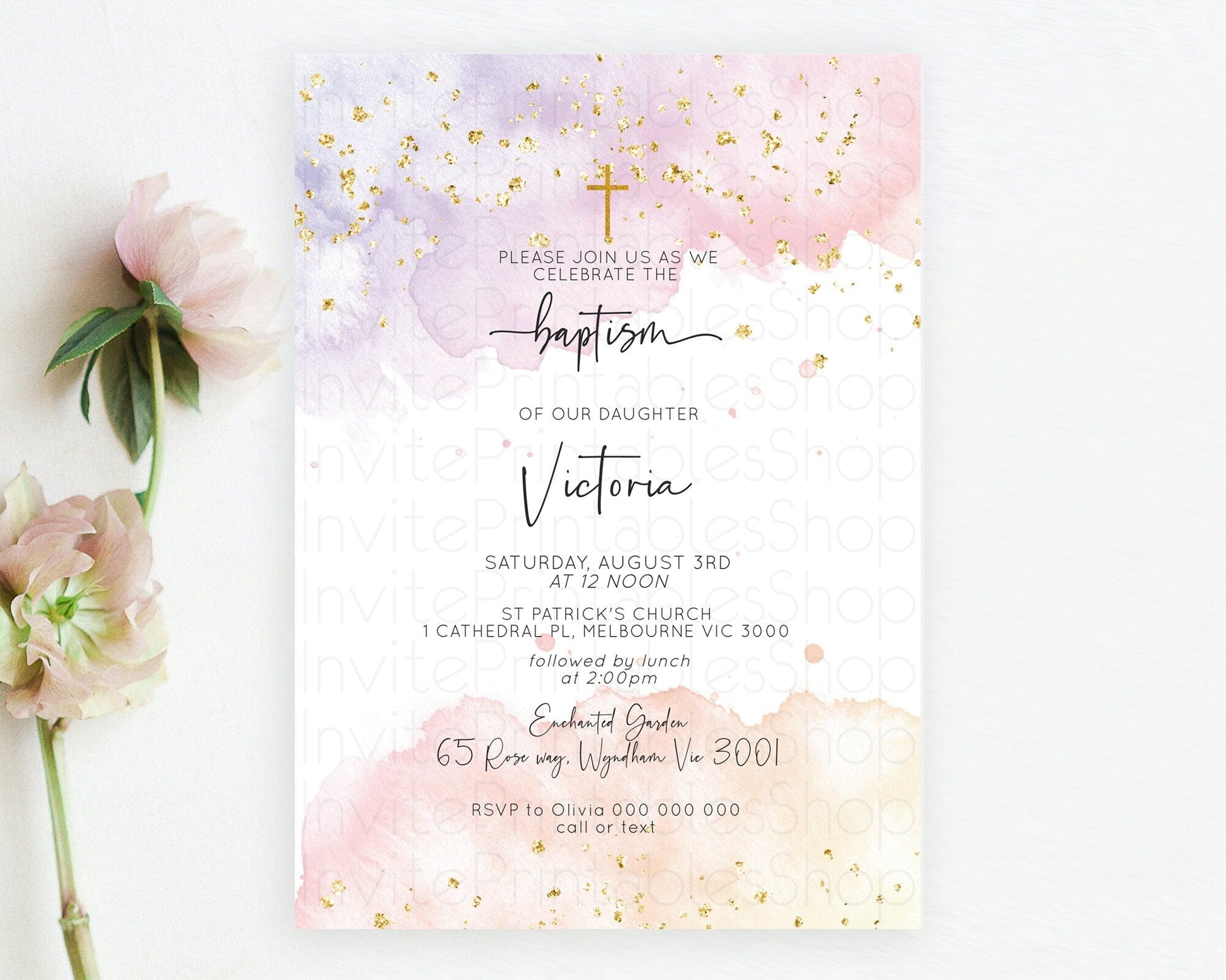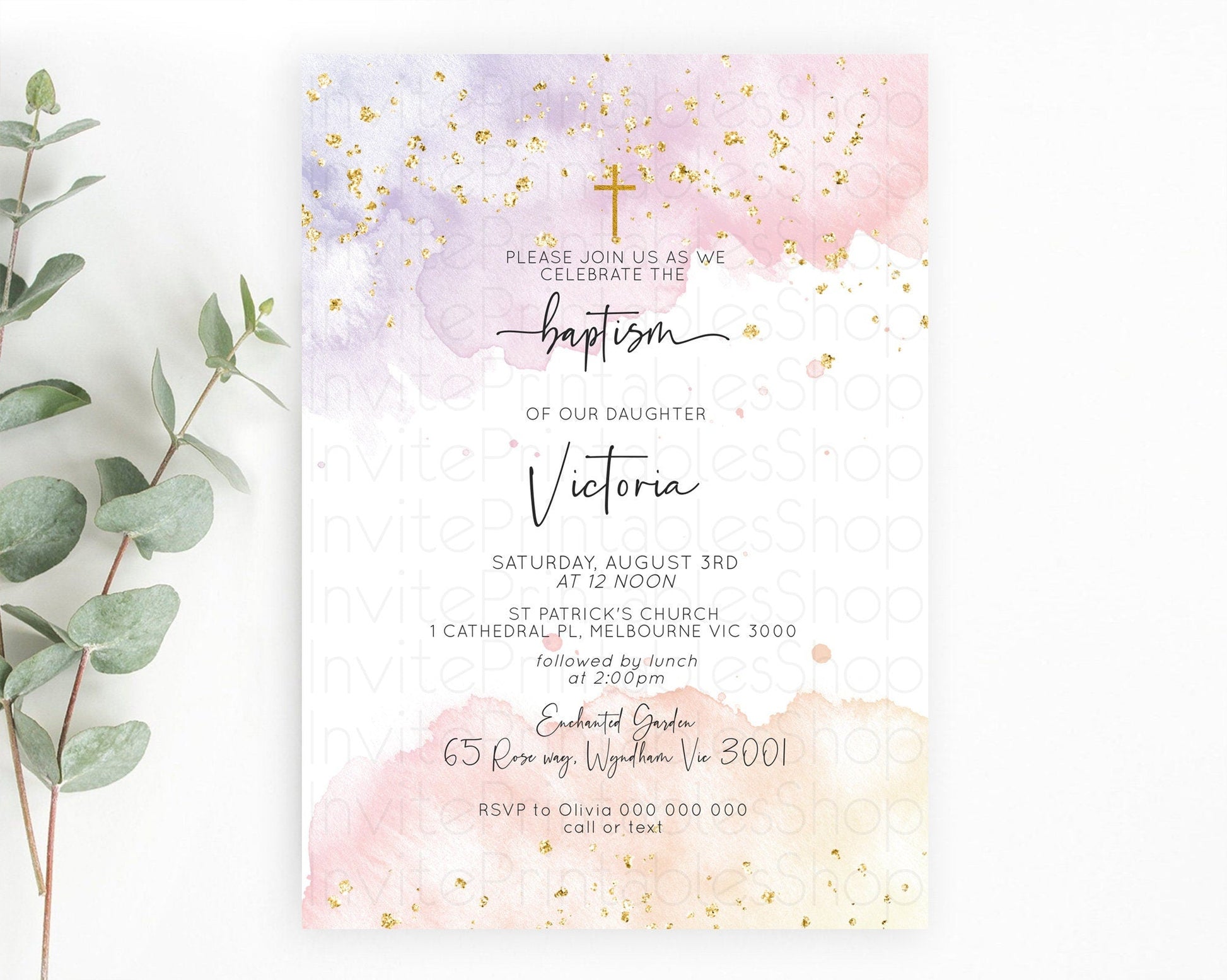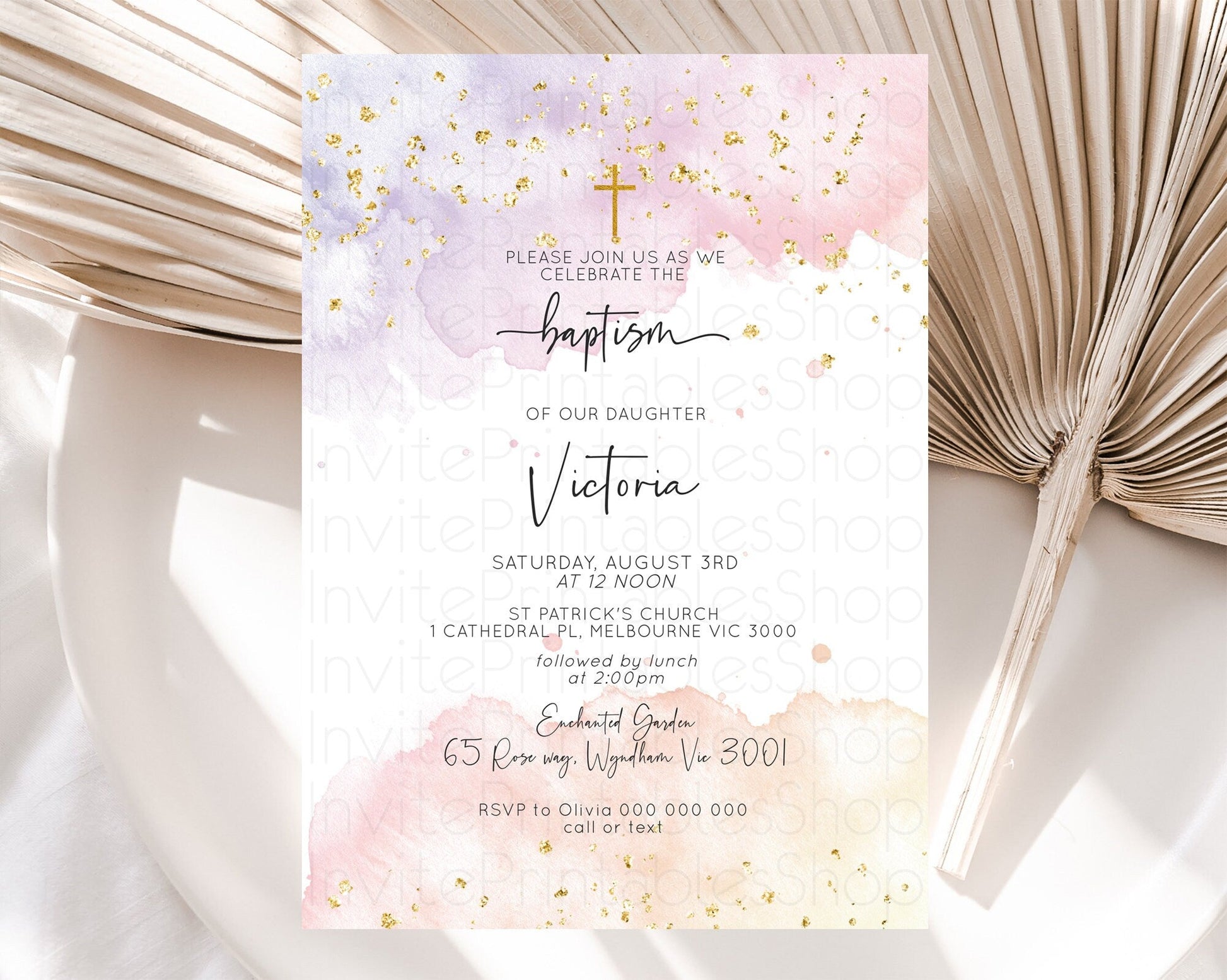 Pastel Baptism Invitation Pastel Colors Watercolor Baptism 1st Birthday Party Gold Ombre Pastel Rainbow Christening Holy Communion D10327
