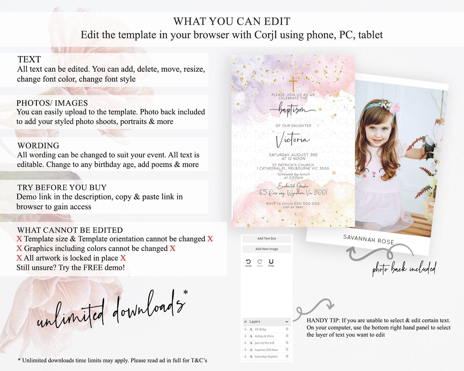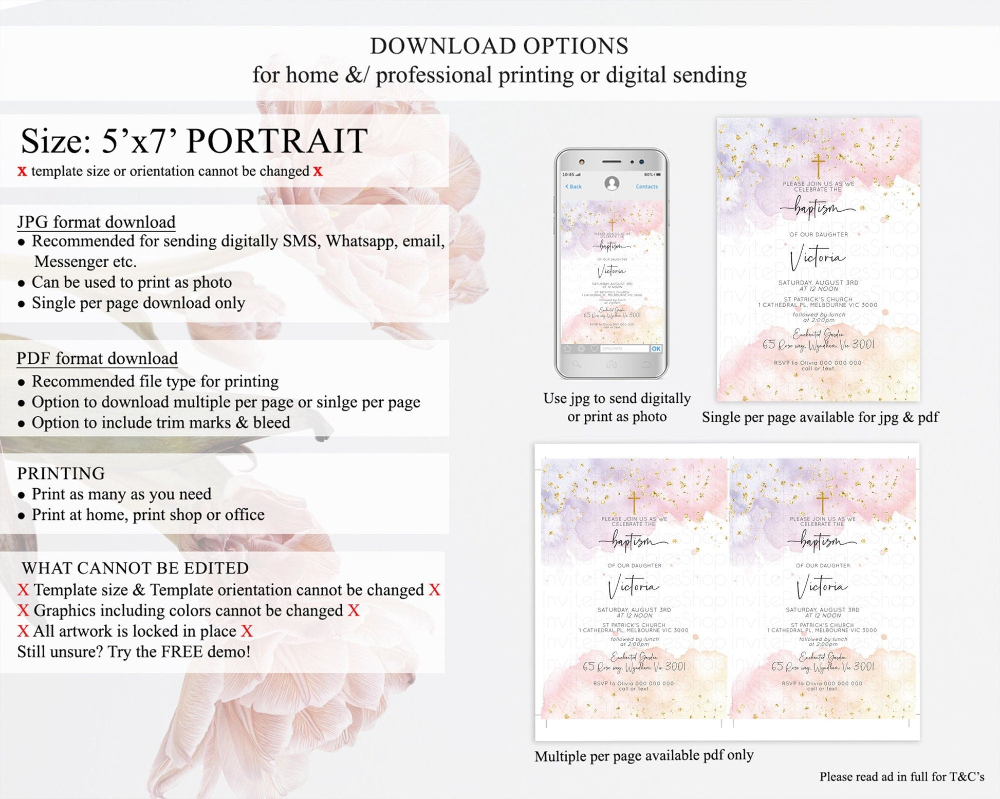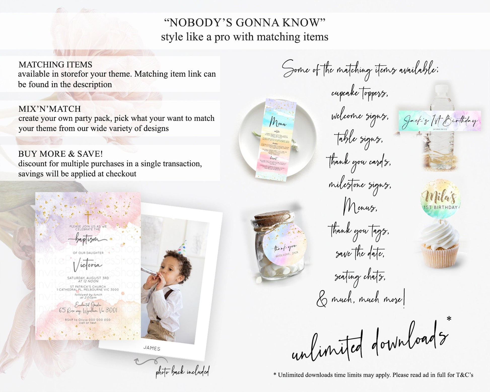 Pastel Baptism Invitation Pastel Colors Watercolor Baptism 1st Birthday Party Gold Ombre Pastel Rainbow Christening Holy Communion D10327