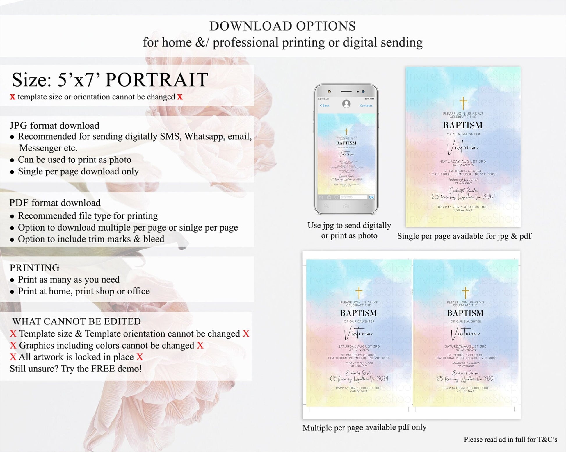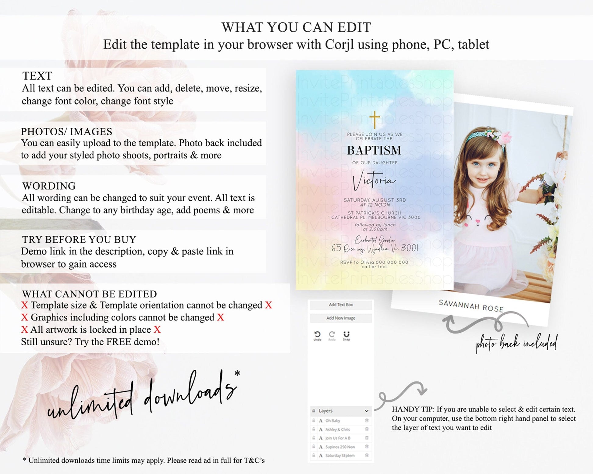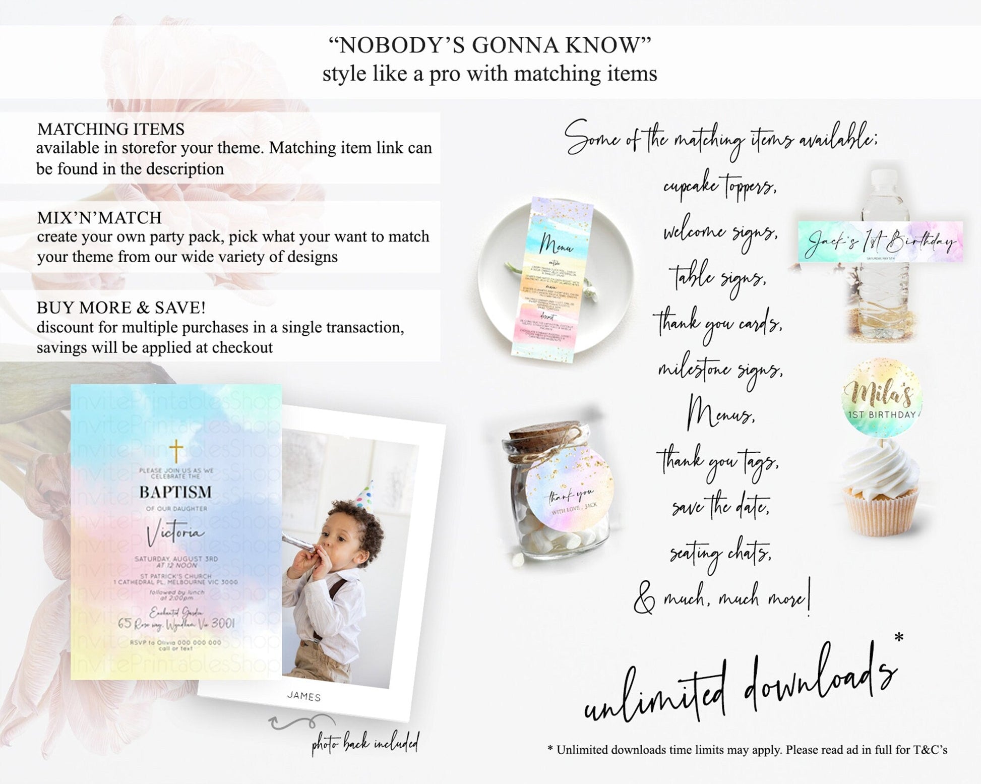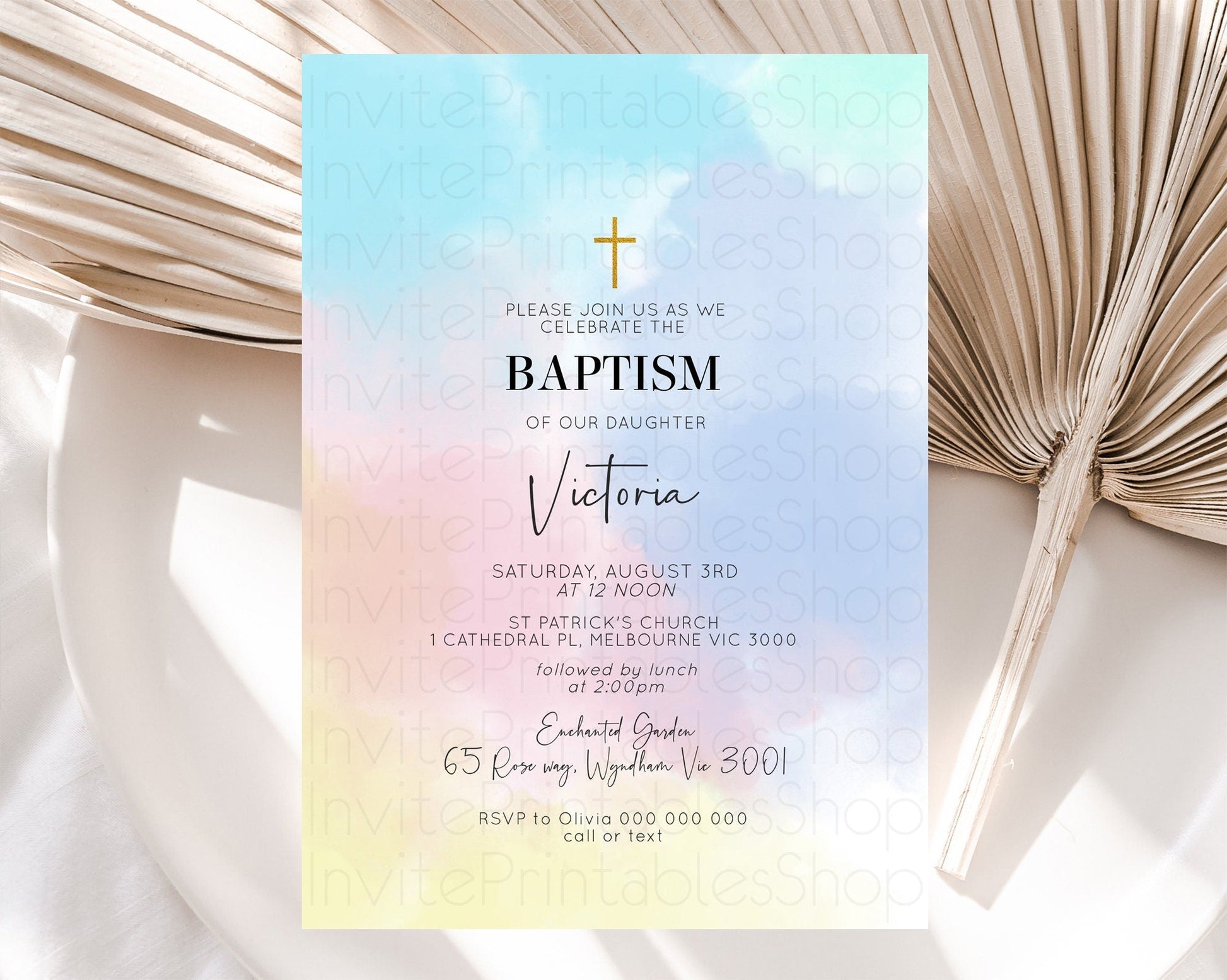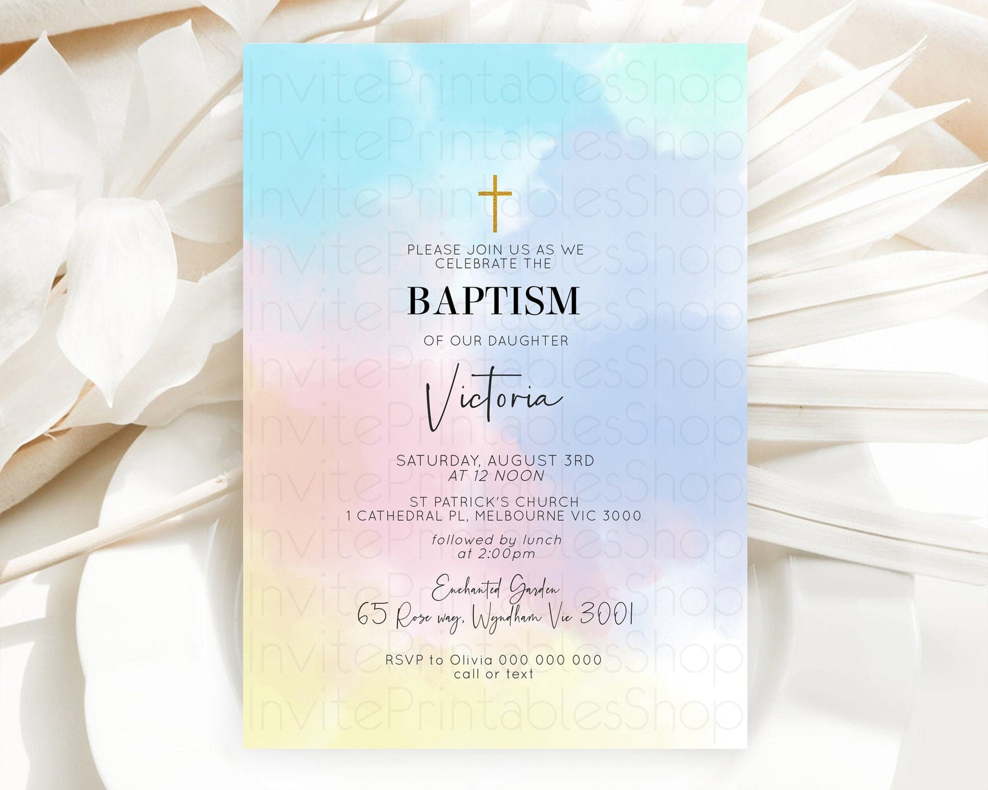 Pastel Baptism Invitation Pastel Colors Watercolor Baptism 1st Birthday Party Gold Ombre Pastel Rainbow Christening Holy Communion D10373