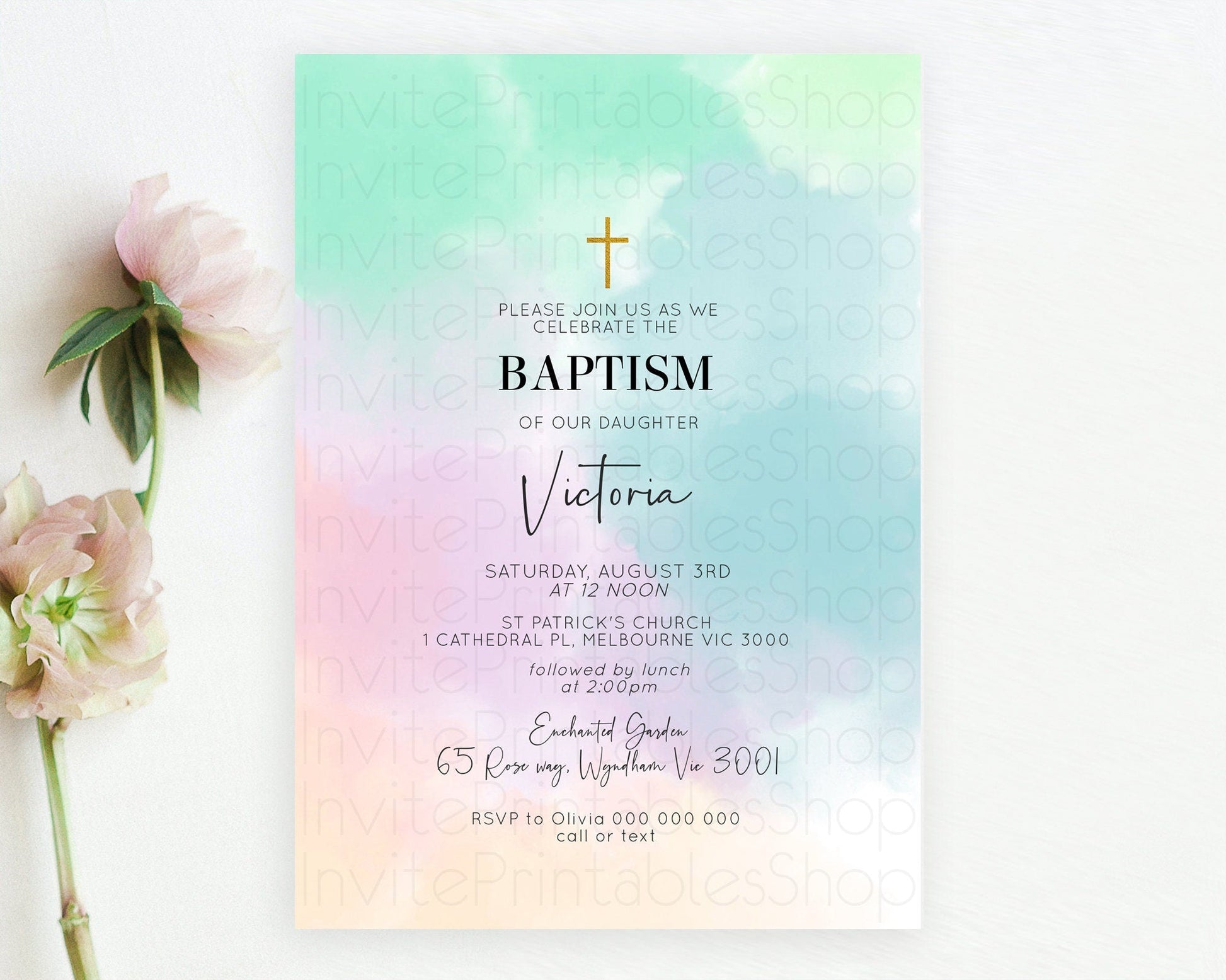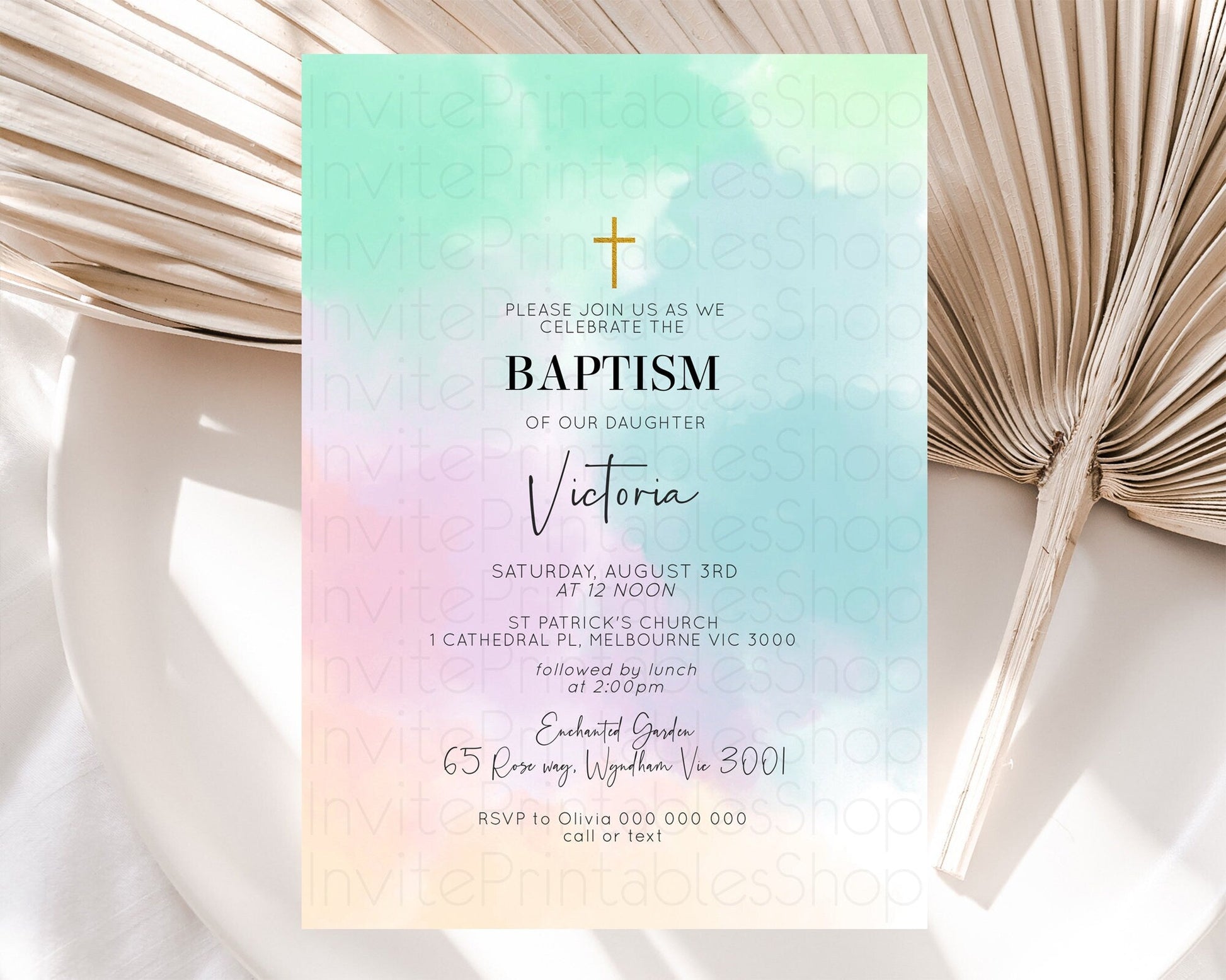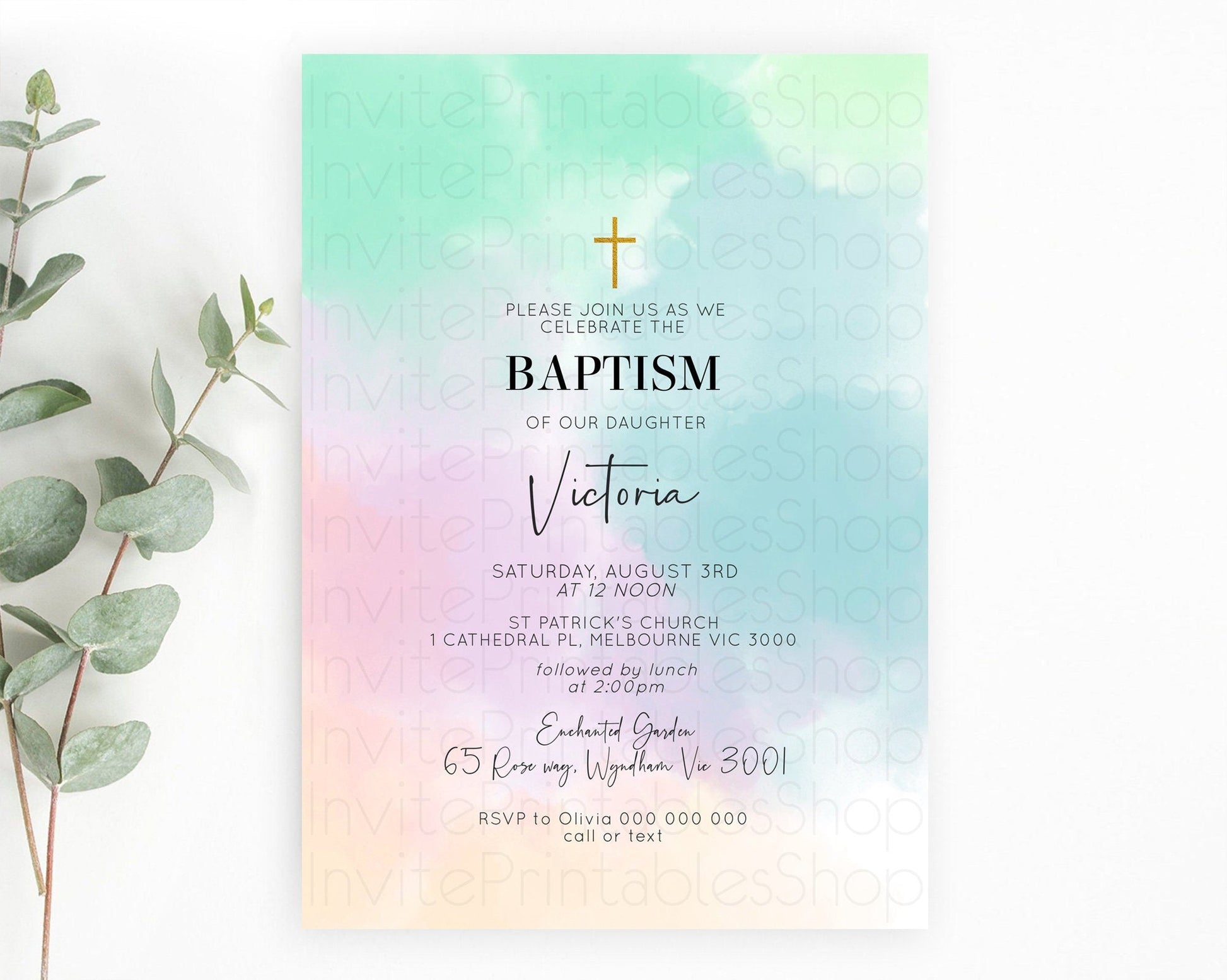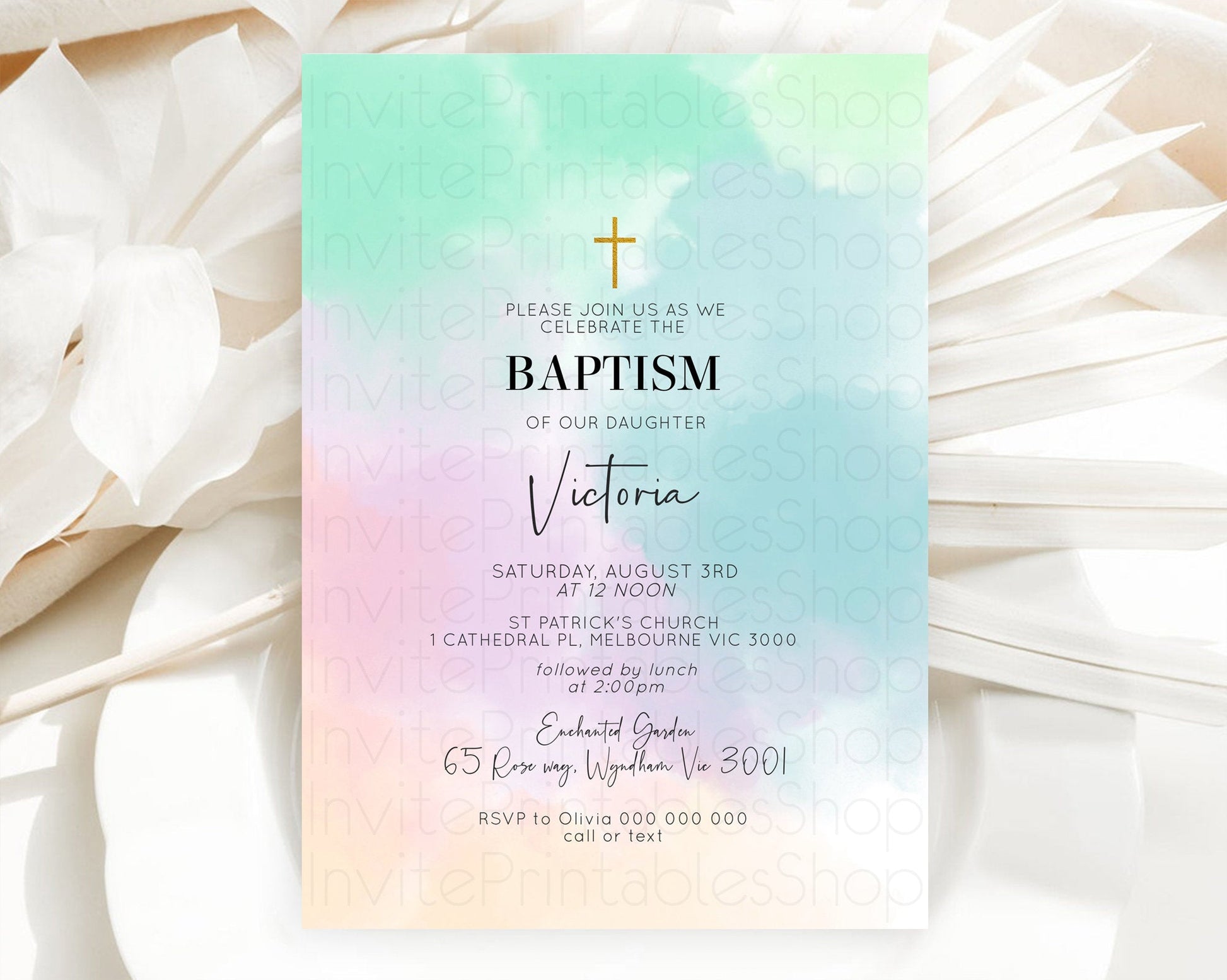 Pastel Baptism Invitation Pastel Colors Watercolor Baptism 1st Birthday Party Gold Ombre Pastel Rainbow Christening Holy Communion D10375
