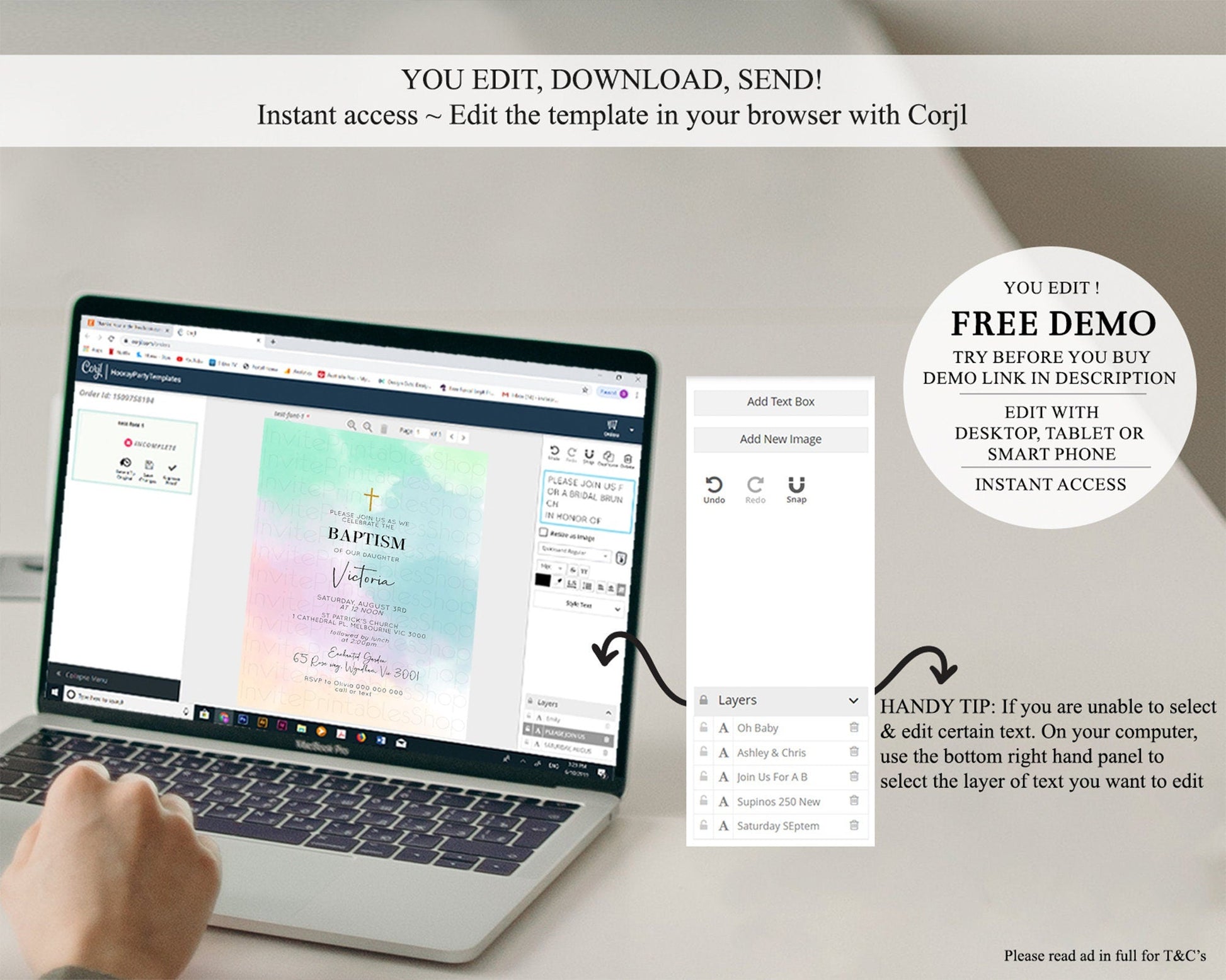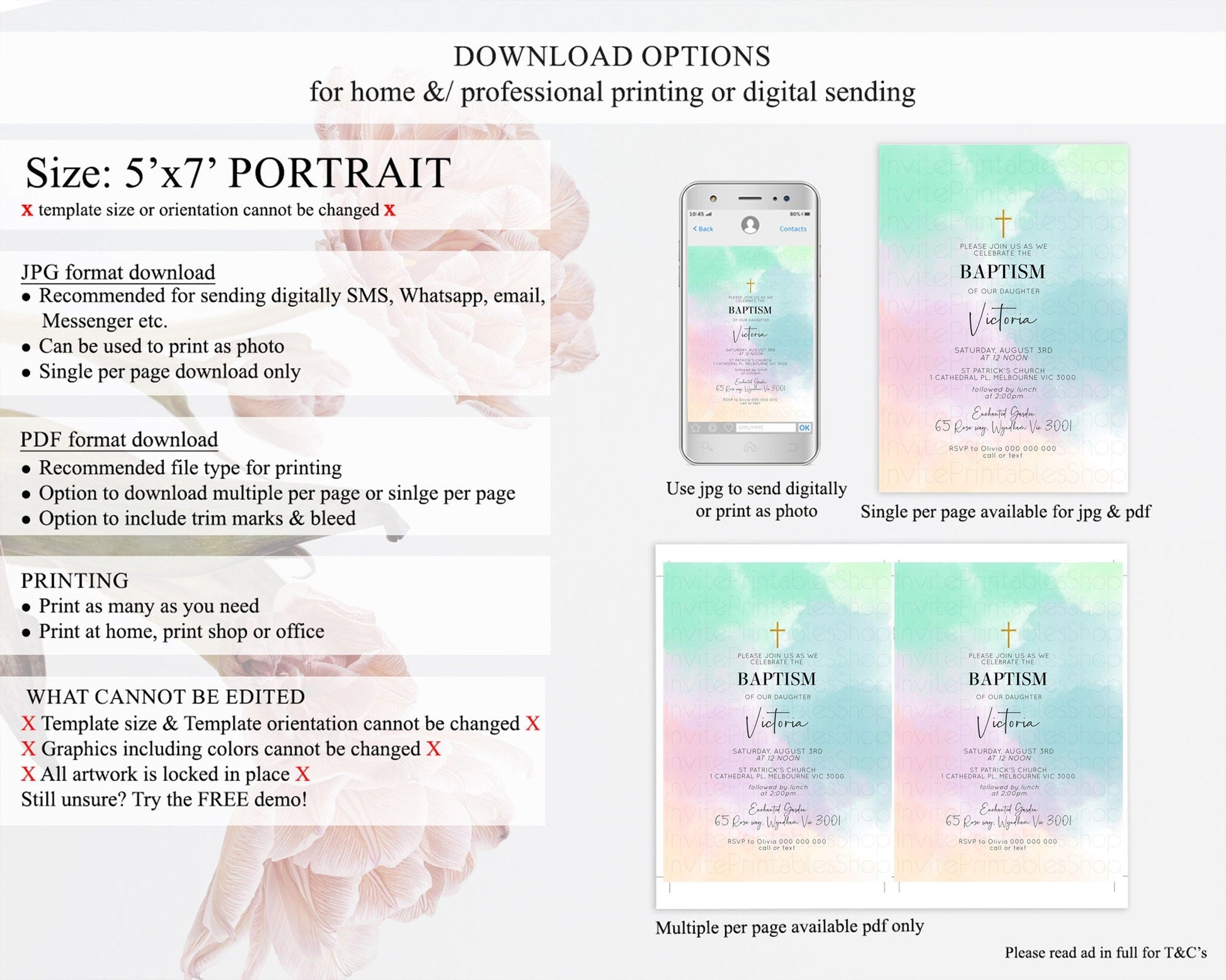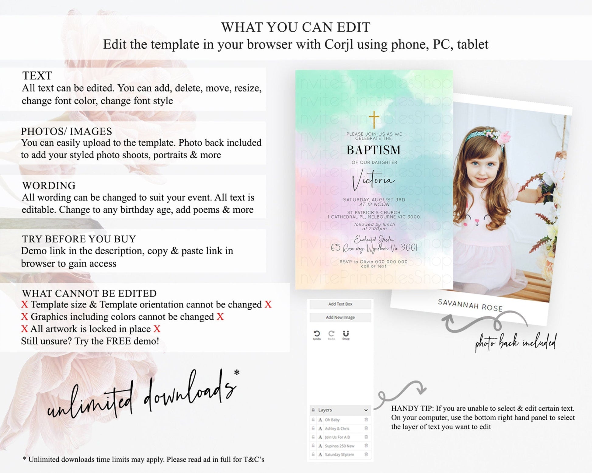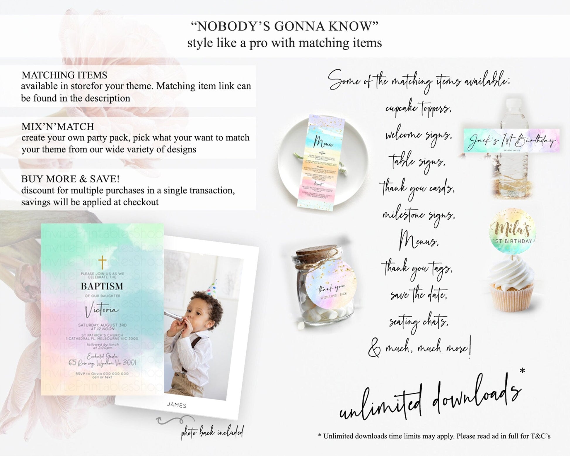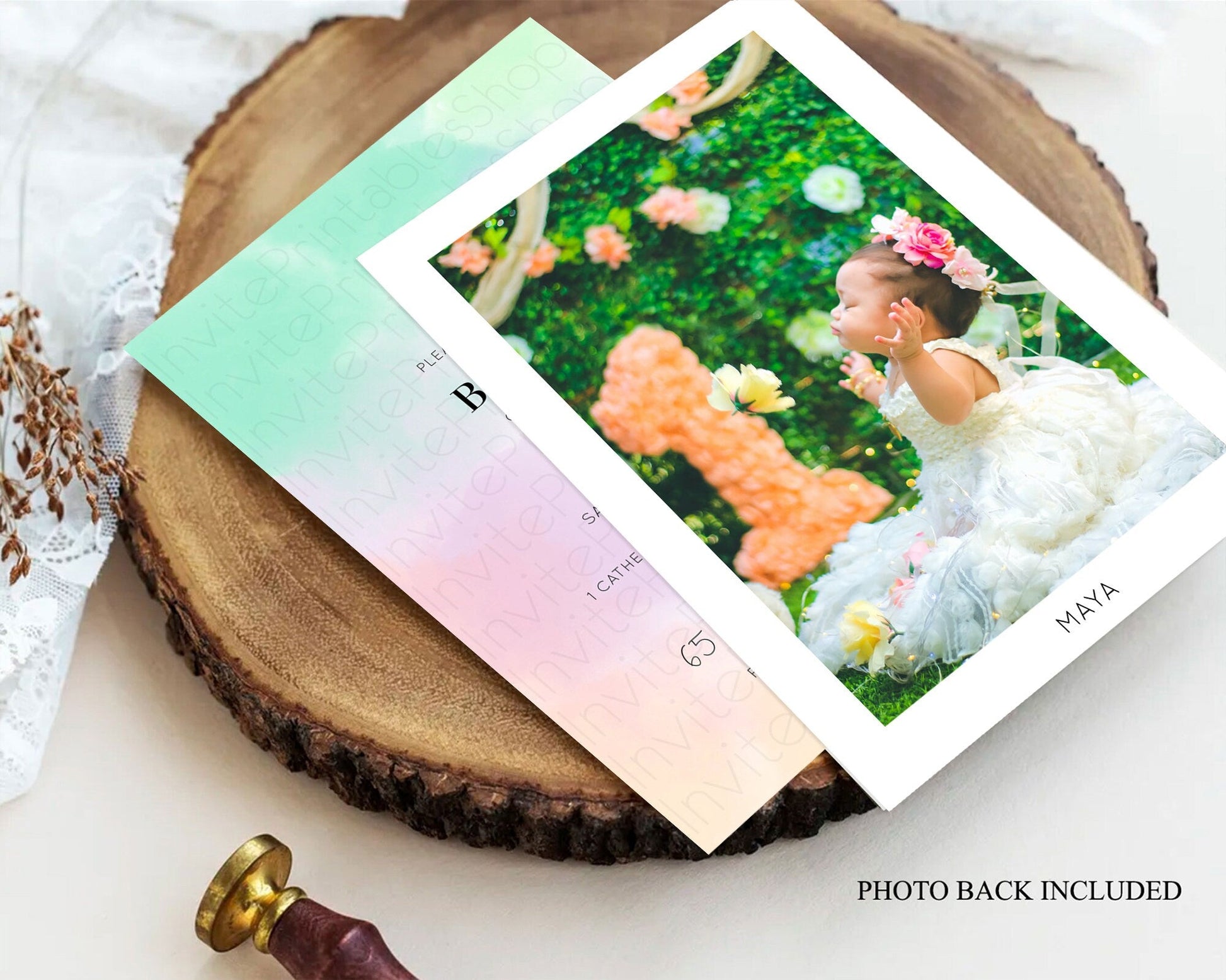 Pastel Baptism Invitation Pastel Colors Watercolor Baptism 1st Birthday Party Gold Ombre Pastel Rainbow Christening Holy Communion D10375