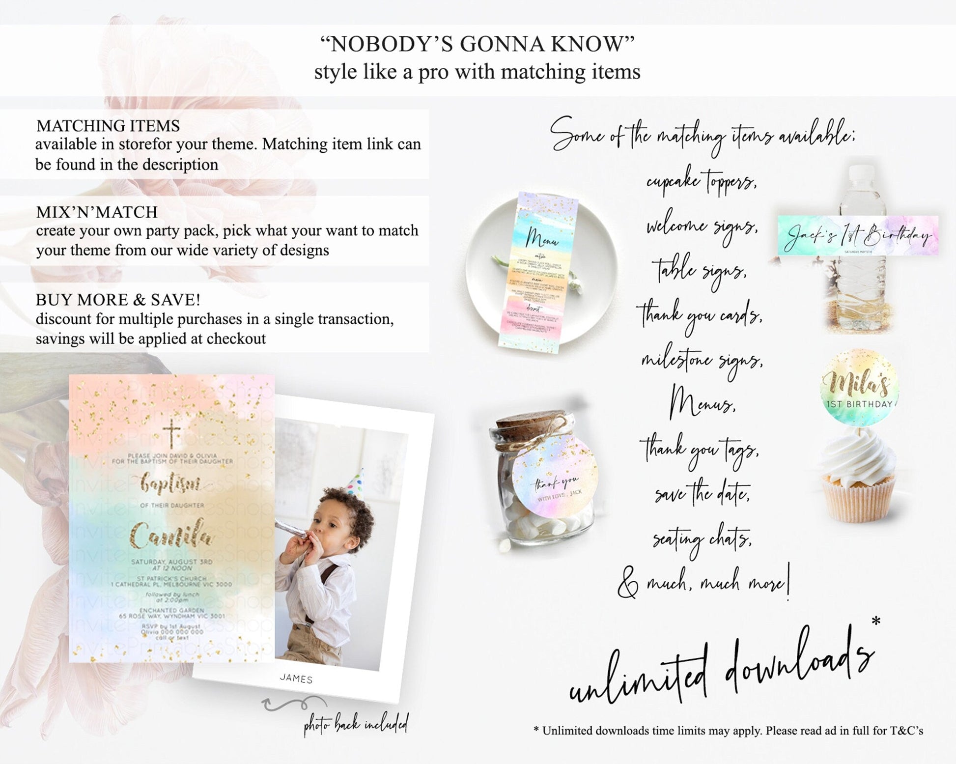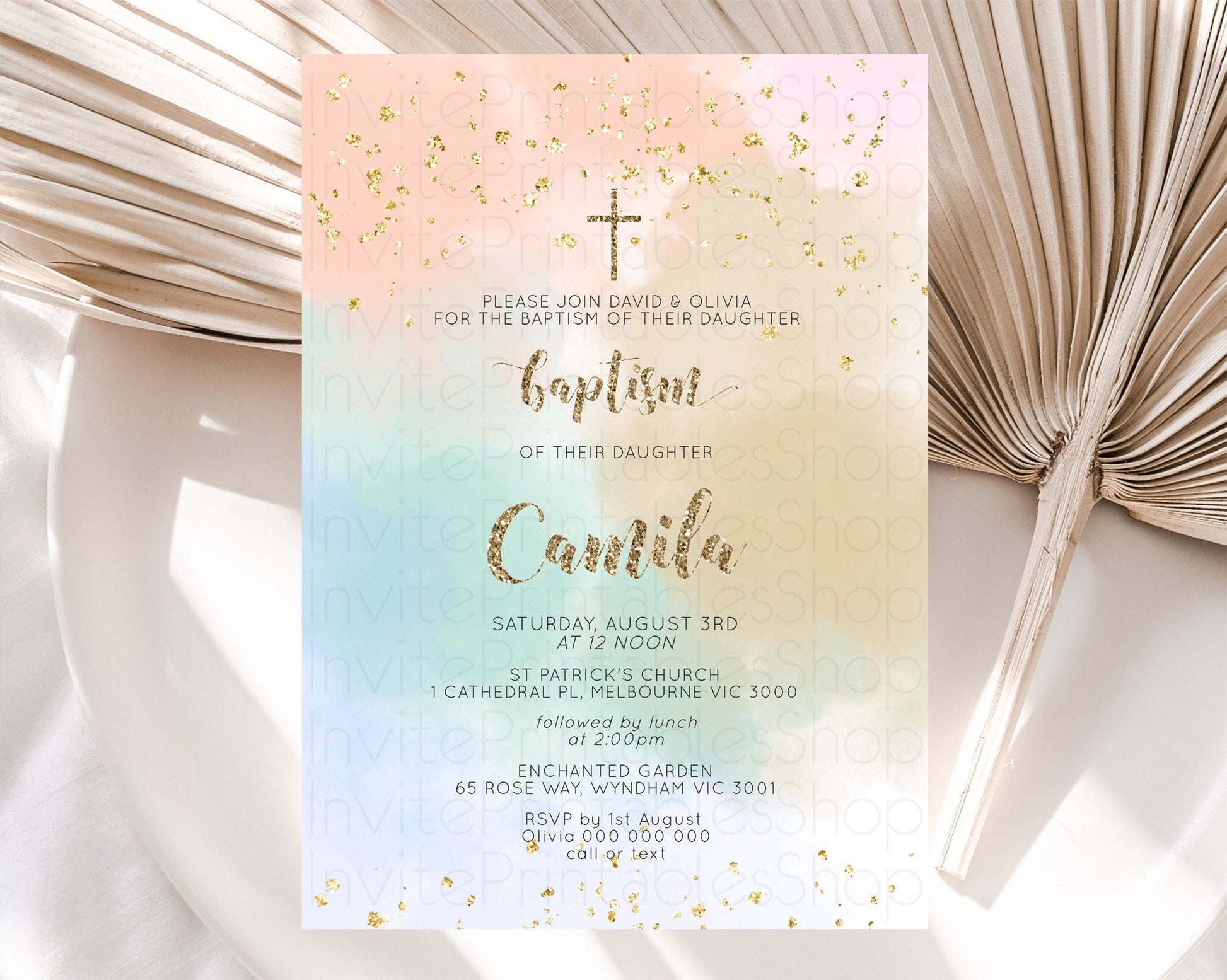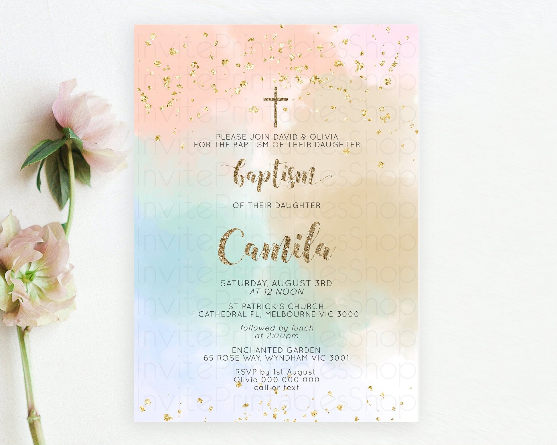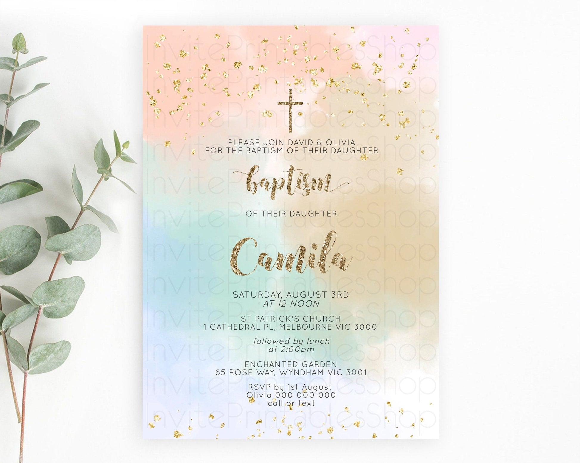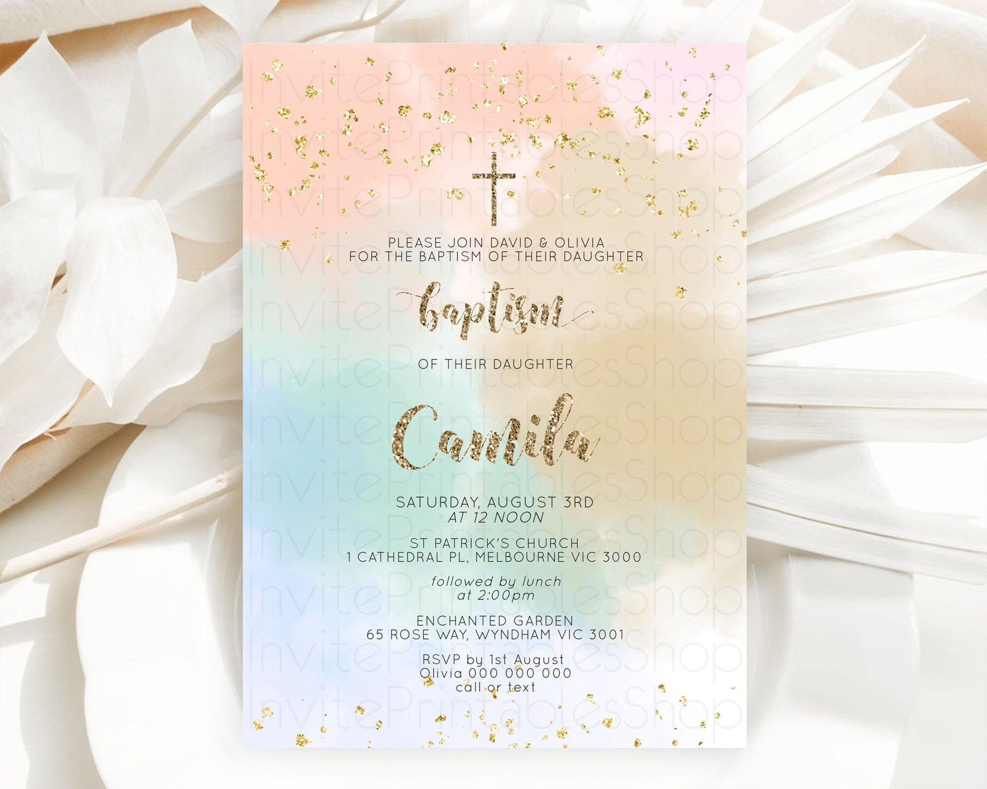 Pastel Baptism Invitation Pastel Colors Watercolor Baptism 1st Birthday Party Gold Ombre Pastel Rainbow Christening Holy Communion D10377
