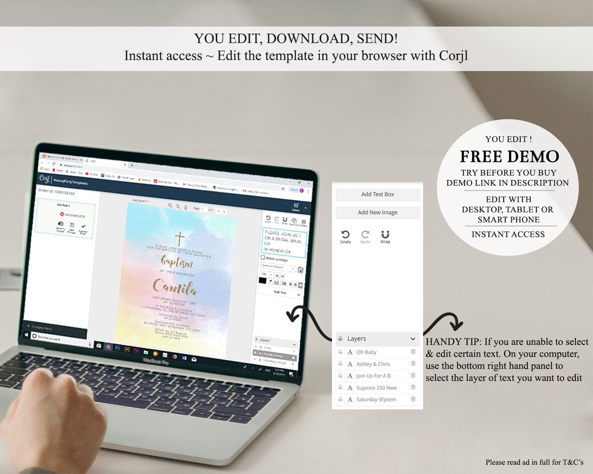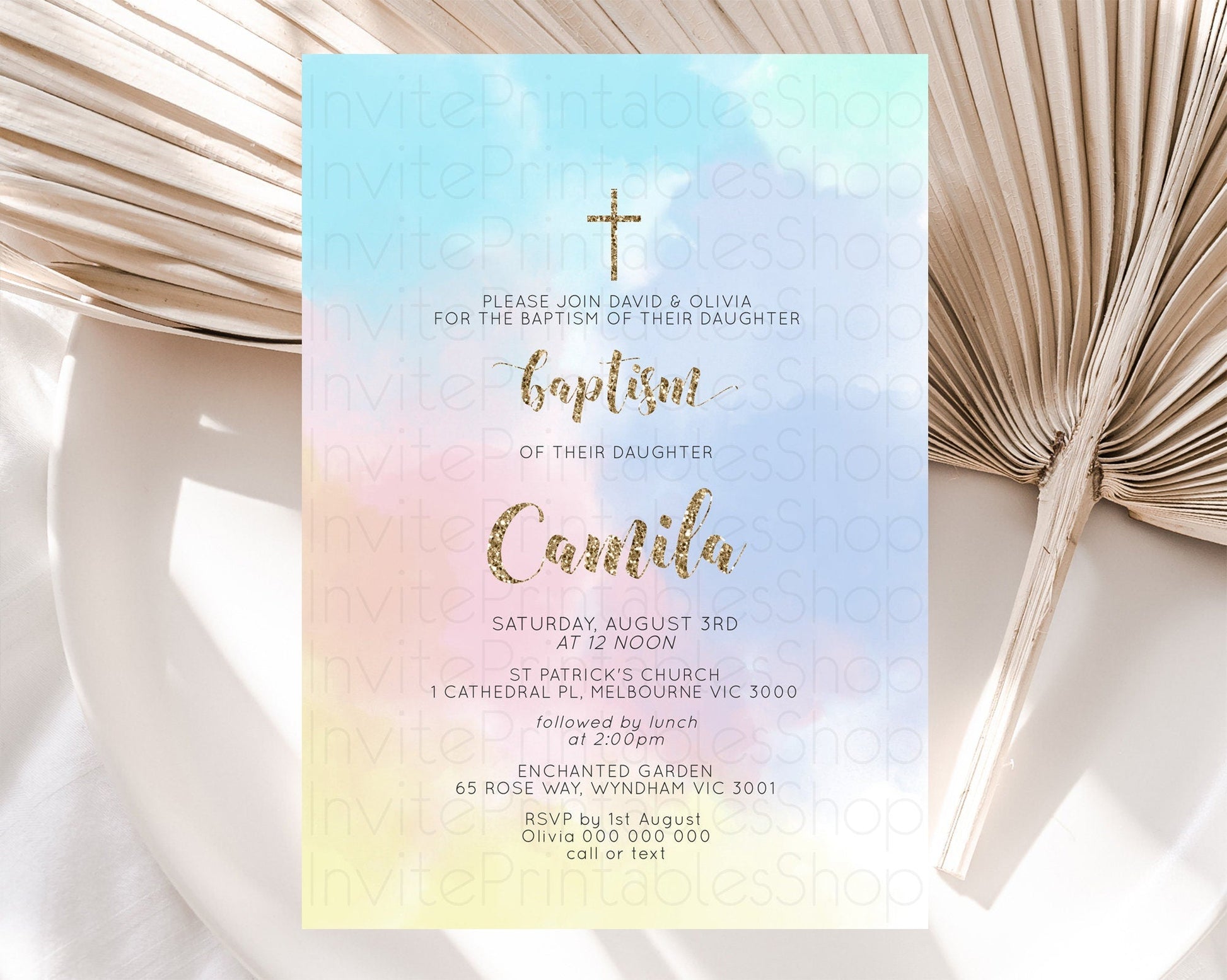 Pastel Baptism Invitation Pastel Colors Watercolor Baptism 1st Birthday Party Gold Ombre Pastel Rainbow Christening Holy Communion D10378