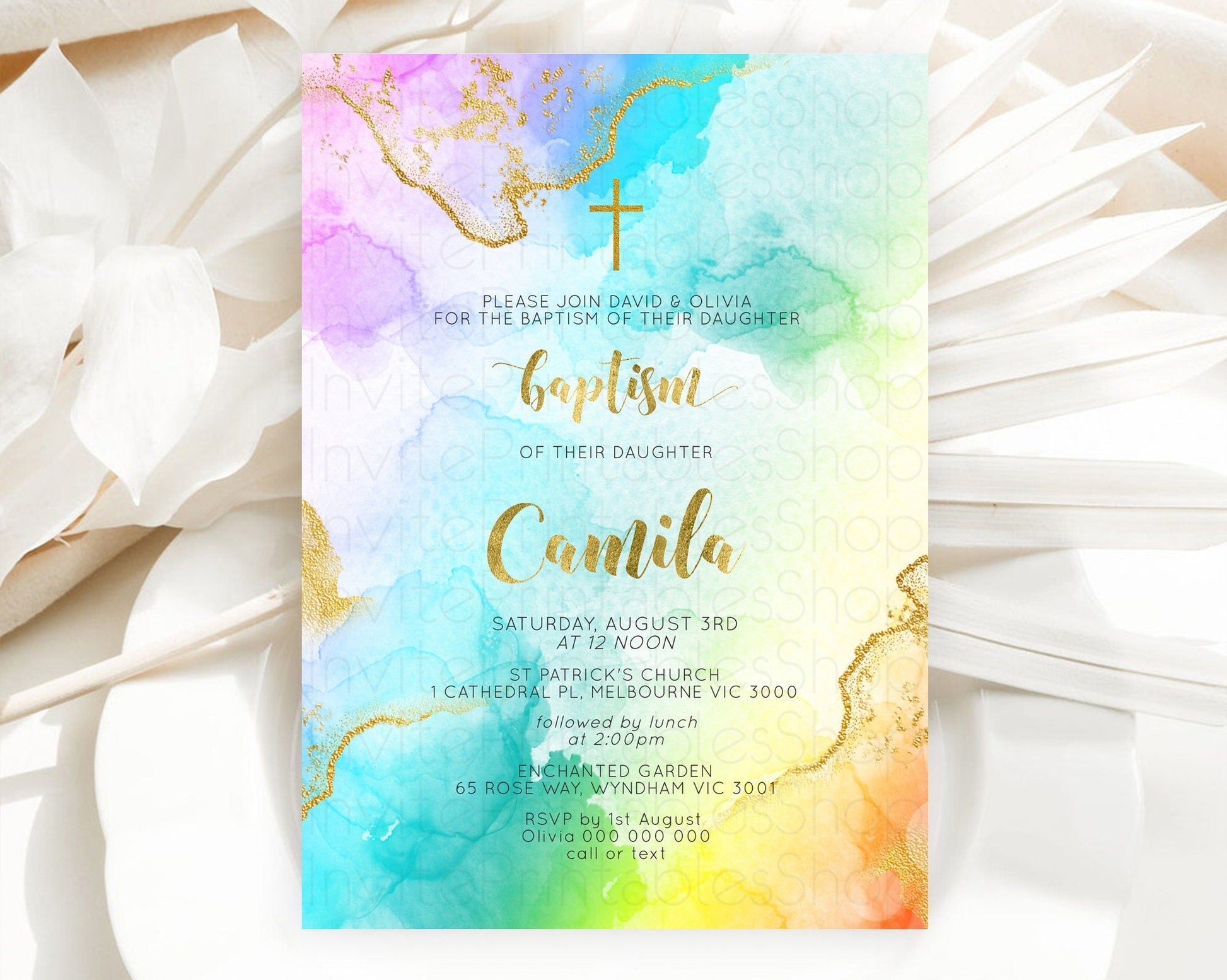 Pastel Baptism Invitation Pastel Colors Watercolor Baptism 1st Birthday Party Gold Ombre Pastel Rainbow Christening Holy Communion D10392