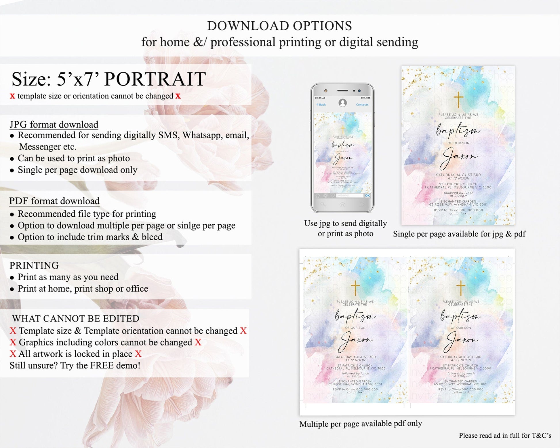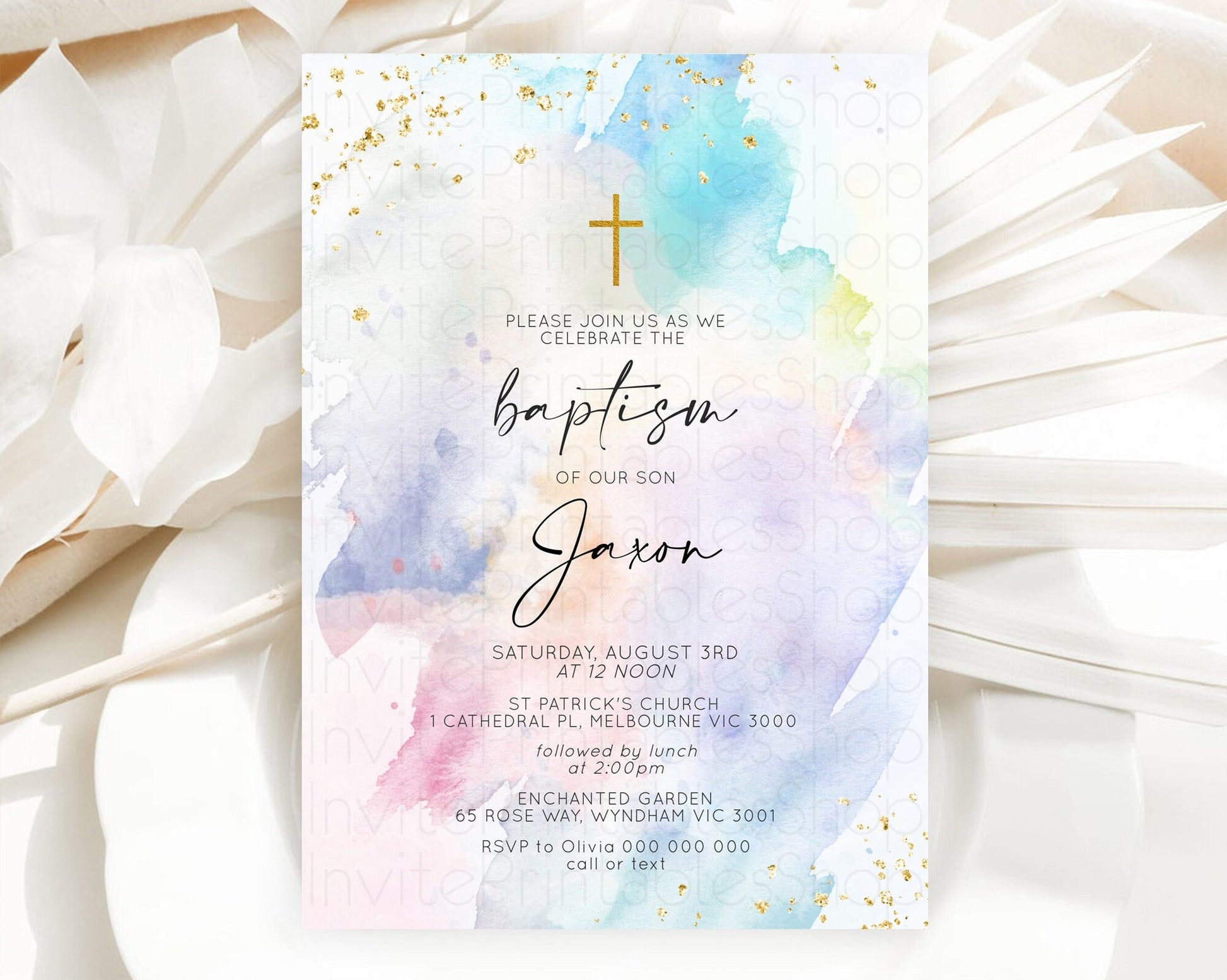 Pastel Baptism Invitation Pastel Colors Watercolor Baptism 1st Birthday Party Gold Ombre Pastel Rainbow Christening Holy Communion D10420