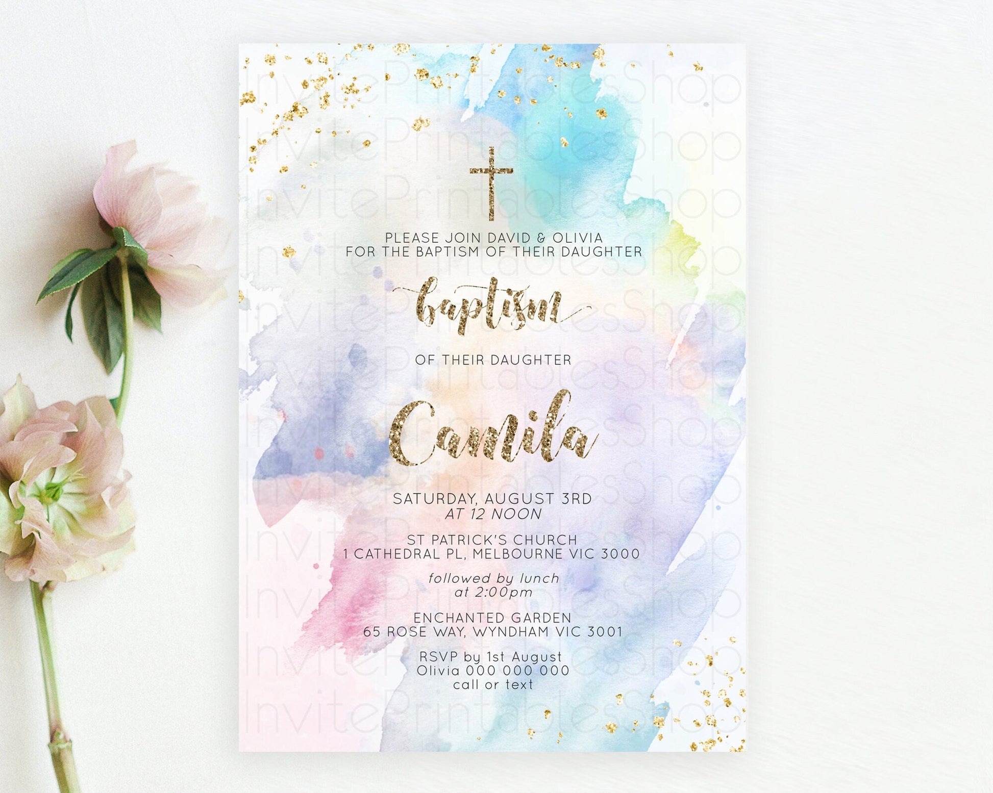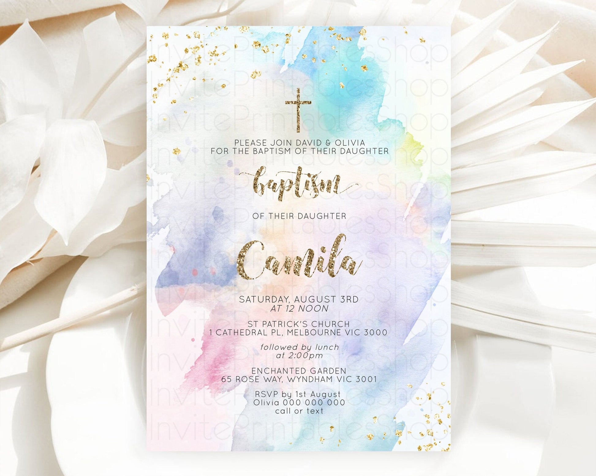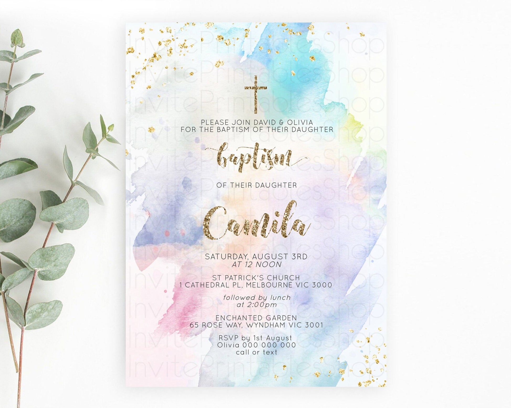 Pastel Baptism Invitation Pastel Colors Watercolor Baptism 1st Birthday Party Gold Ombre Pastel Rainbow Christening Holy Communion D10421