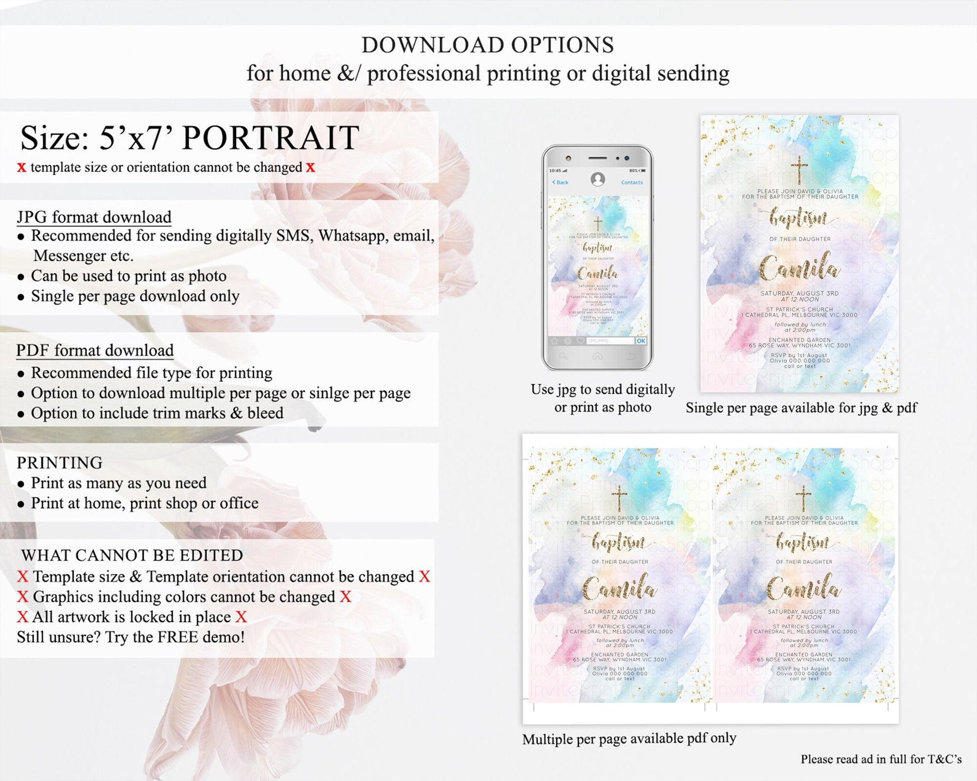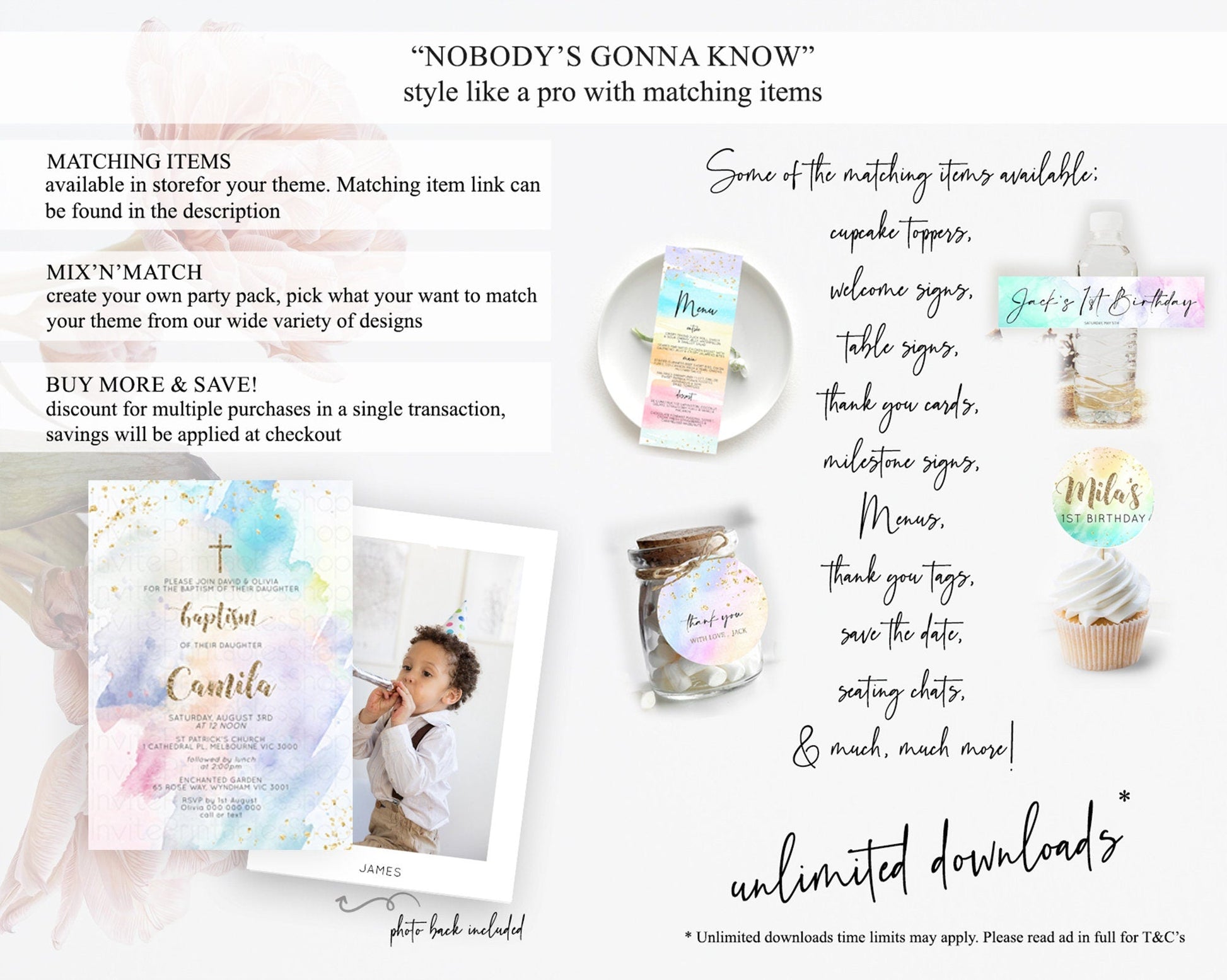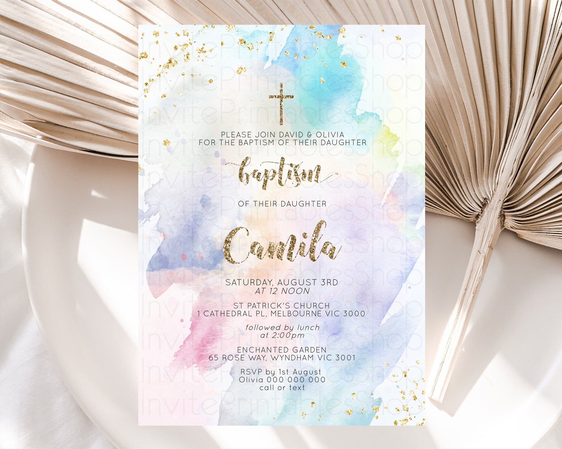 Pastel Baptism Invitation Pastel Colors Watercolor Baptism 1st Birthday Party Gold Ombre Pastel Rainbow Christening Holy Communion D10421