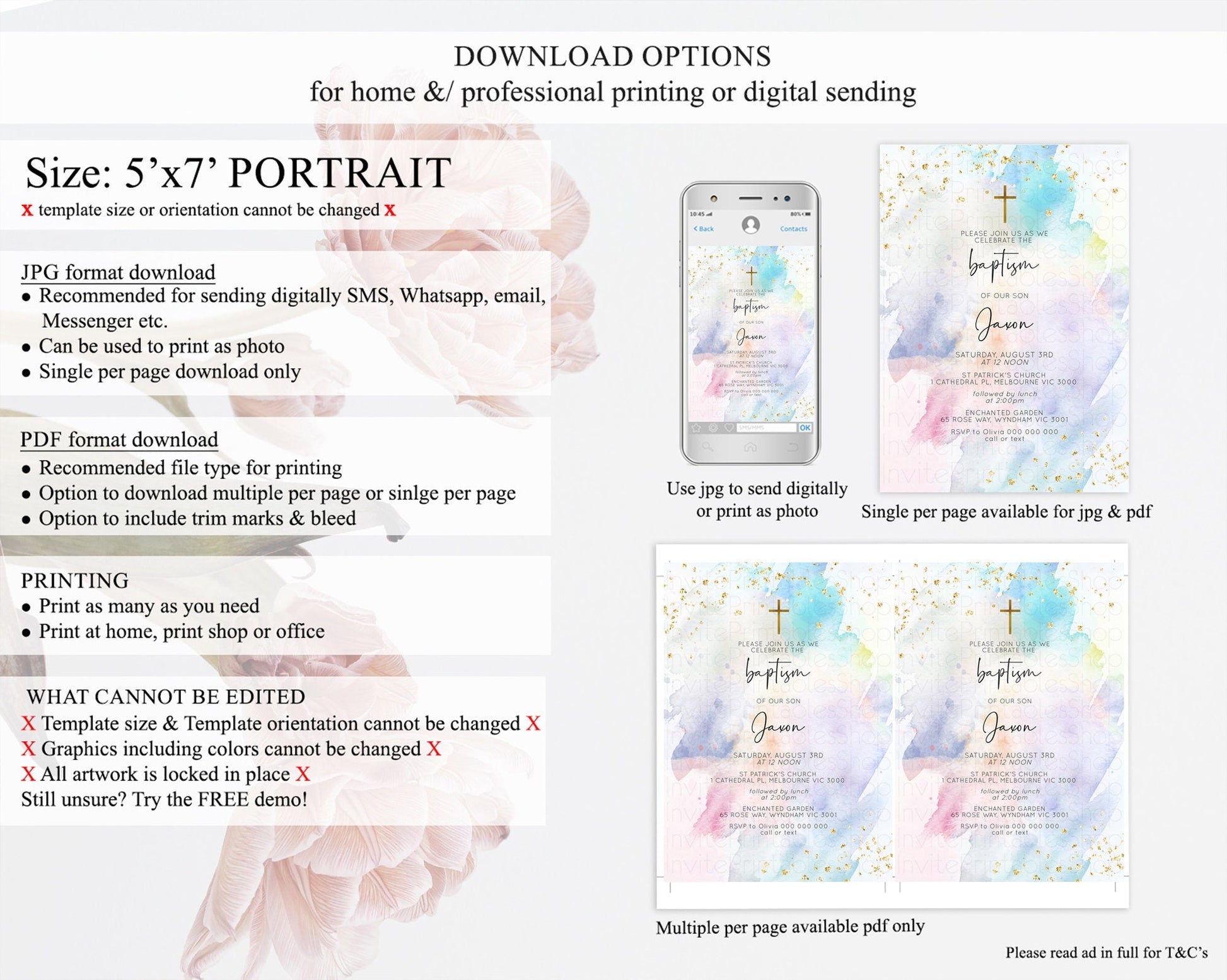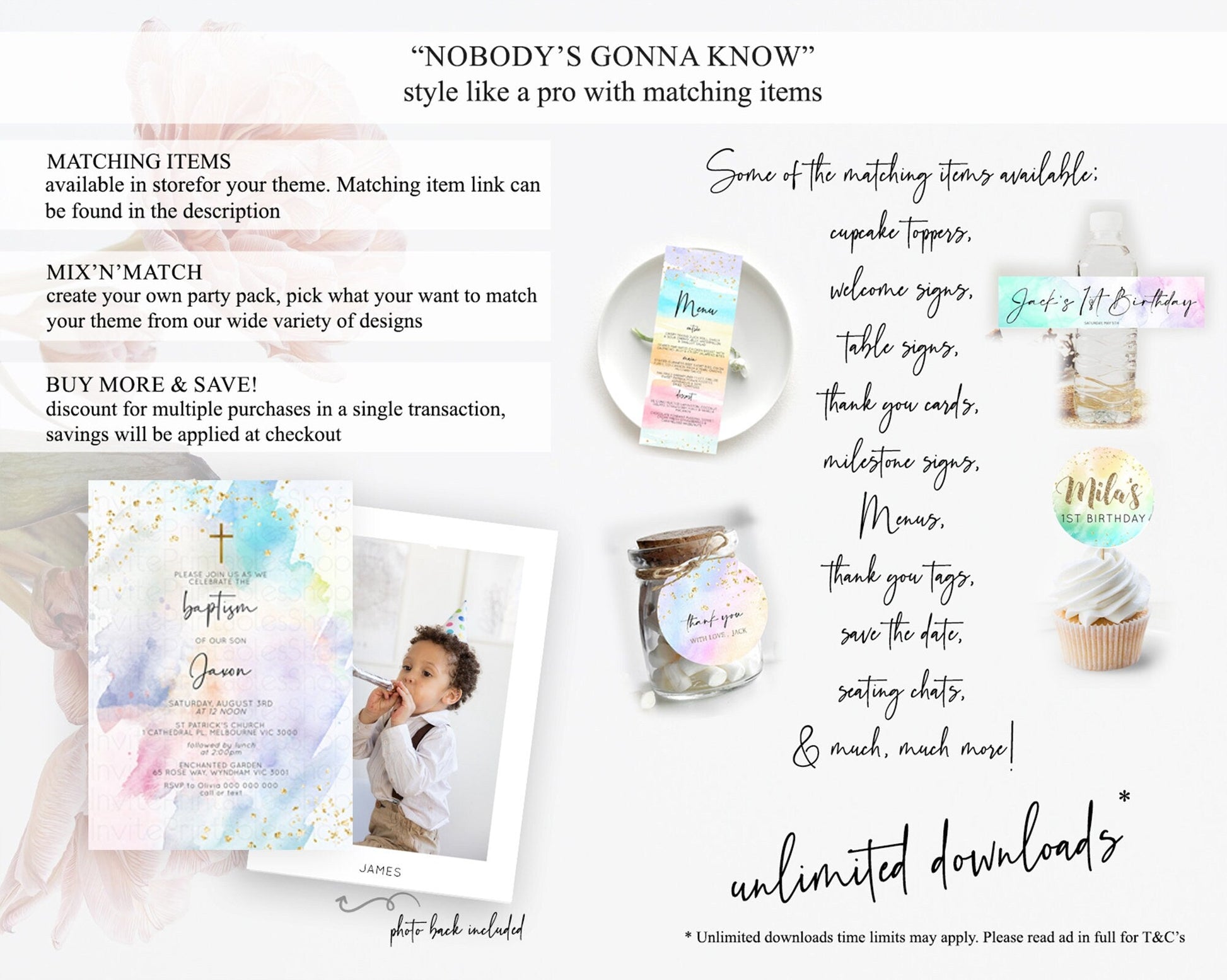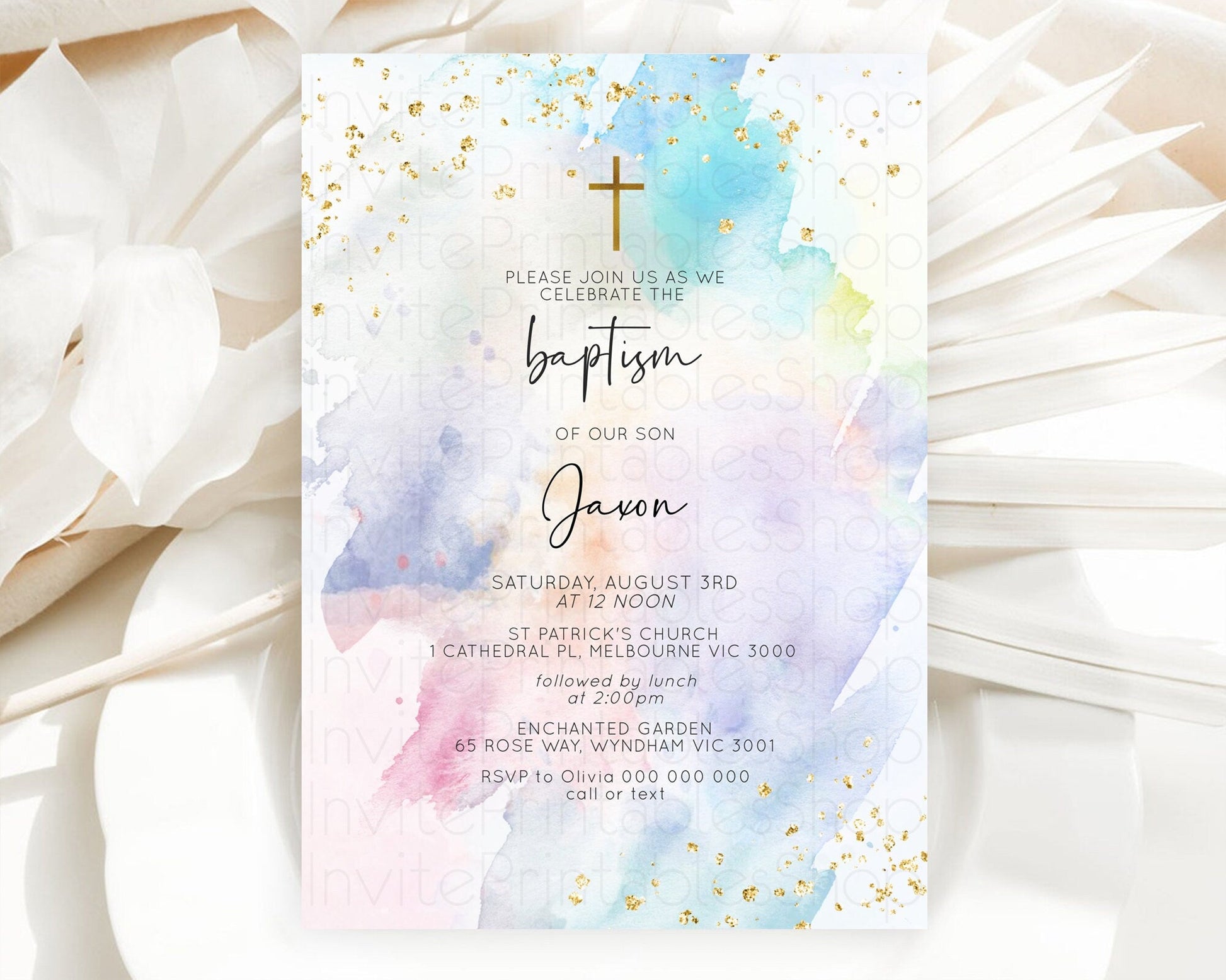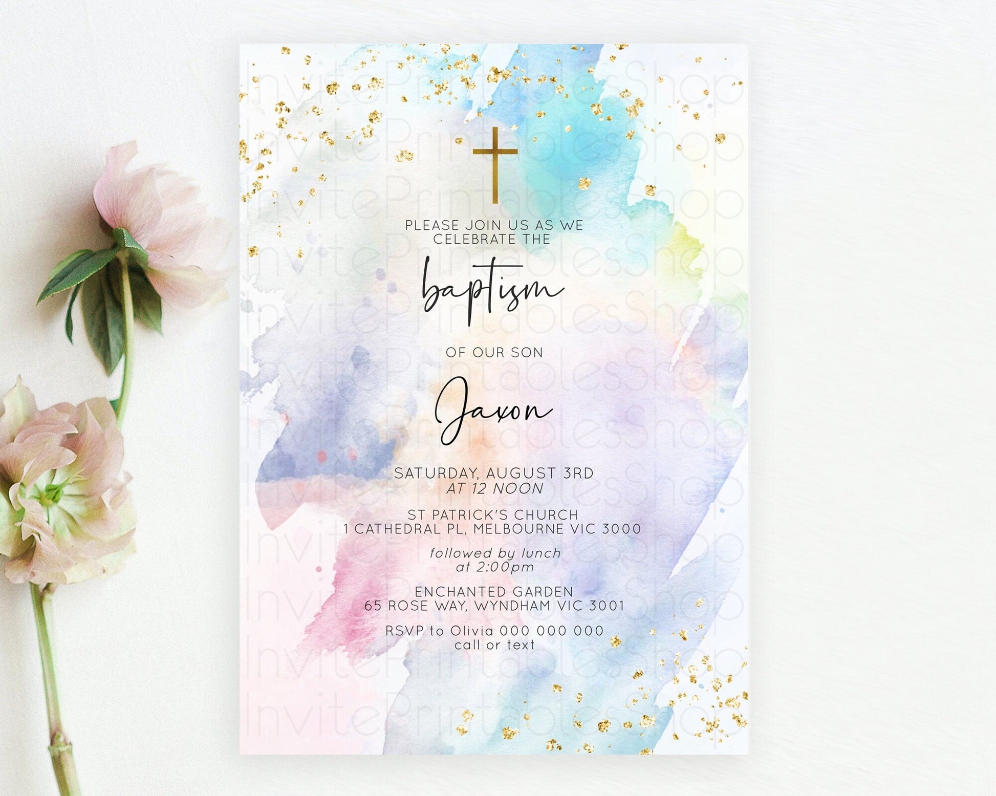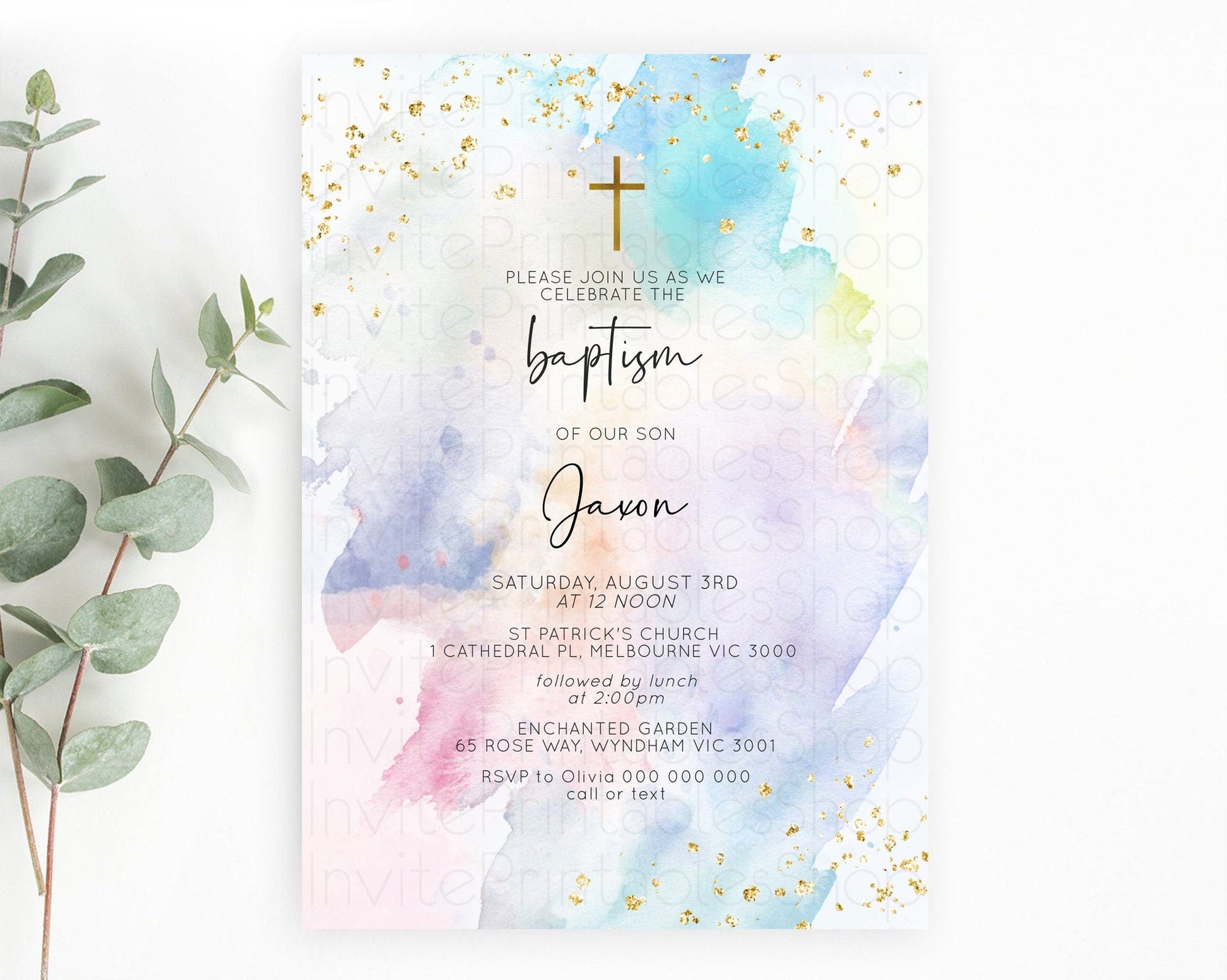 Pastel Baptism Invitation Pastel Colors Watercolor Baptism 1st Birthday Party Gold Ombre Pastel Rainbow Christening Holy Communion D10422