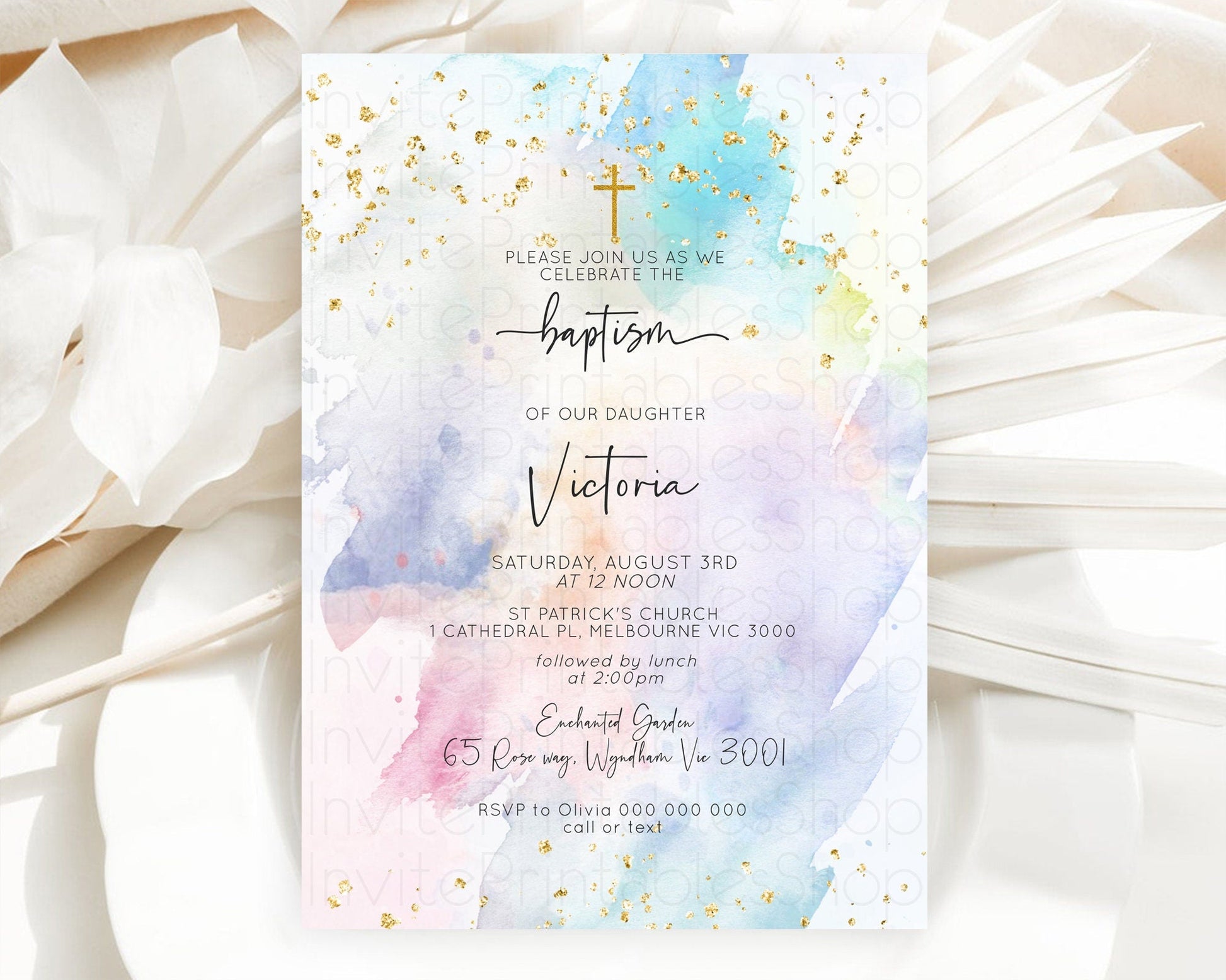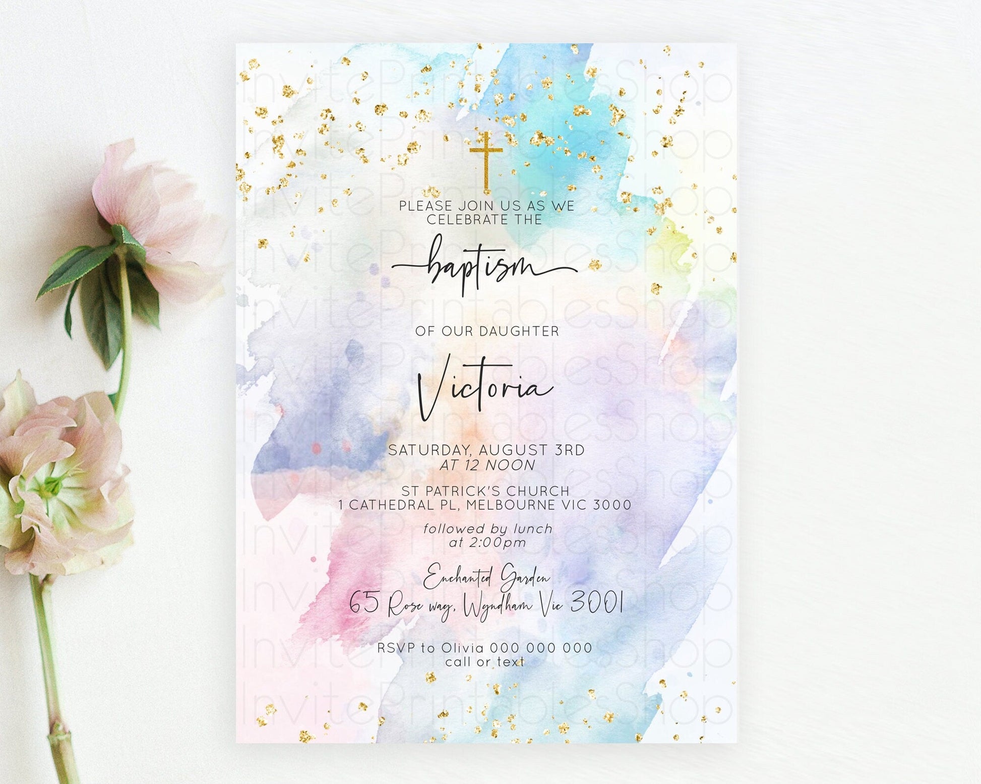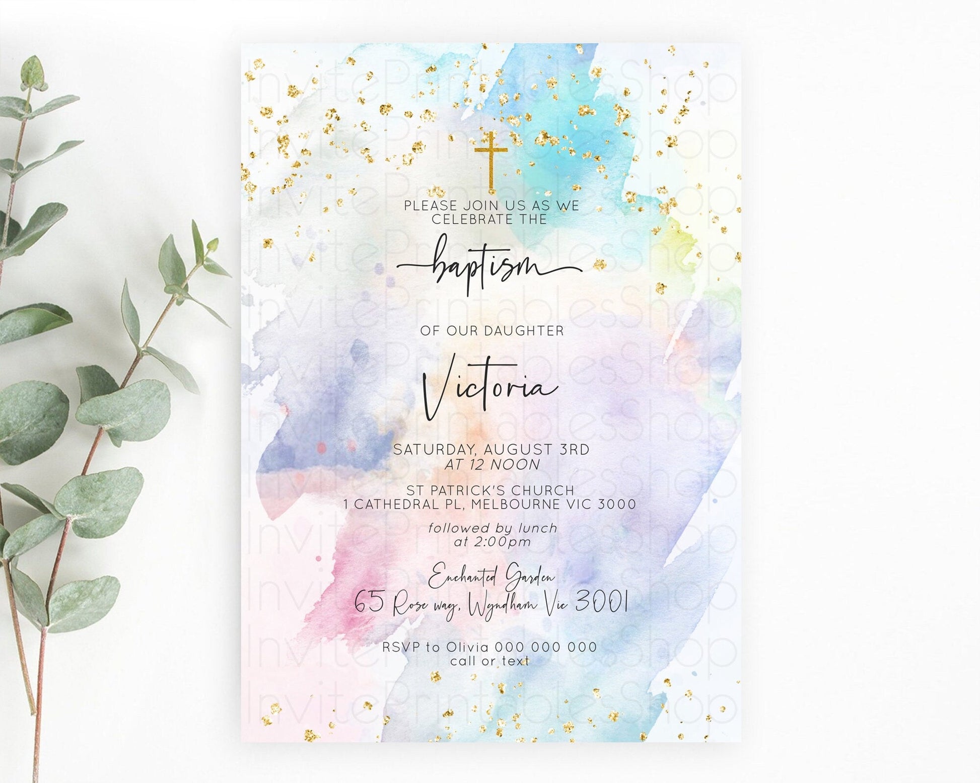 Pastel Baptism Invitation Pastel Colors Watercolor Baptism 1st Birthday Party Gold Ombre Pastel Rainbow Christening Holy Communion D10424