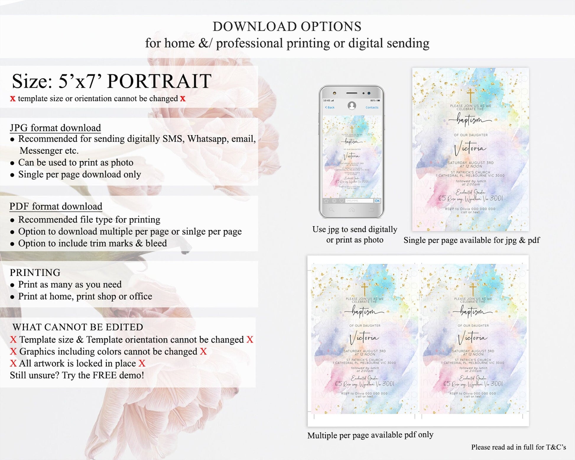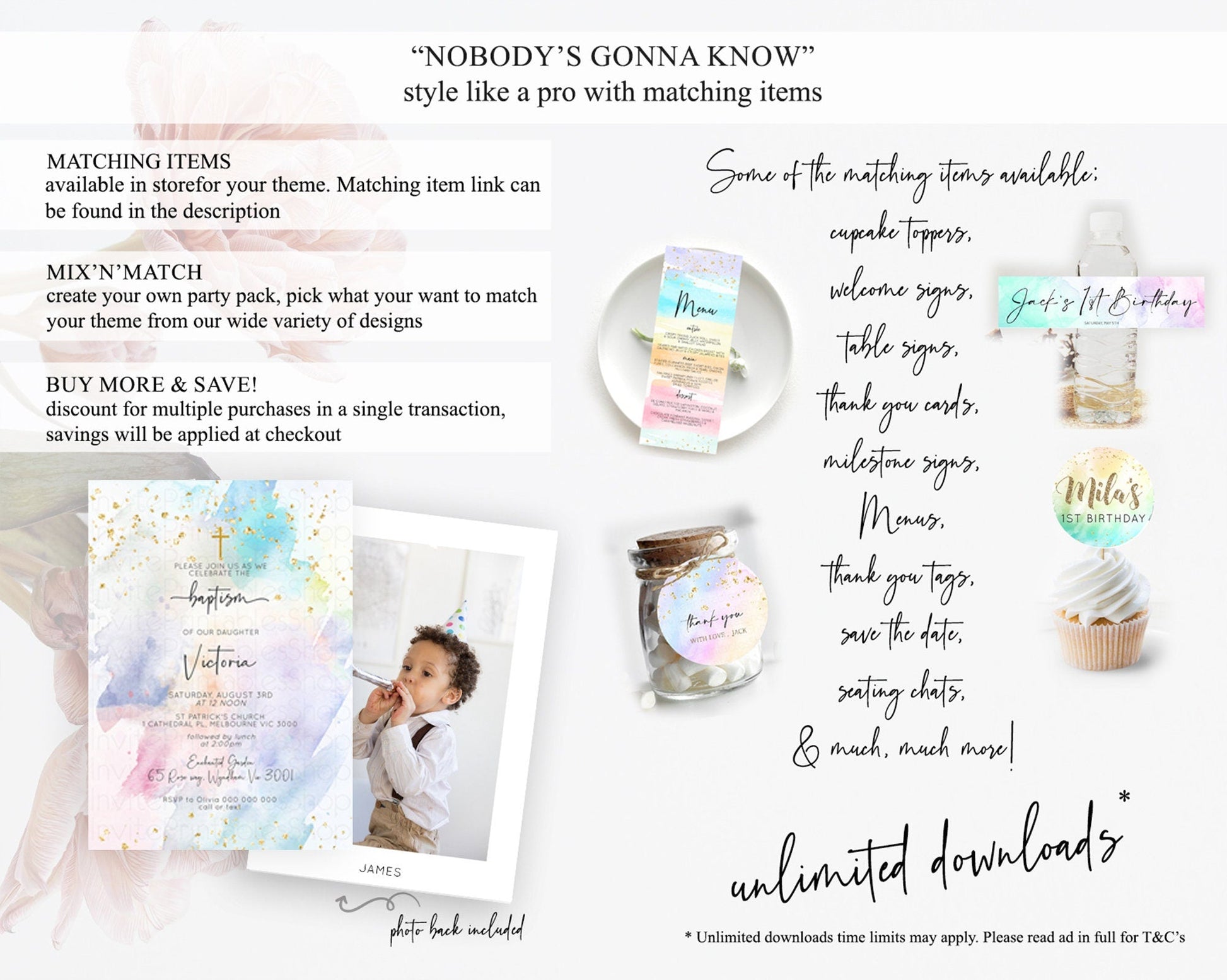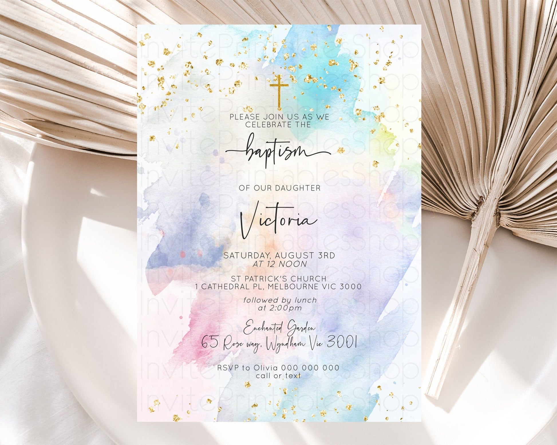 Pastel Baptism Invitation Pastel Colors Watercolor Baptism 1st Birthday Party Gold Ombre Pastel Rainbow Christening Holy Communion D10424