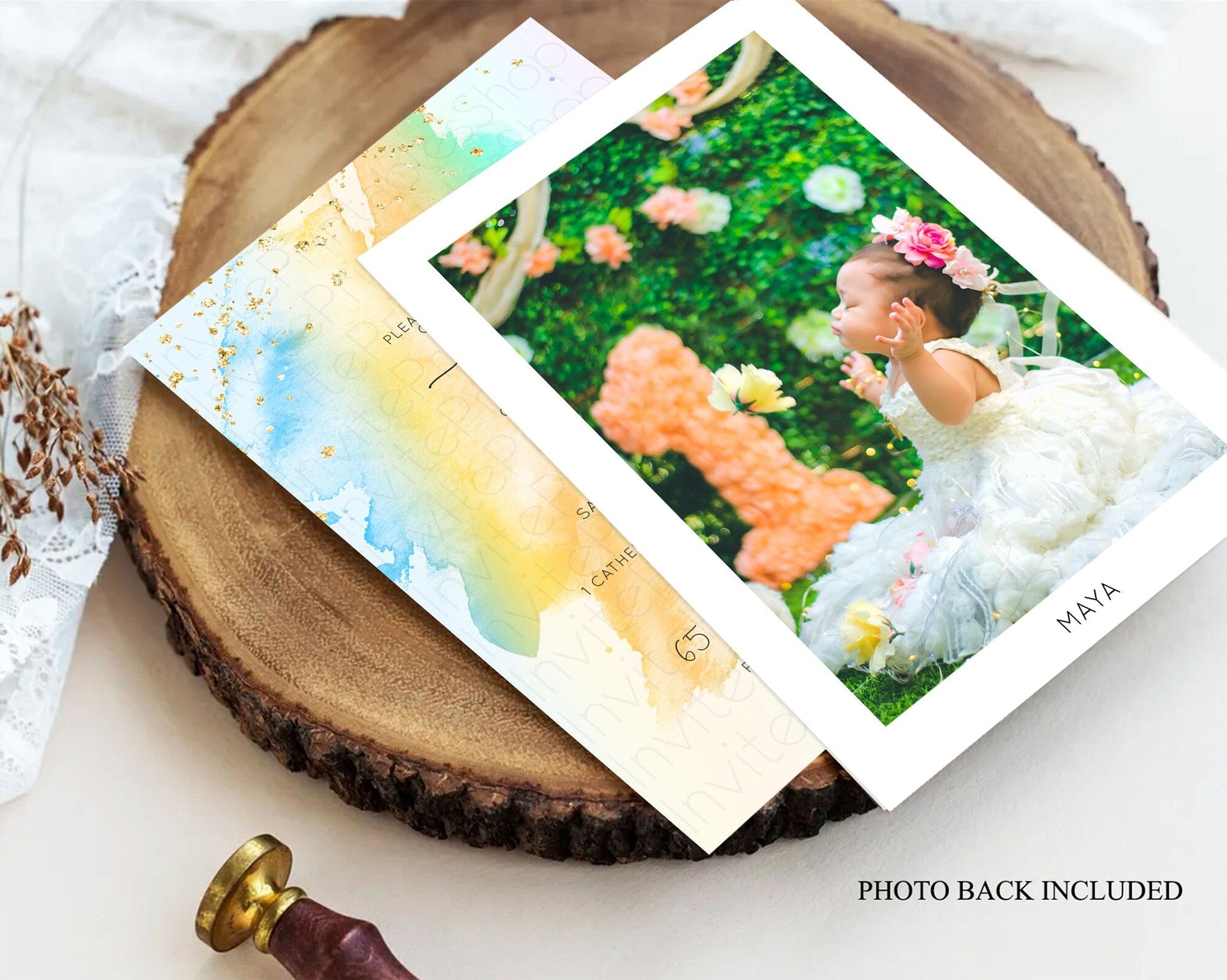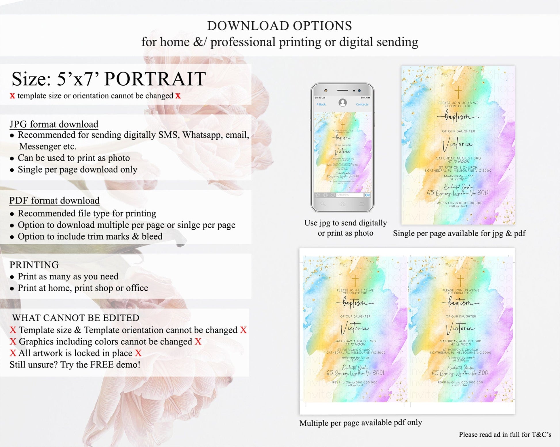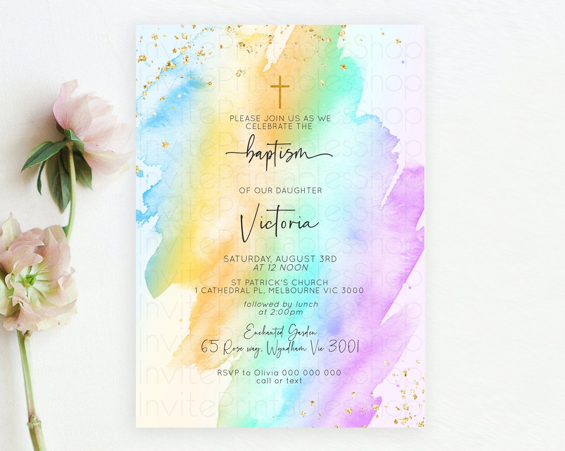 Pastel Baptism Invitation Pastel Colors Watercolor Baptism 1st Birthday Party Gold Ombre Pastel Rainbow Christening Holy Communion D10425