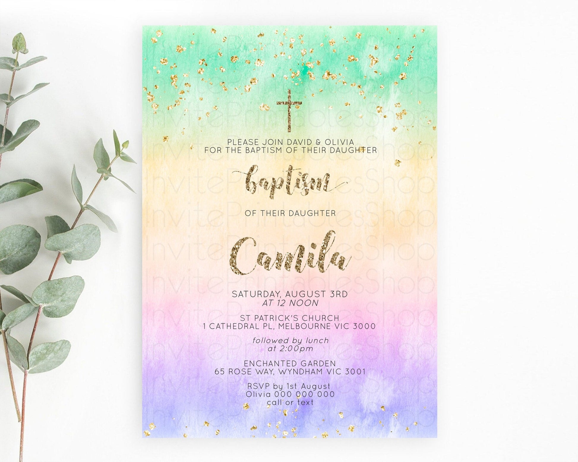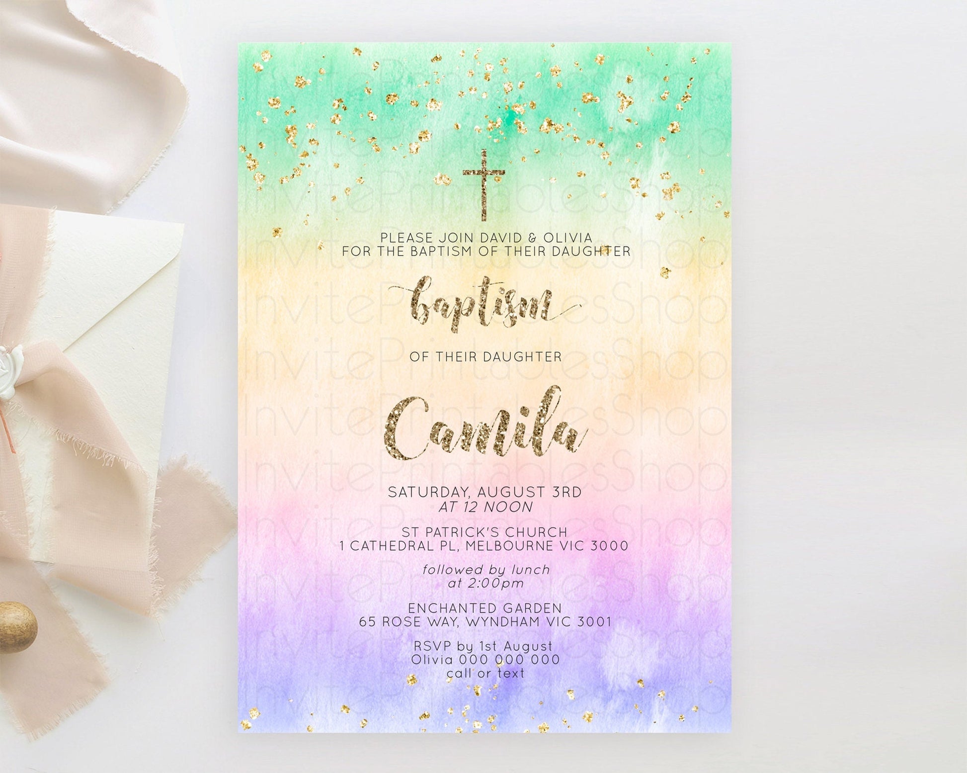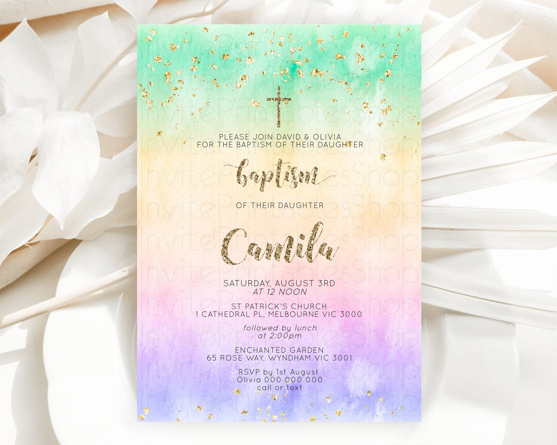 Pastel Baptism Invitation Pastel Colors Watercolor Baptism 1st Birthday Party Gold Ombre Pastel Rainbow Christening Holy Communion D10478