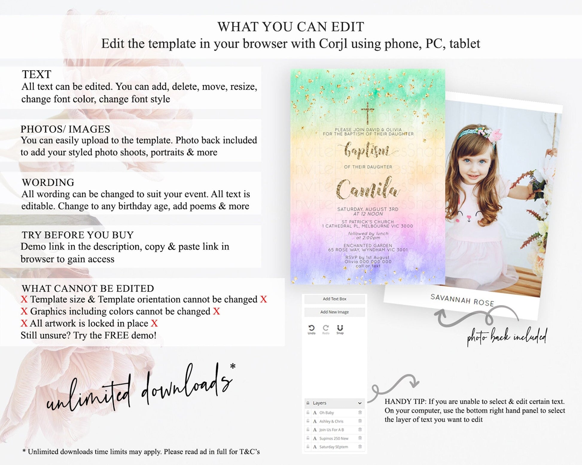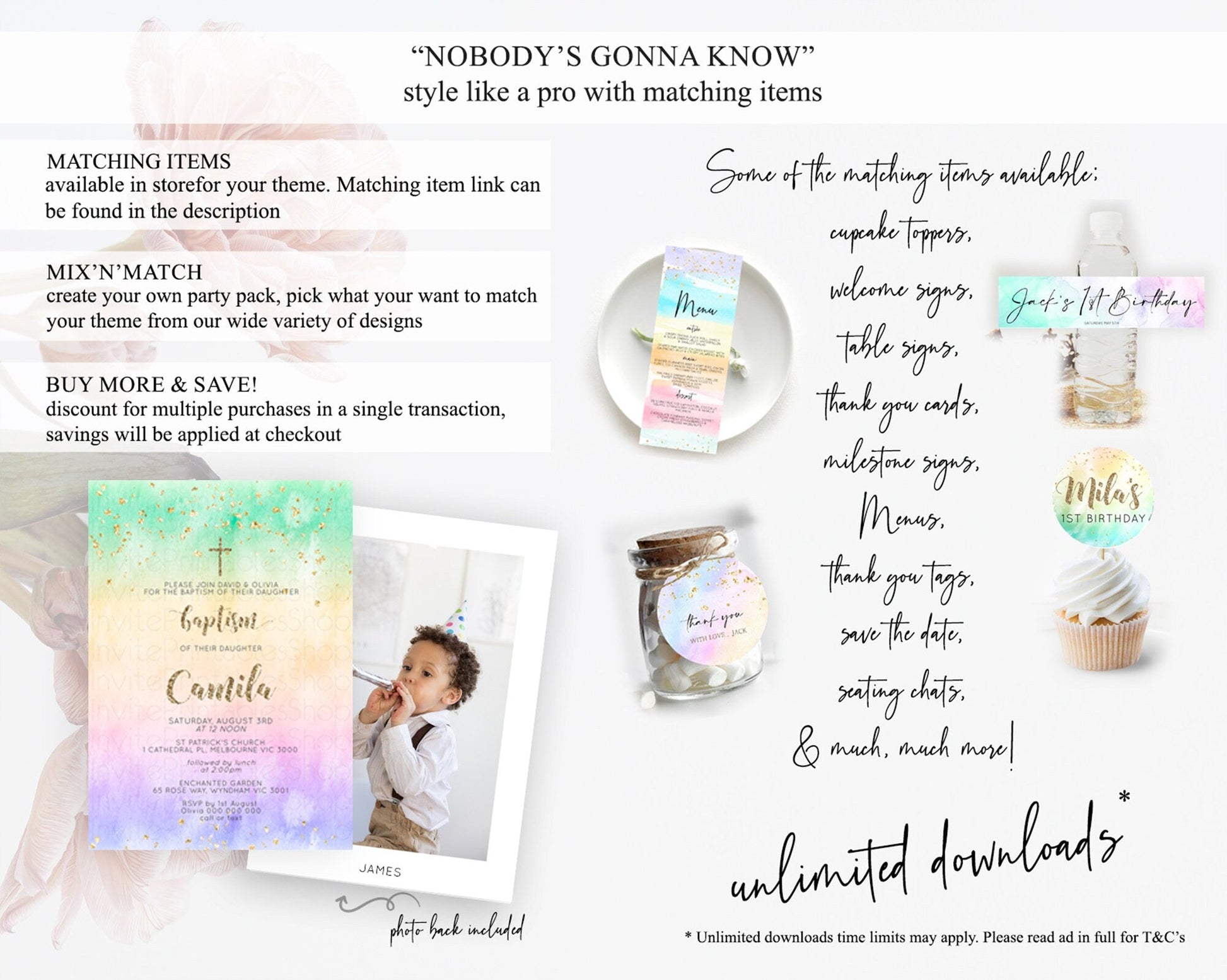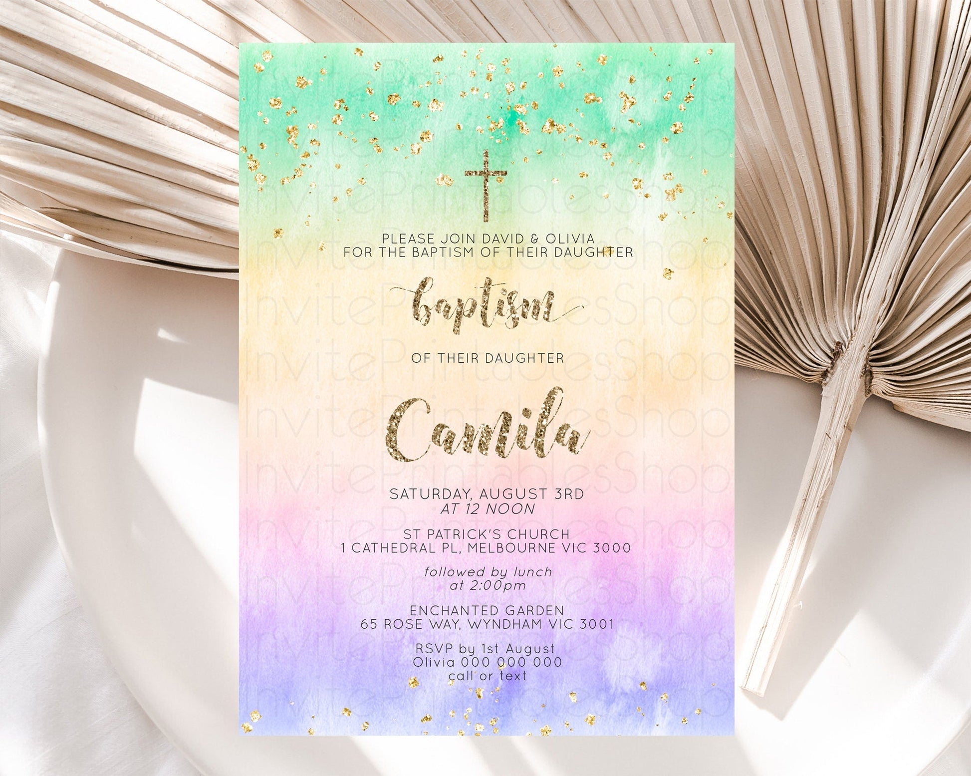 Pastel Baptism Invitation Pastel Colors Watercolor Baptism 1st Birthday Party Gold Ombre Pastel Rainbow Christening Holy Communion D10478