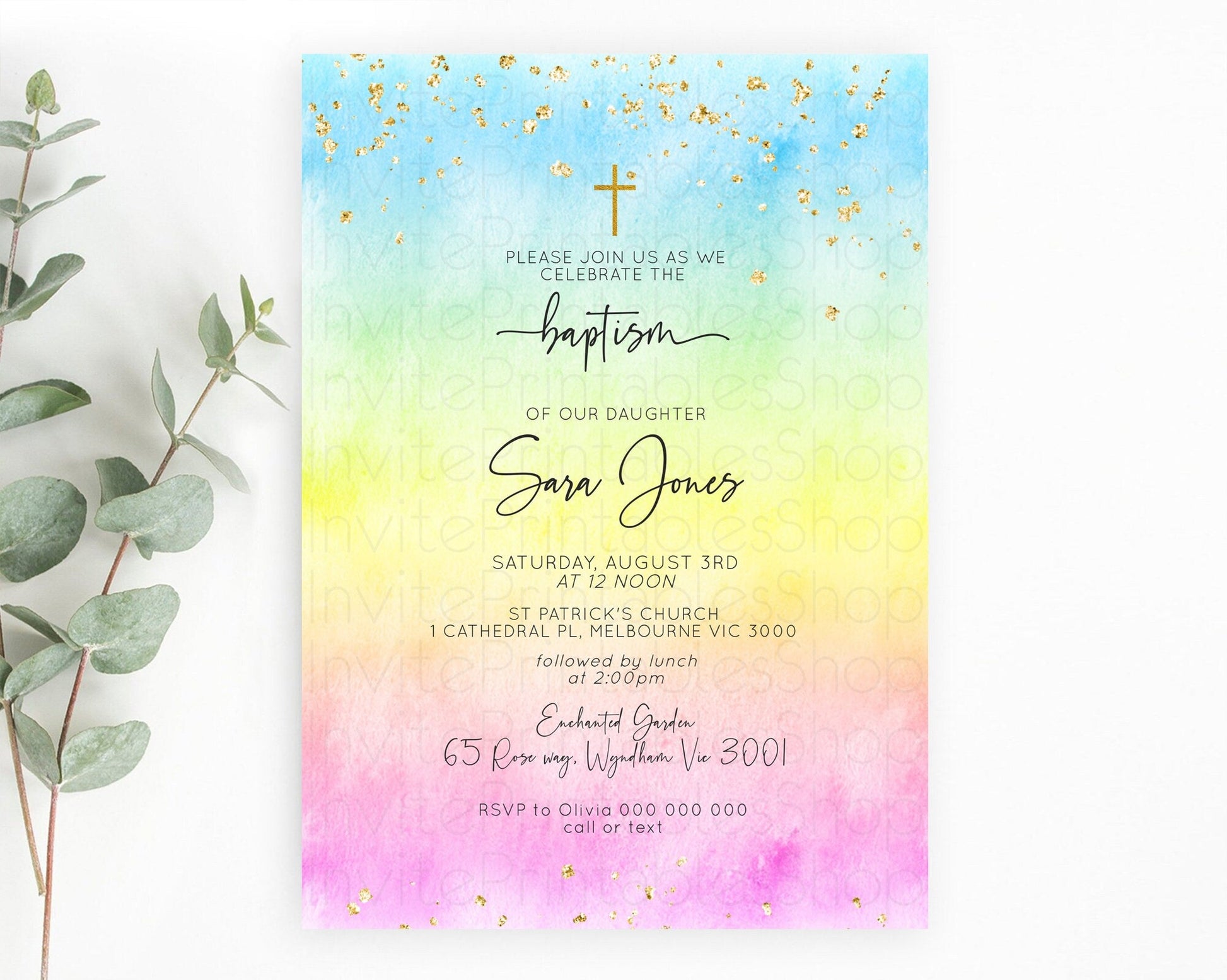 Pastel Baptism Invitation Pastel Colors Watercolor Baptism 1st Birthday Party Gold Ombre Pastel Rainbow Christening Holy Communion D10480