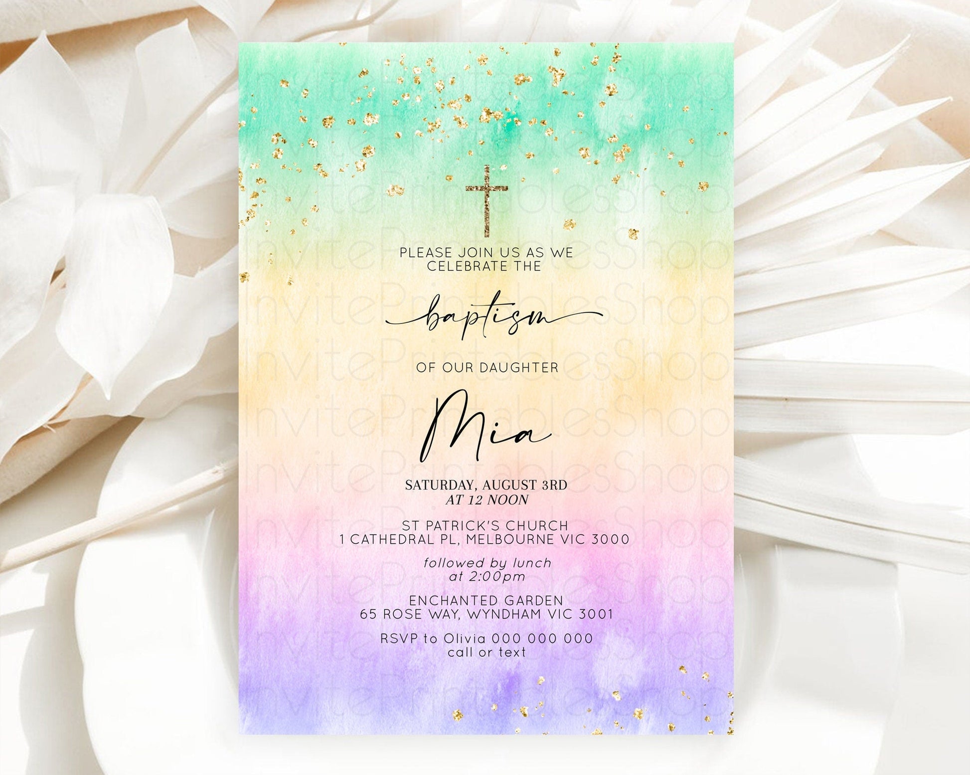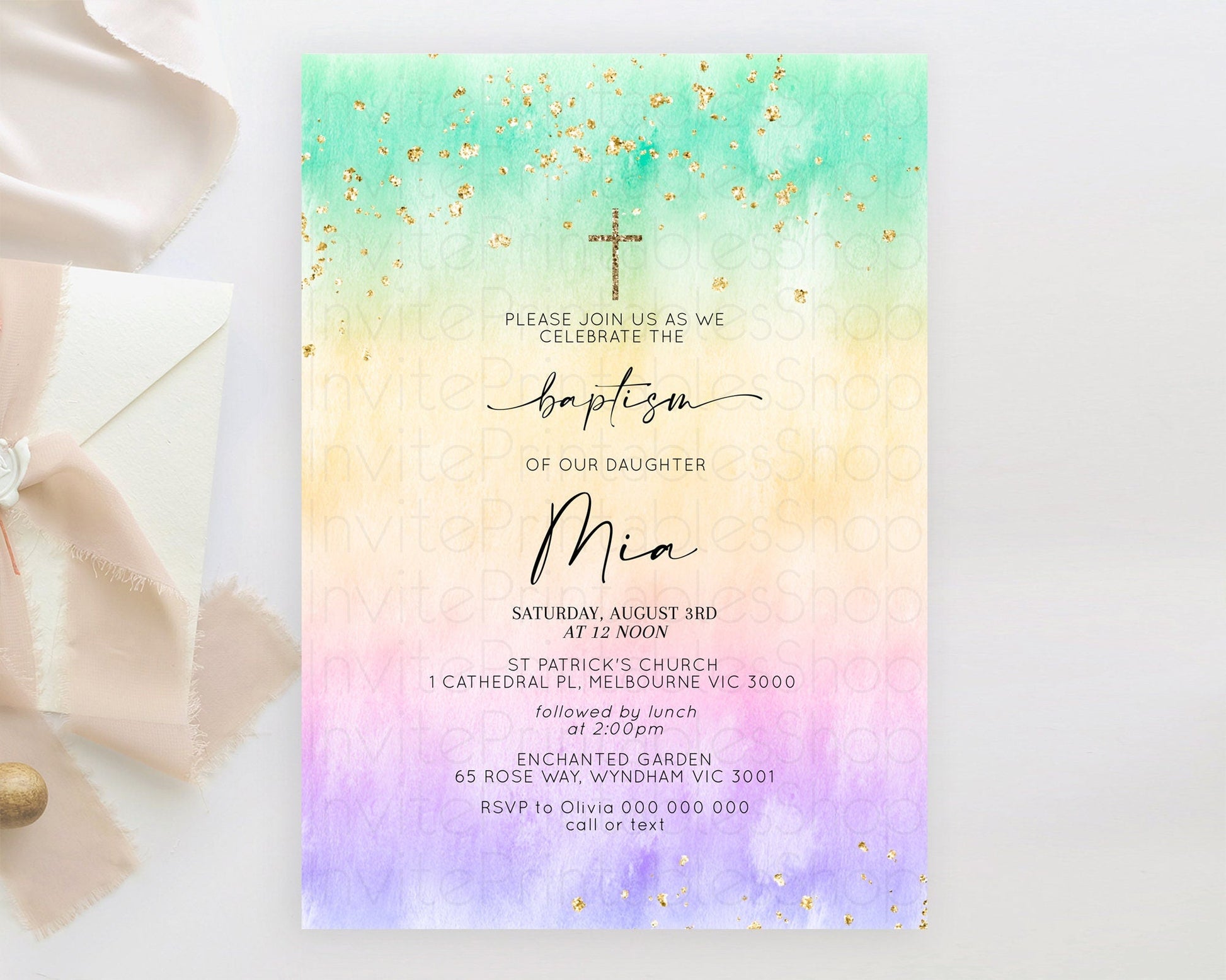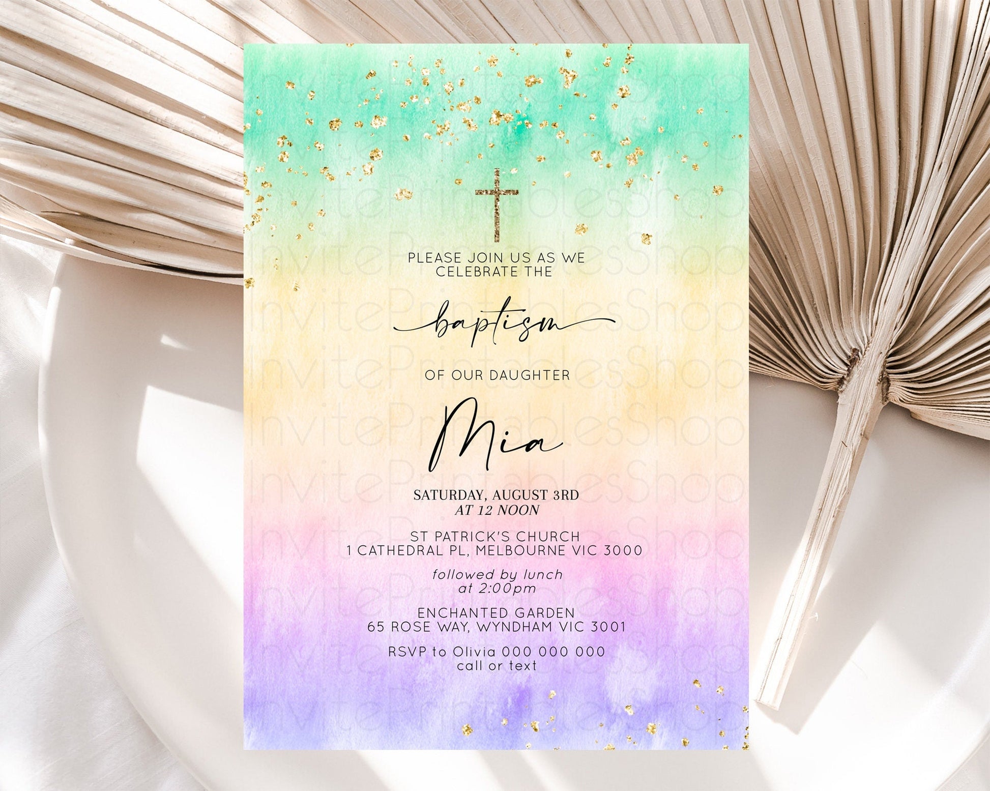 Pastel Baptism Invitation Pastel Colors Watercolor Baptism 1st Birthday Party Gold Ombre Pastel Rainbow Christening Holy Communion D10481