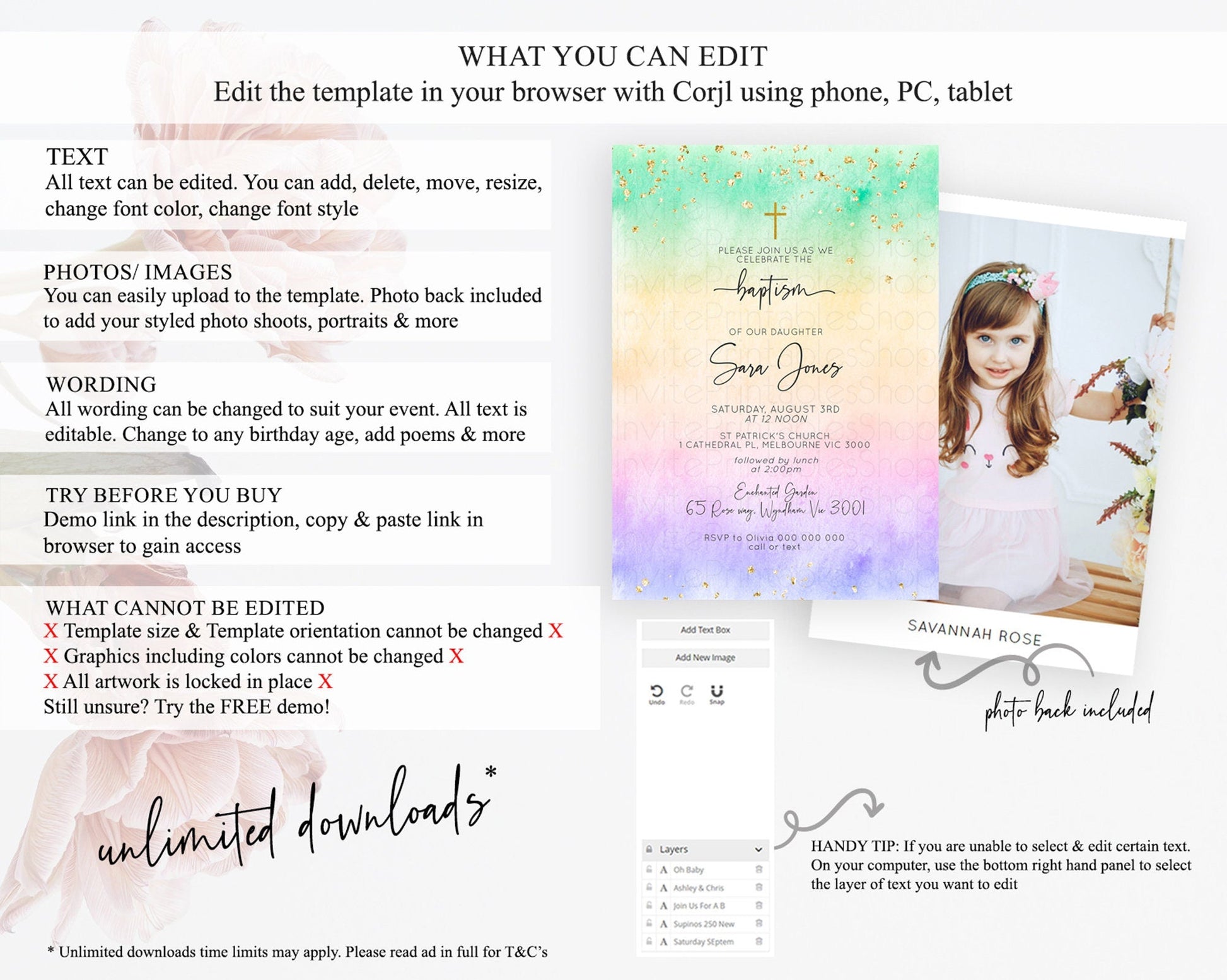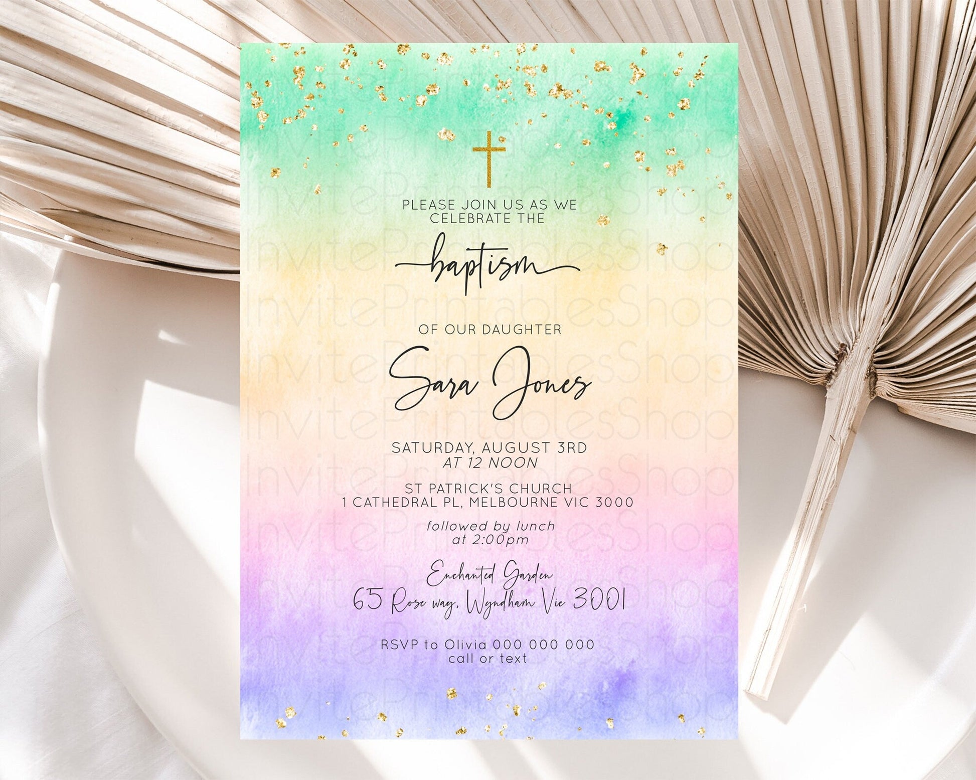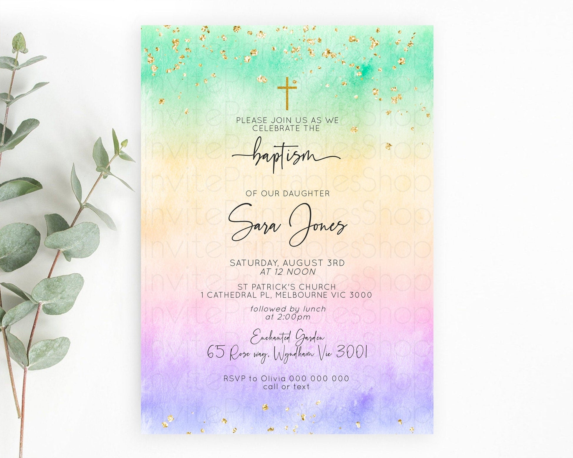 Pastel Baptism Invitation Pastel Colors Watercolor Baptism 1st Birthday Party Gold Ombre Pastel Rainbow Christening Holy Communion D10485