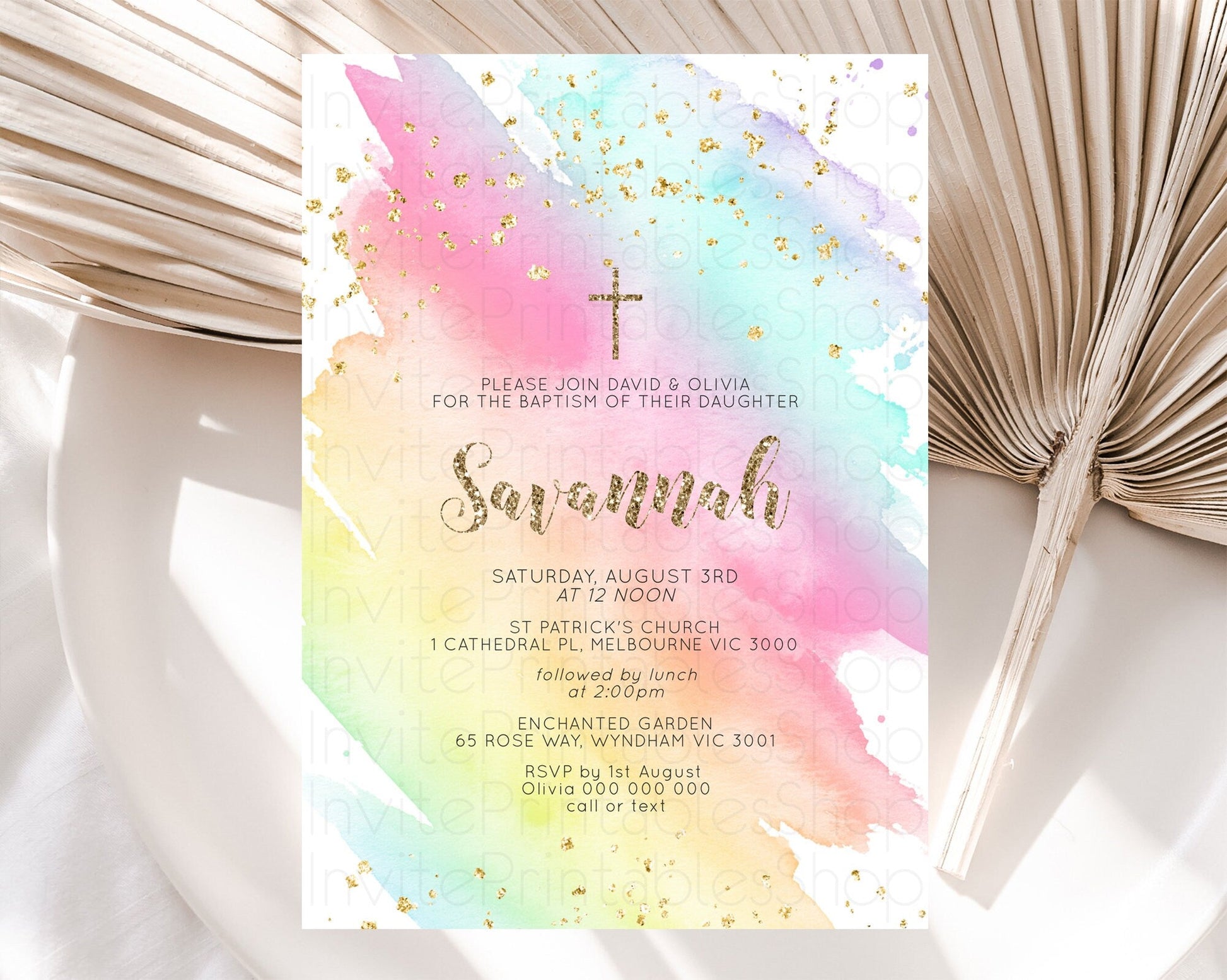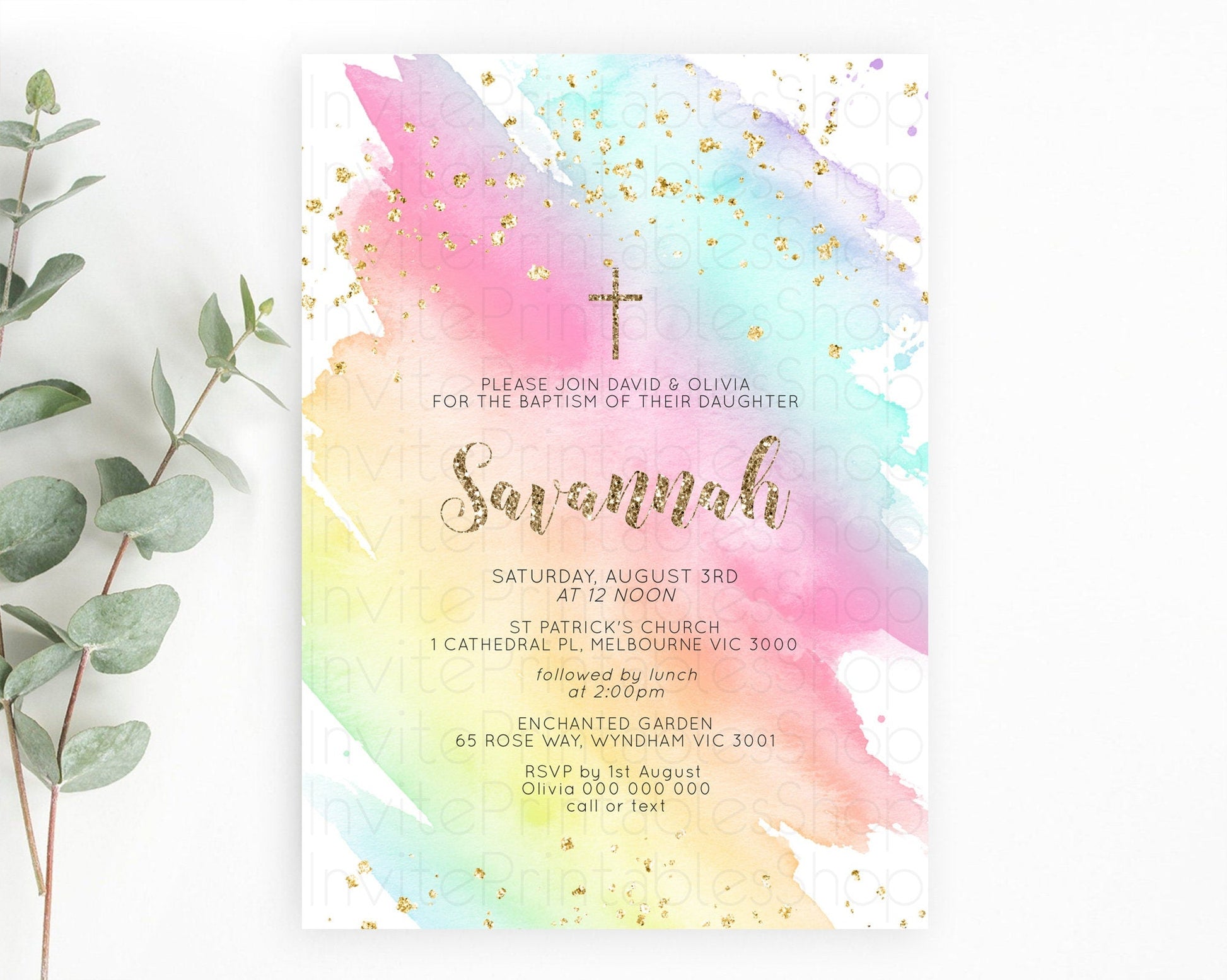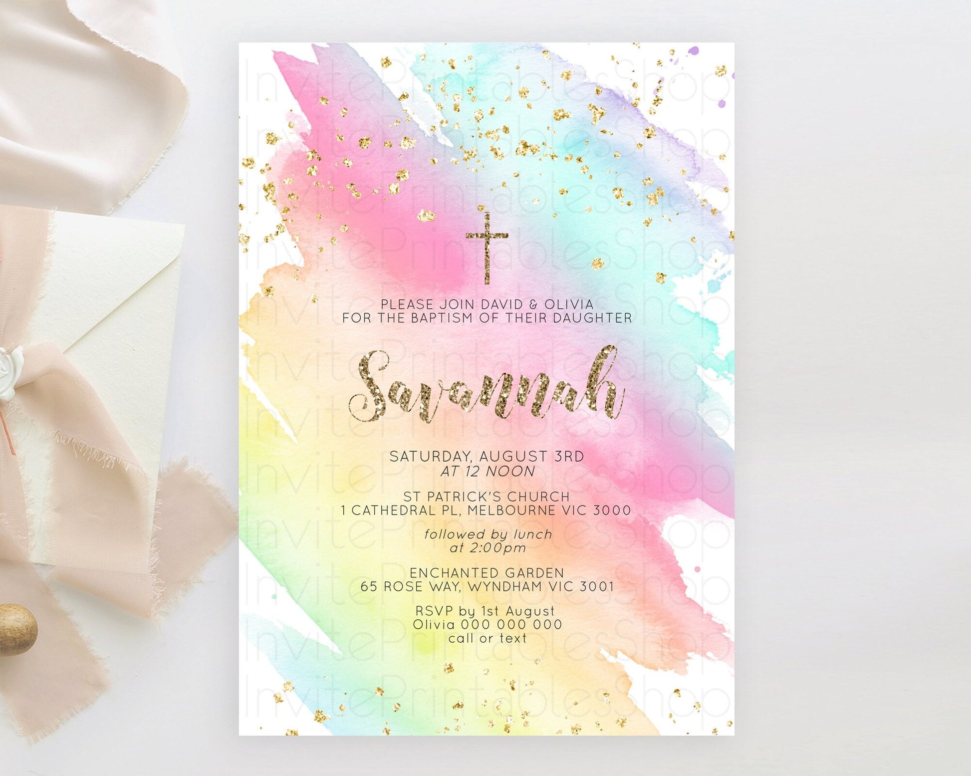 Pastel Baptism Invitation Pastel Colors Watercolor Baptism 1st Birthday Party Gold Ombre Pastel Rainbow Christening Holy Communion D10495