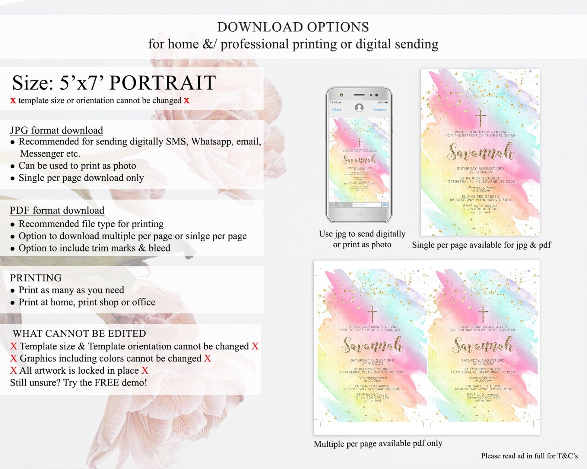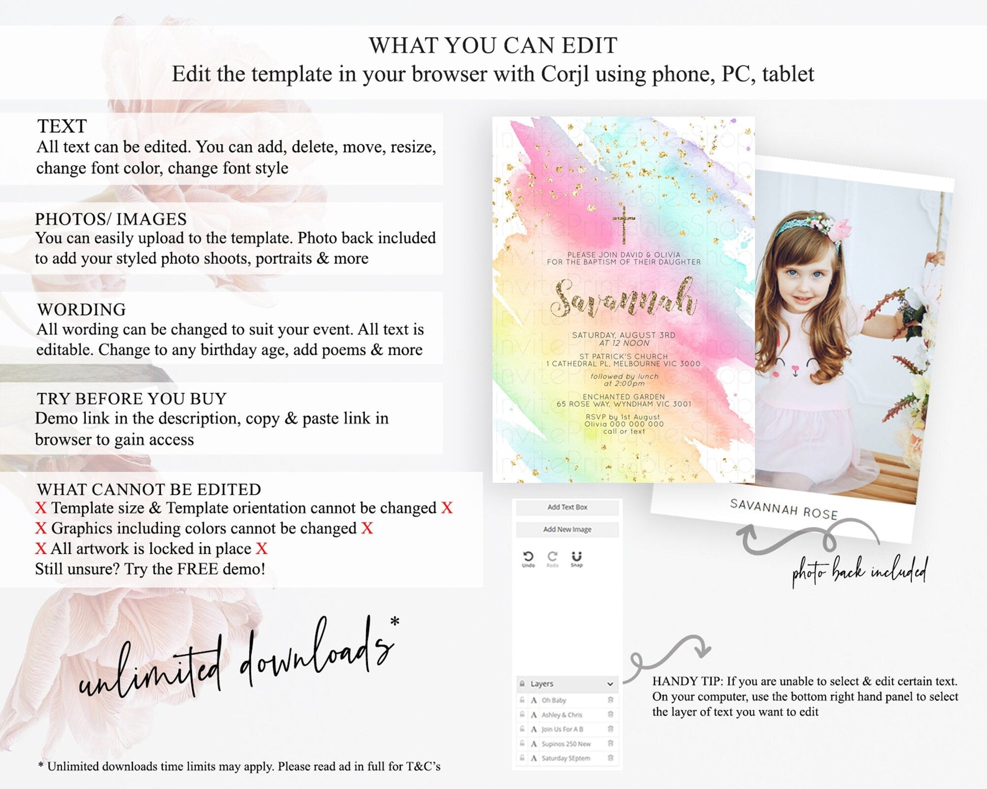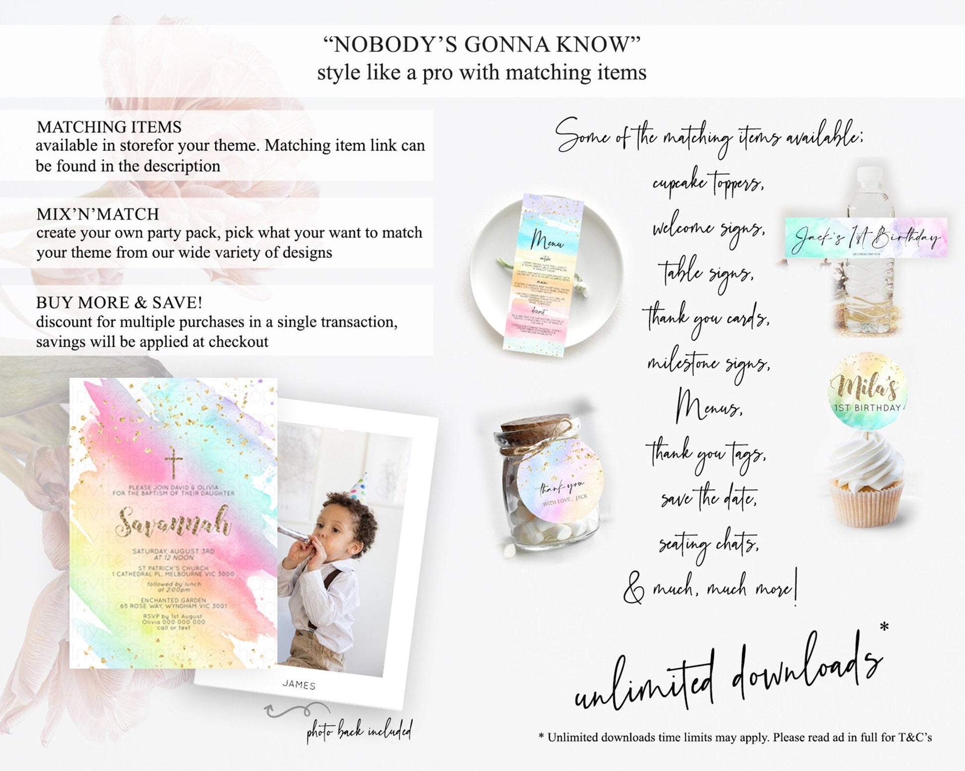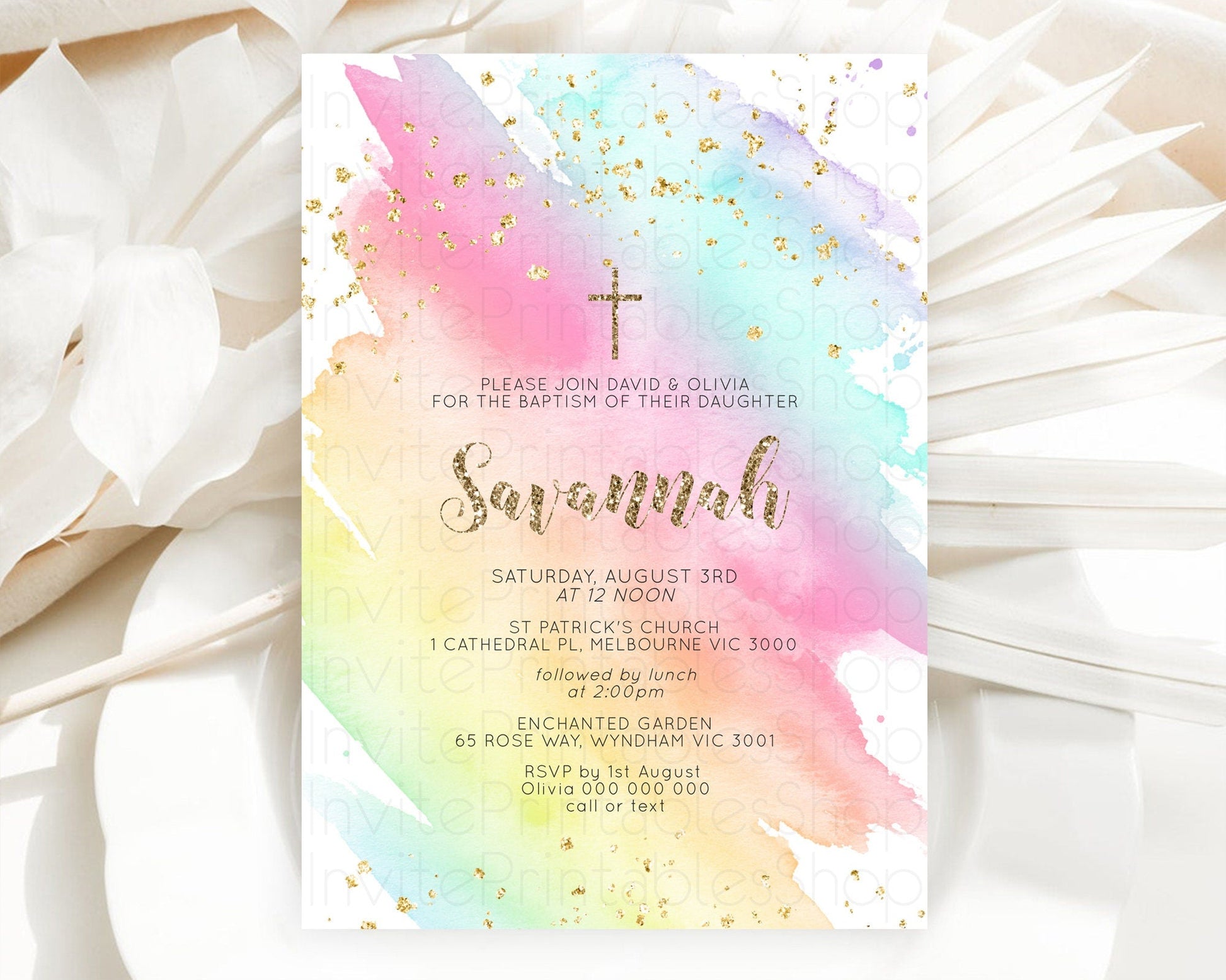 Pastel Baptism Invitation Pastel Colors Watercolor Baptism 1st Birthday Party Gold Ombre Pastel Rainbow Christening Holy Communion D10495