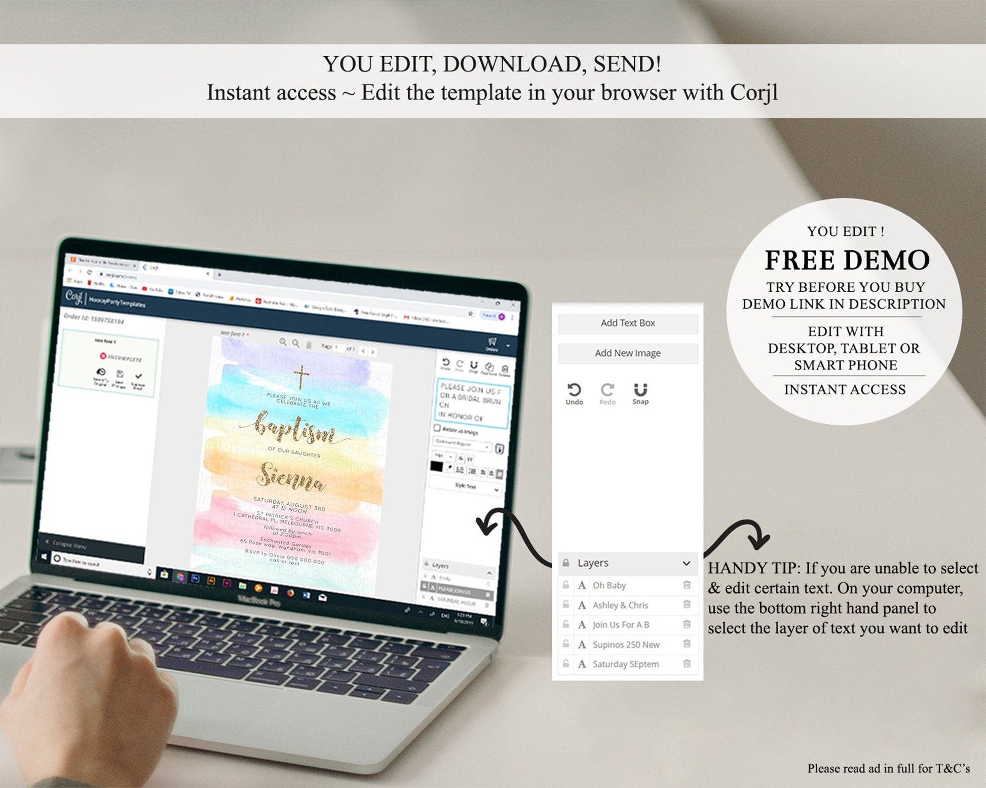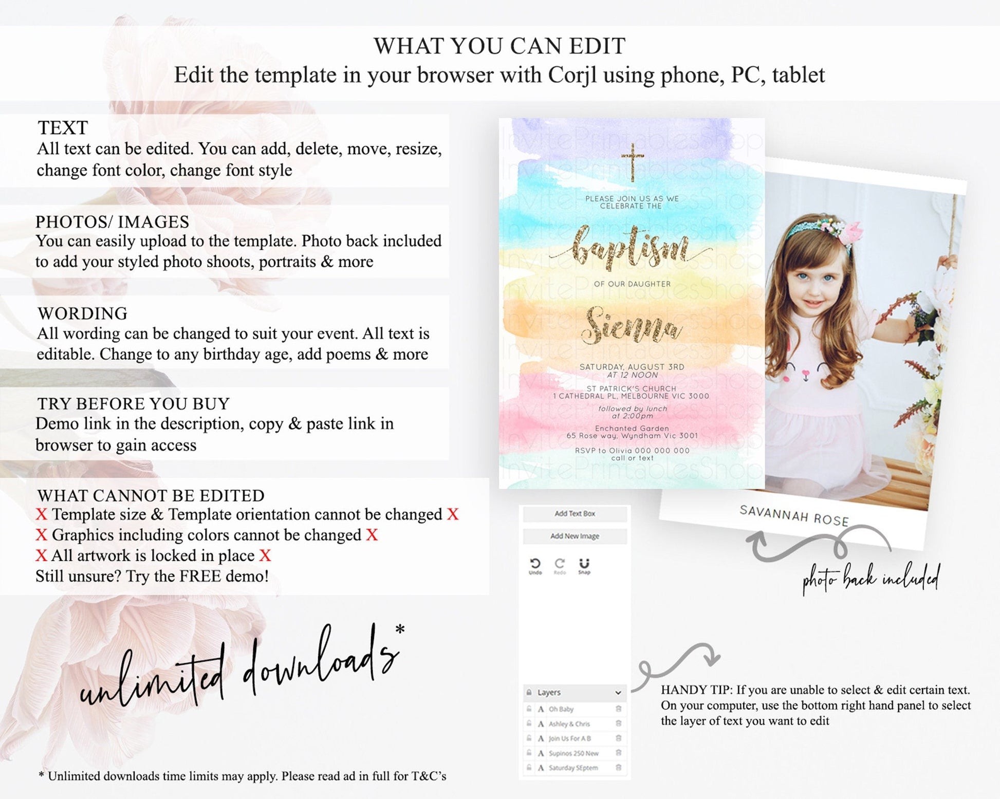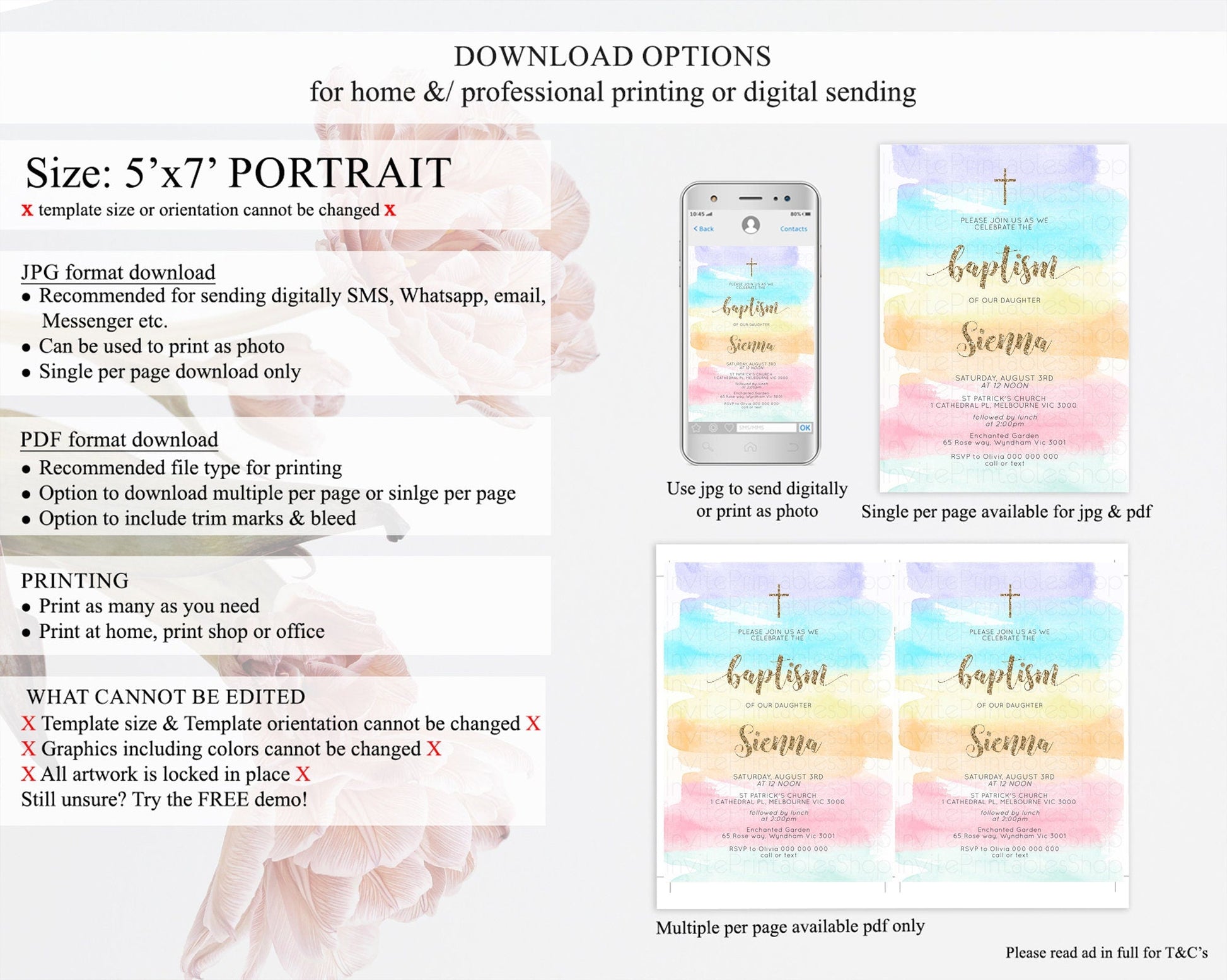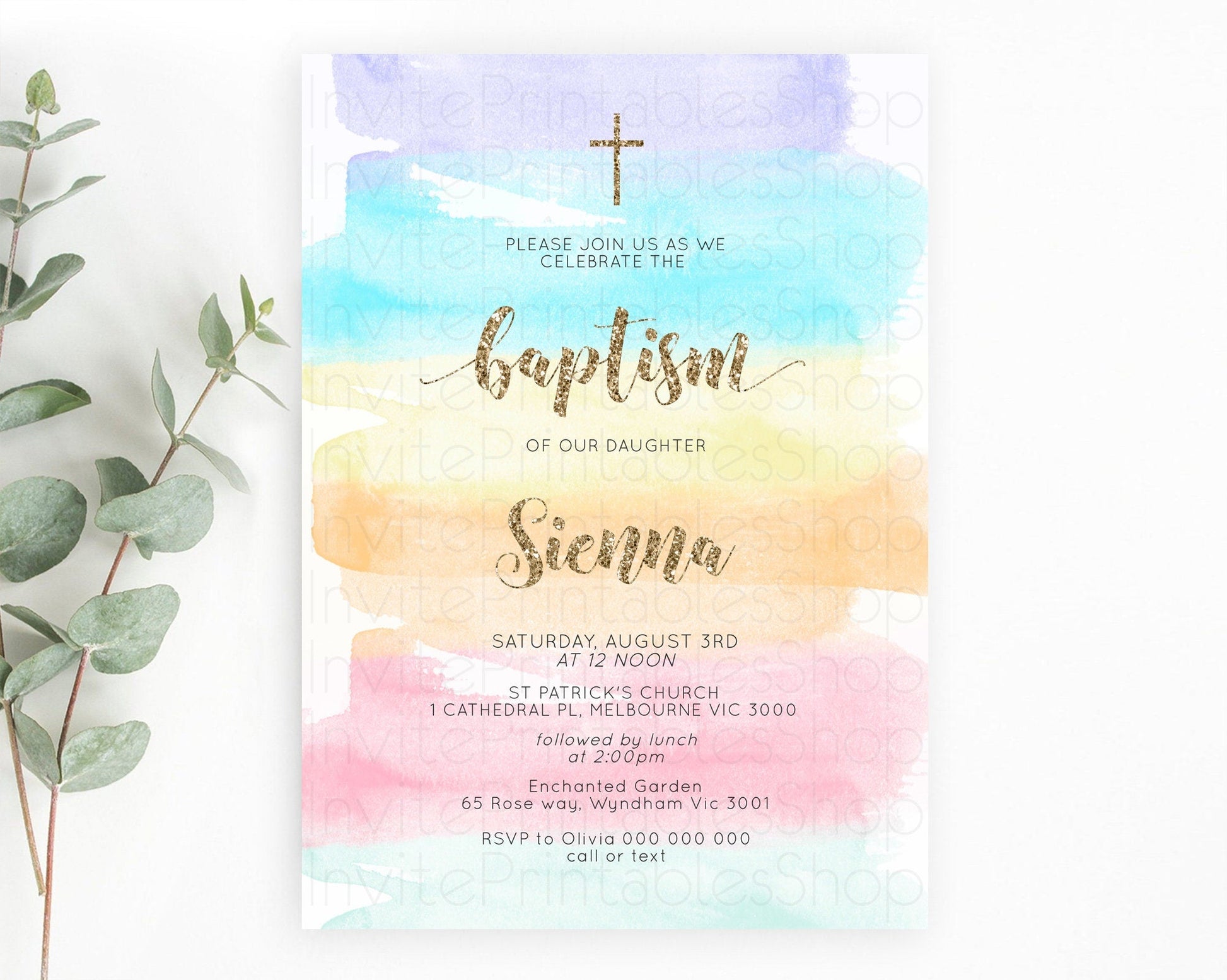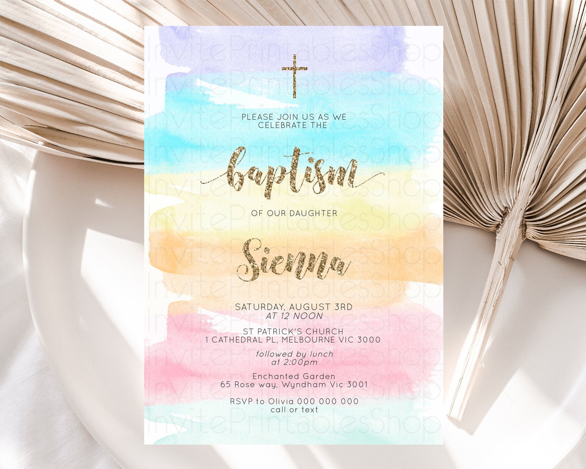 Pastel Baptism Invitation Pastel Colors Watercolor Baptism 1st Birthday Party Gold Ombre Pastel Rainbow Christening Holy Communion D10508