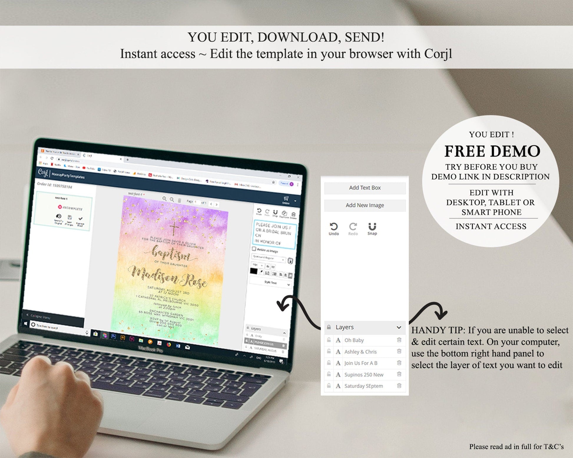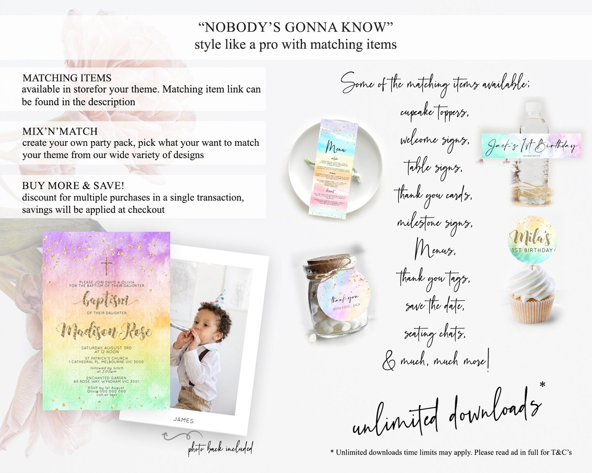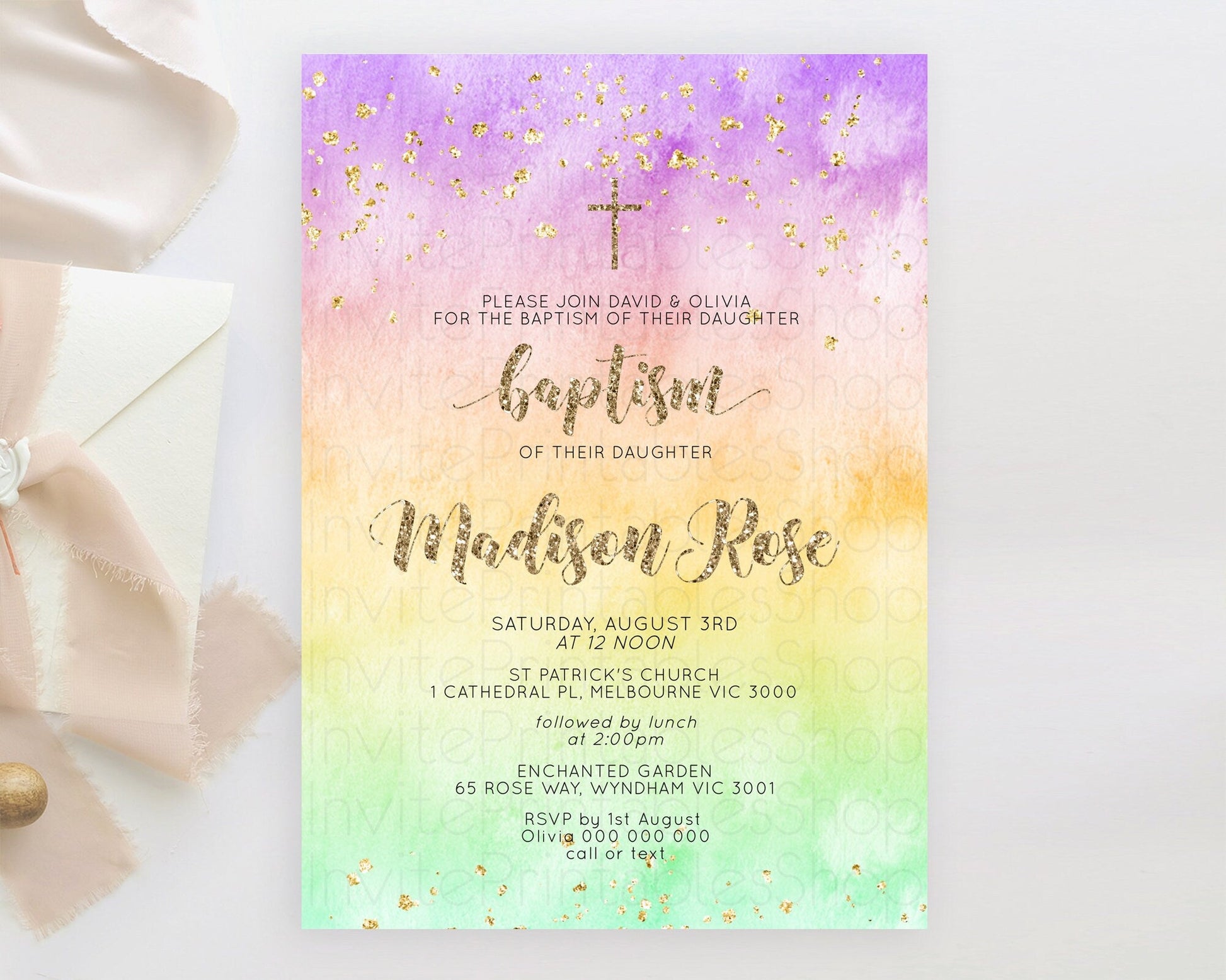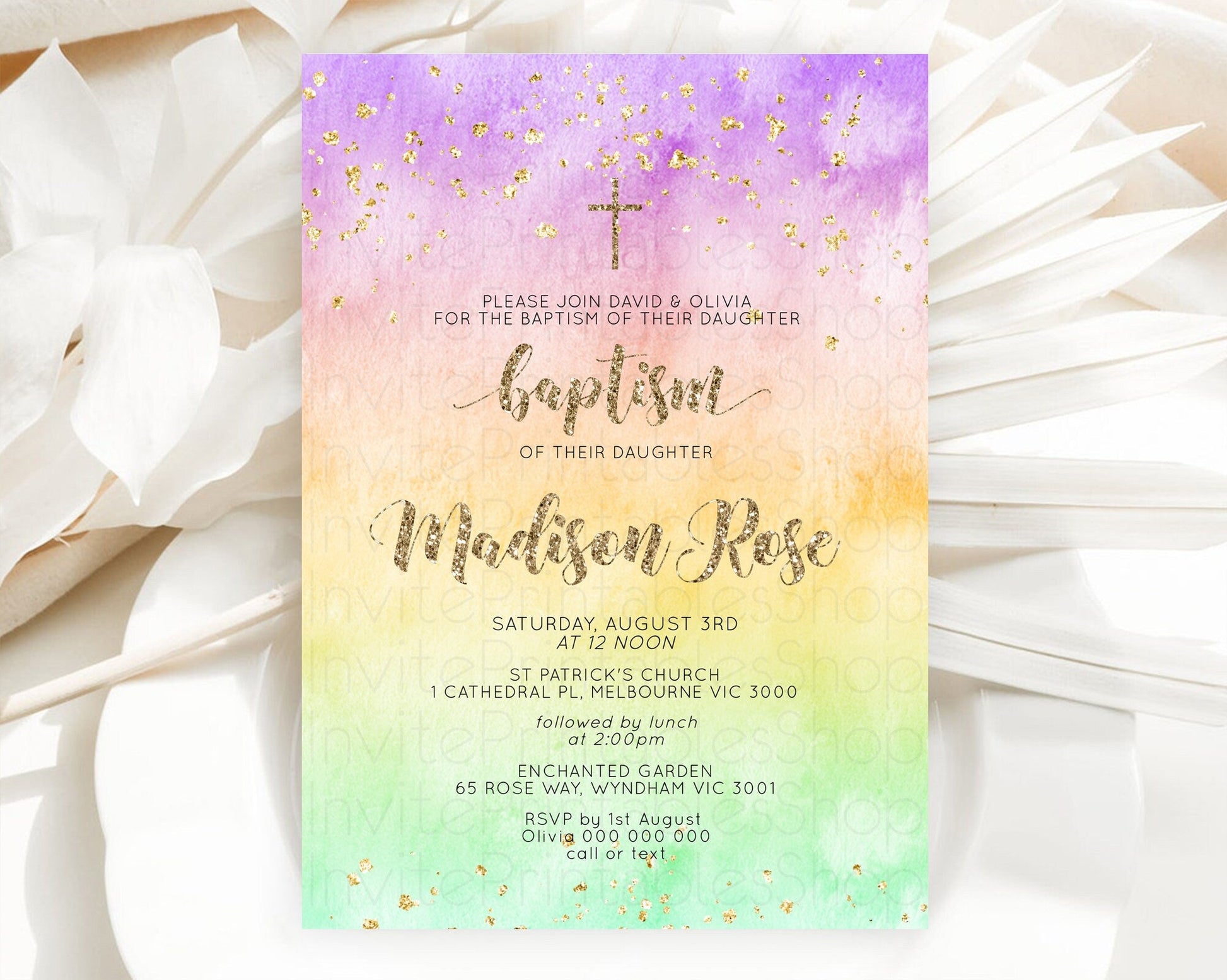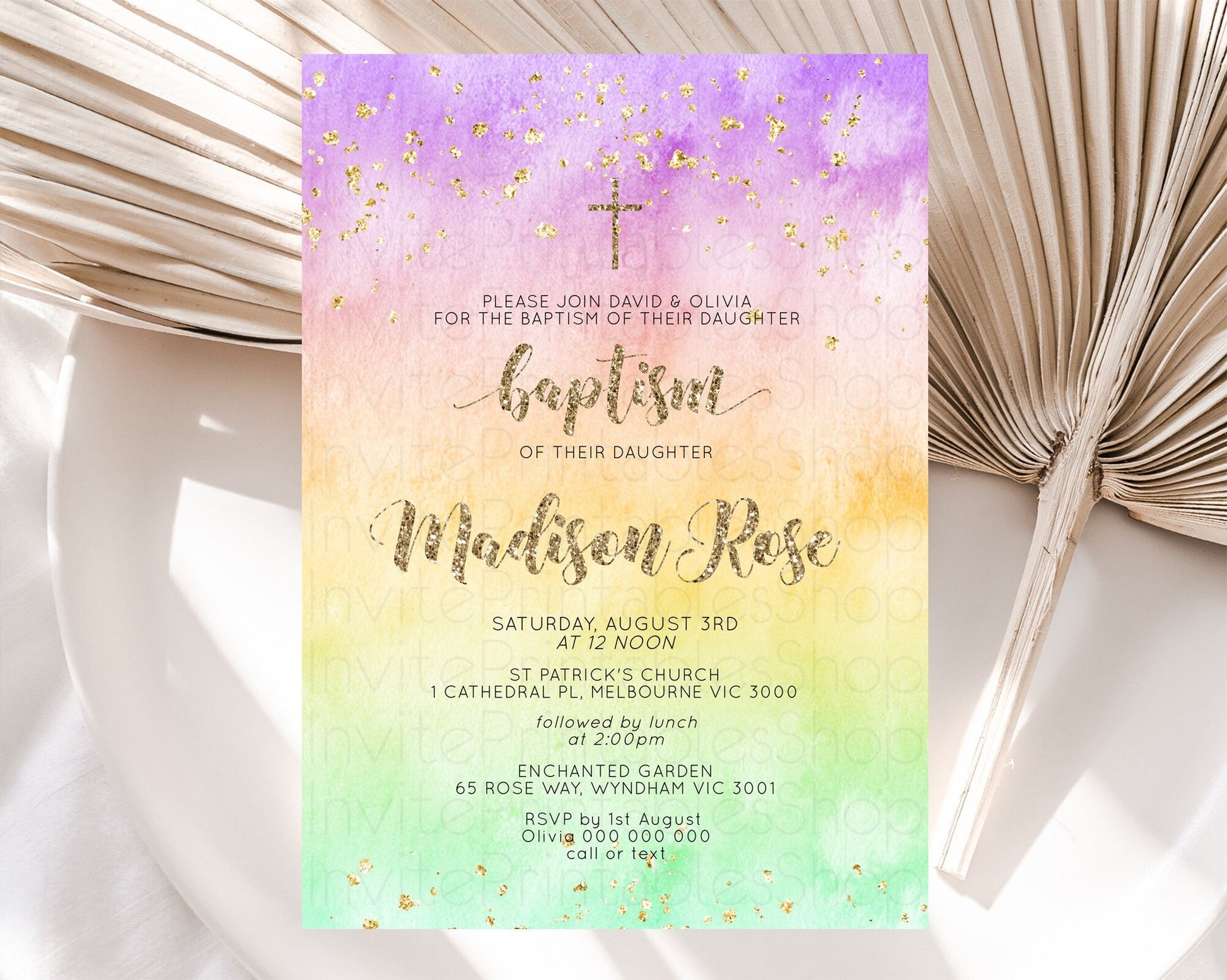 Pastel Baptism Invitation Pastel Colors Watercolor Baptism 1st Birthday Party Gold Ombre Pastel Rainbow Christening Holy Communion D10512