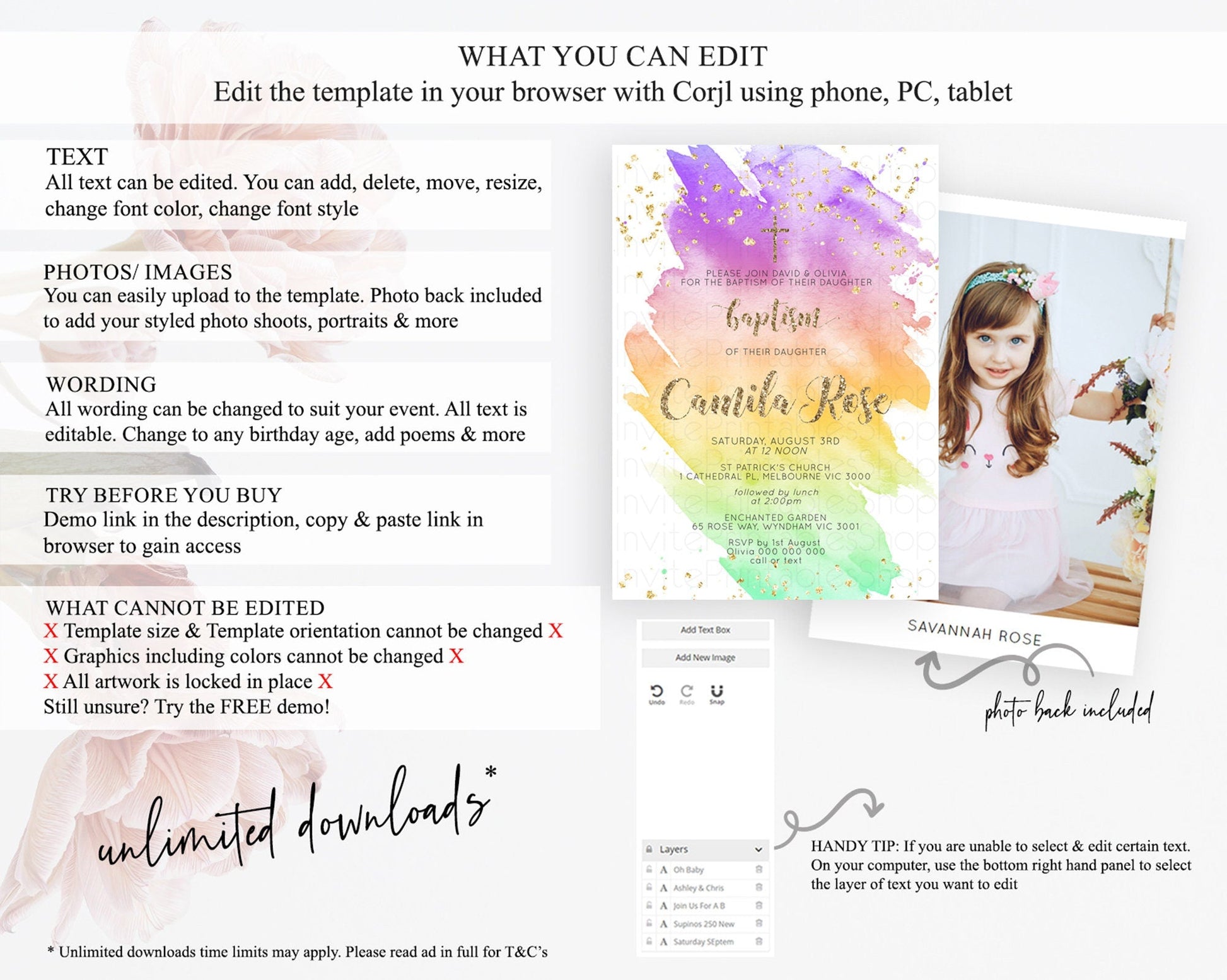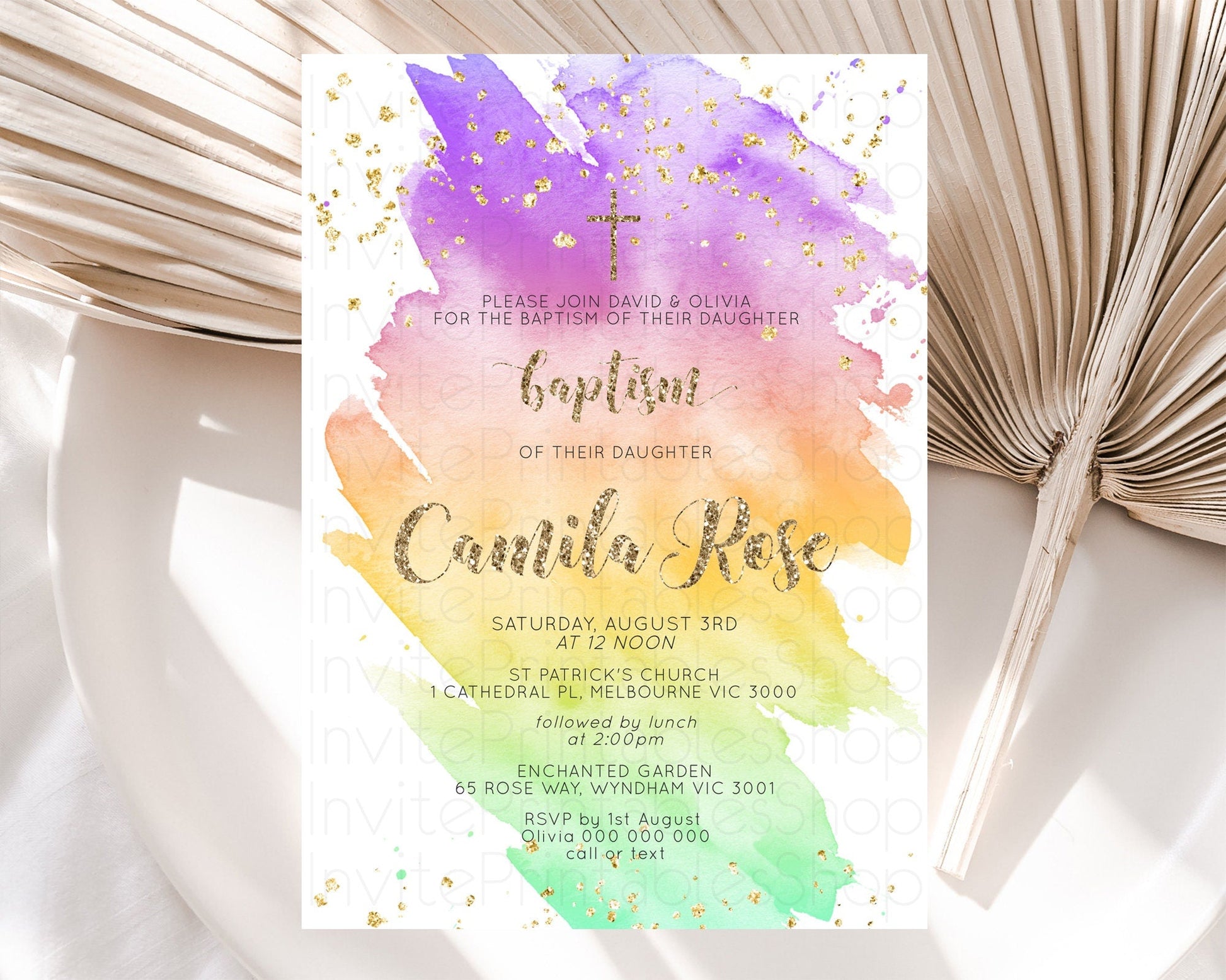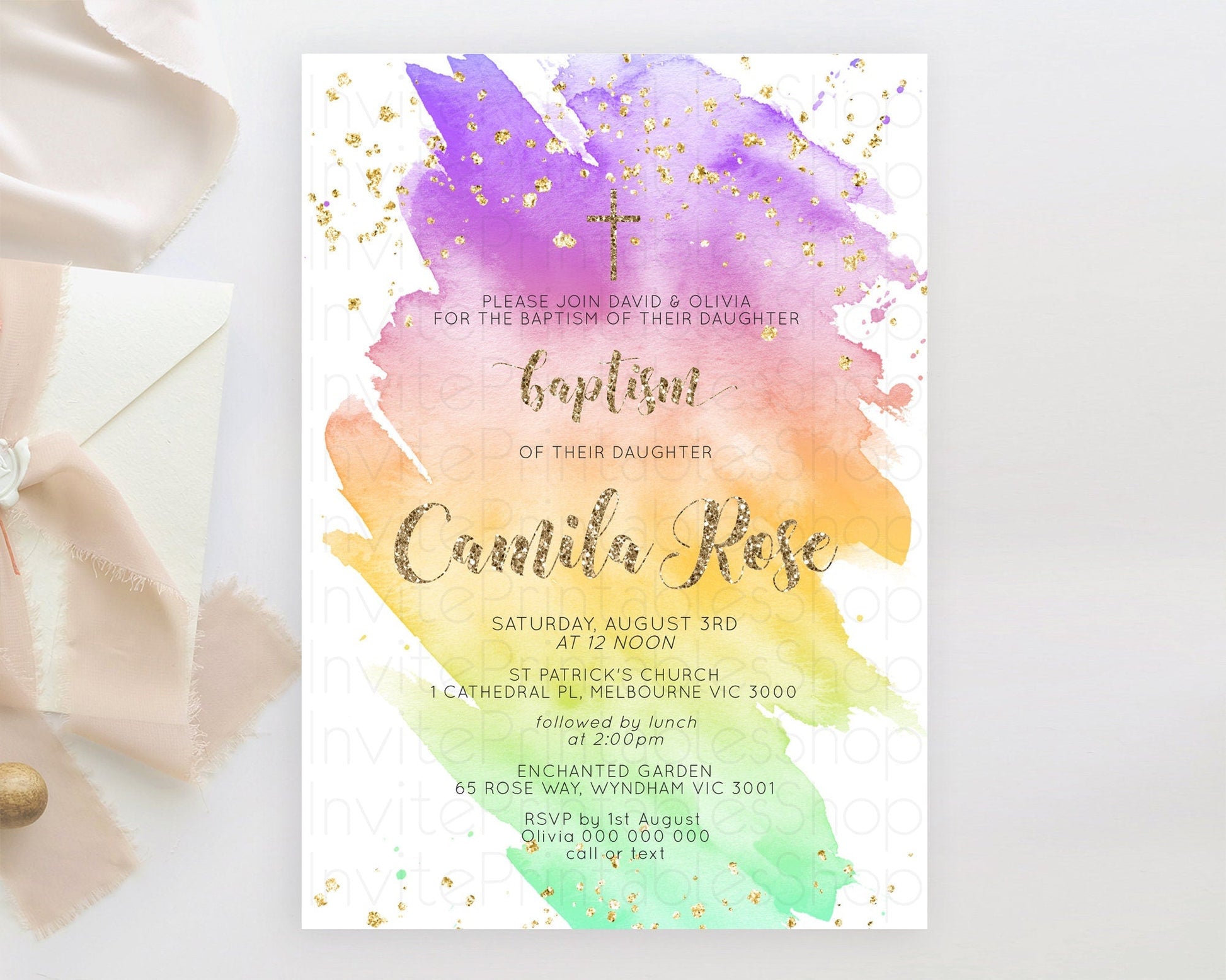 Pastel Baptism Invitation Pastel Colors Watercolor Baptism 1st Birthday Party Gold Ombre Pastel Rainbow Christening Holy Communion D10517