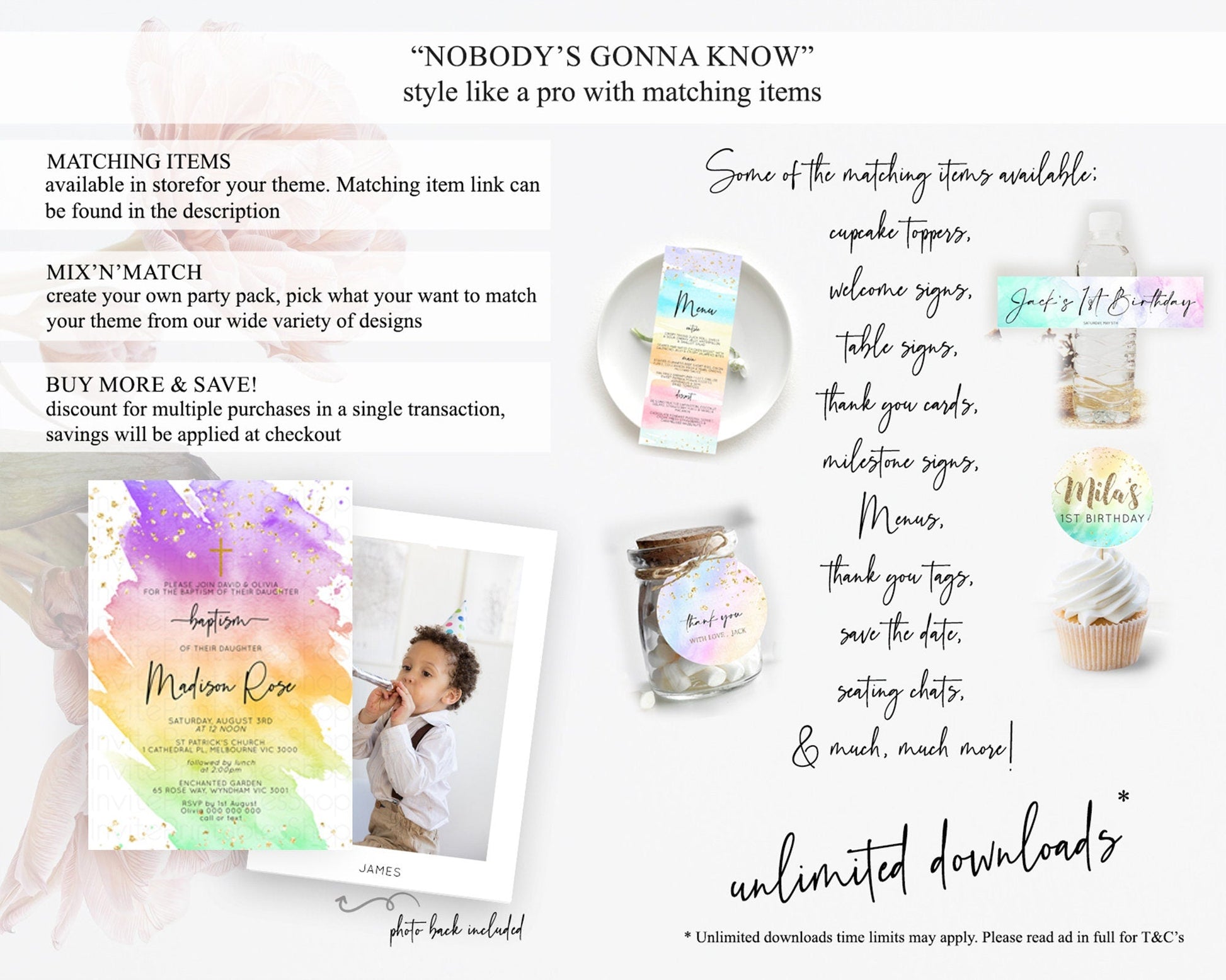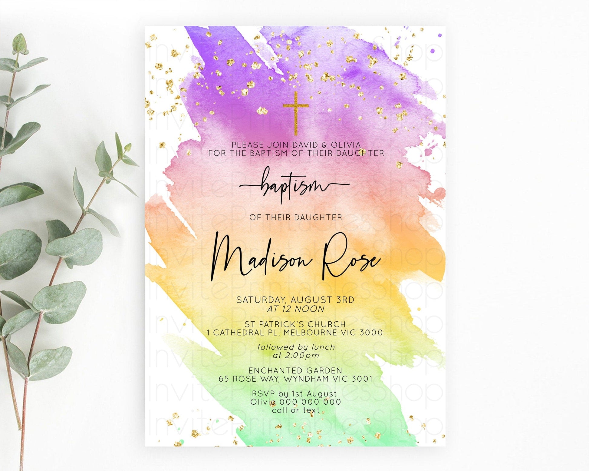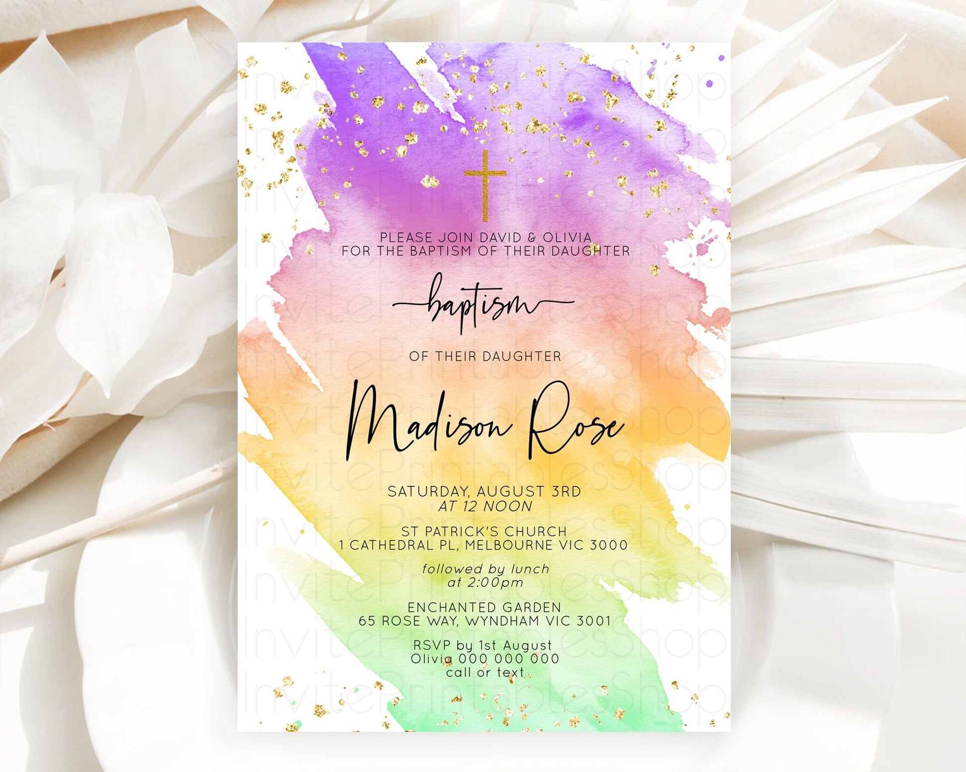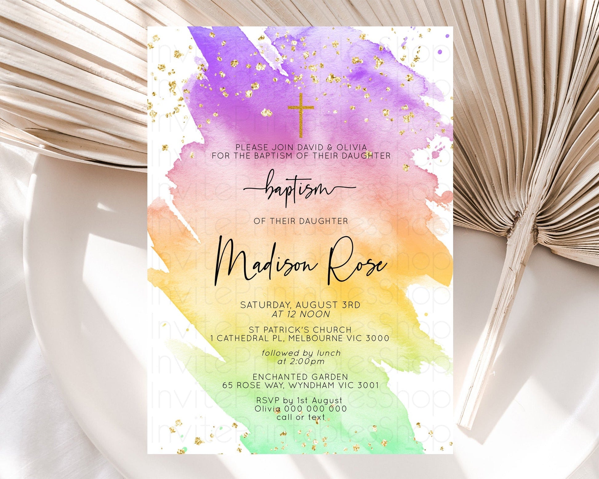 Pastel Baptism Invitation Pastel Colors Watercolor Baptism 1st Birthday Party Gold Ombre Pastel Rainbow Christening Holy Communion D10518