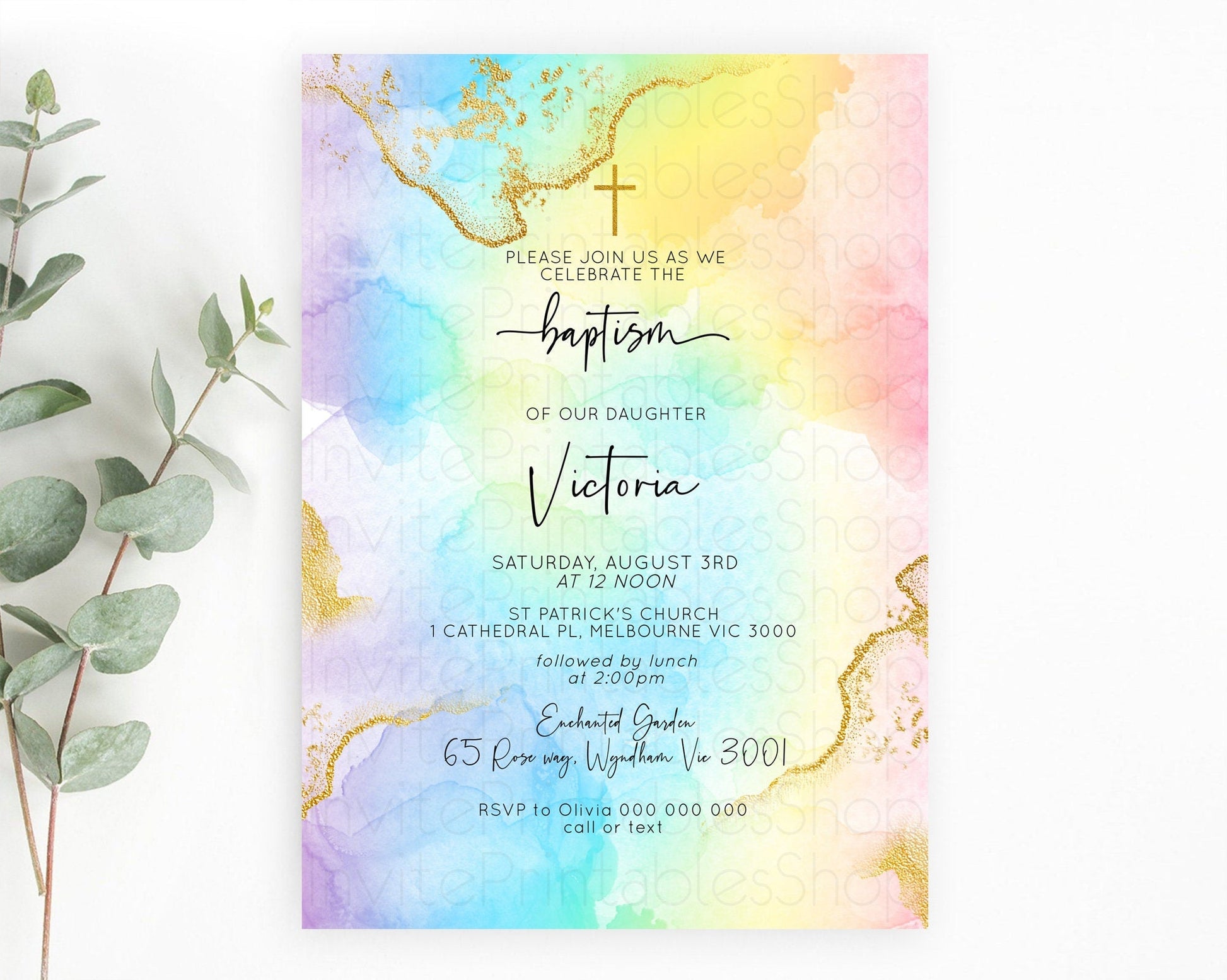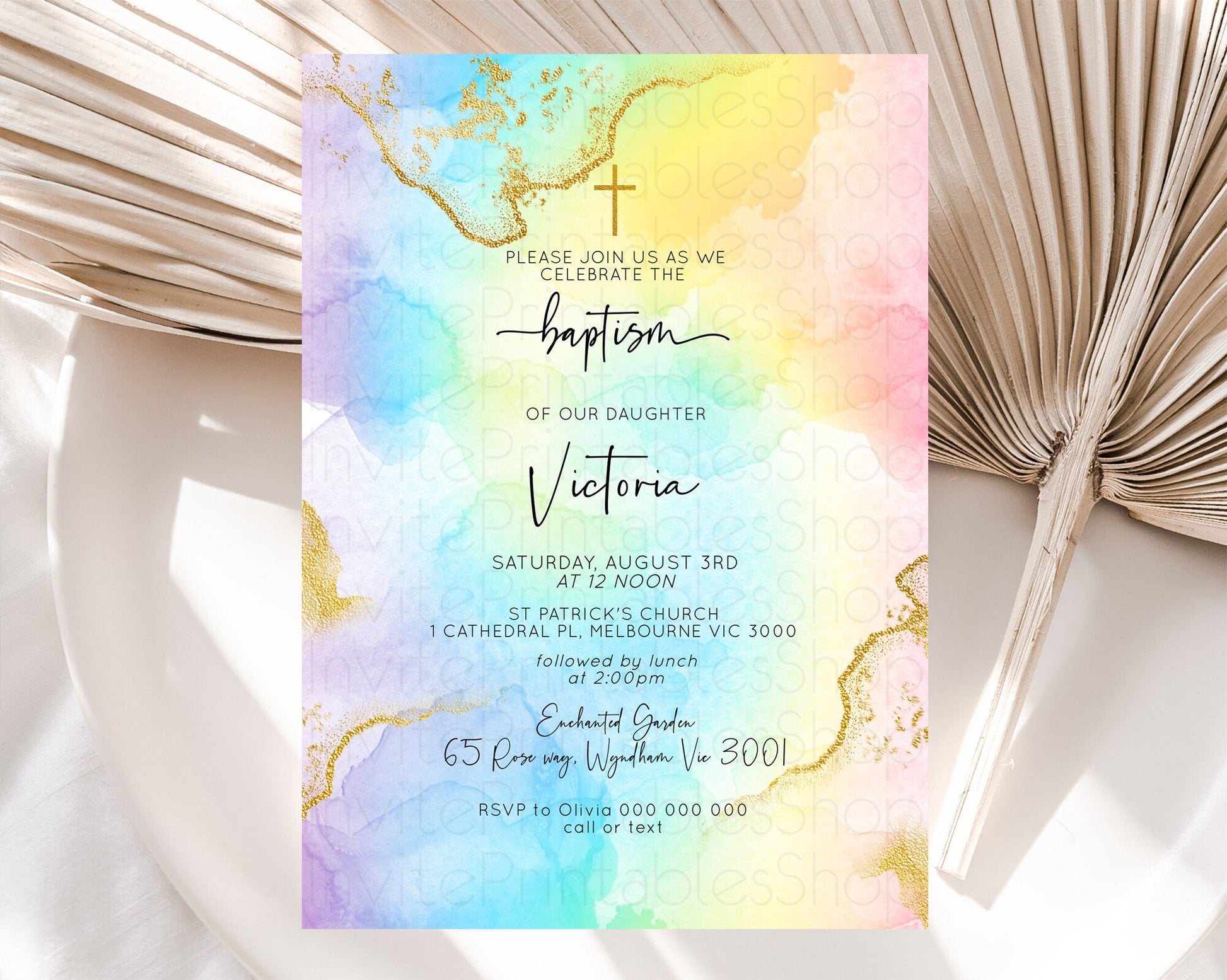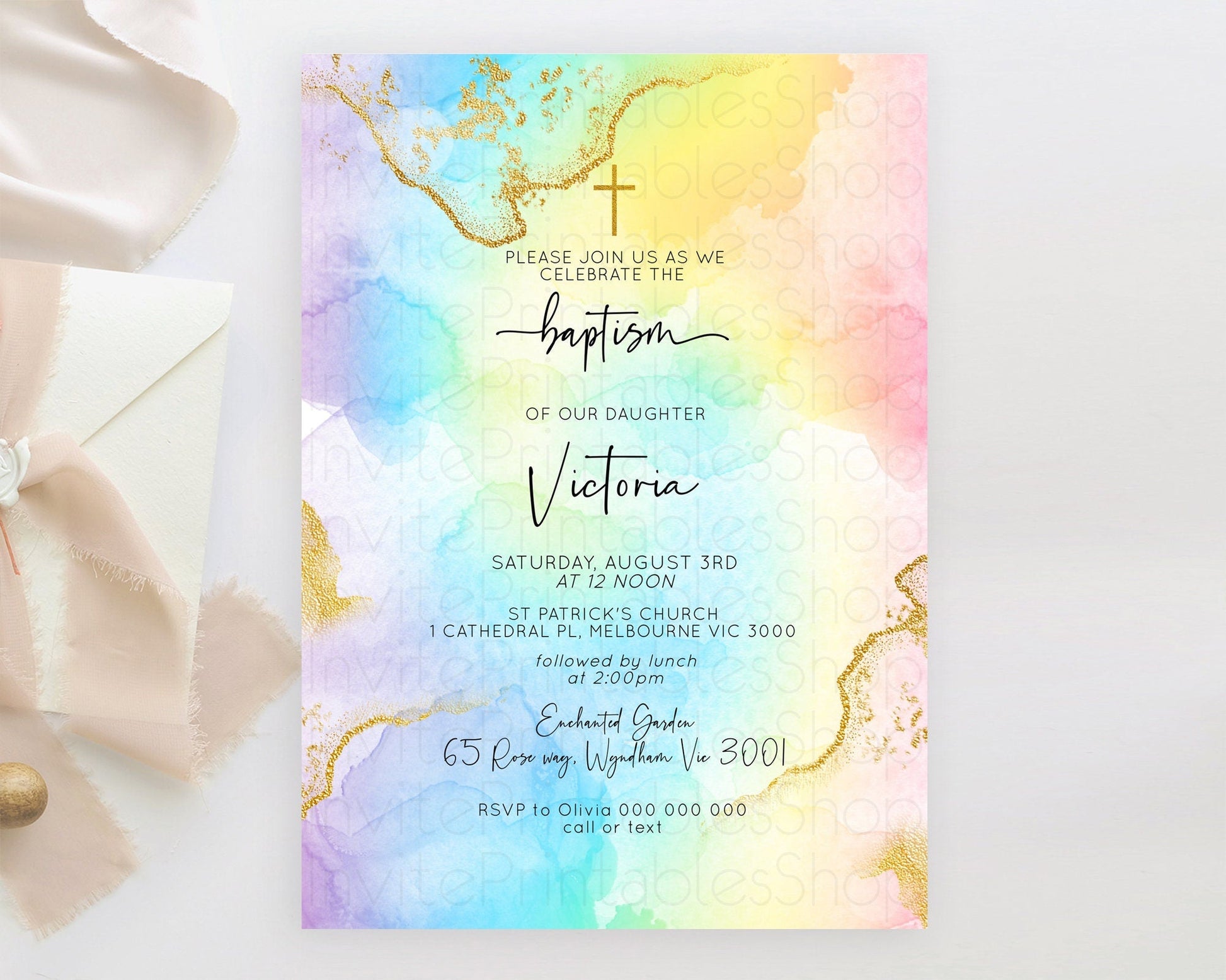 Pastel Baptism Invitation Pastel Colors Watercolor Baptism 1st Birthday Party Gold Ombre Pastel Rainbow Christening Holy Communion D10588