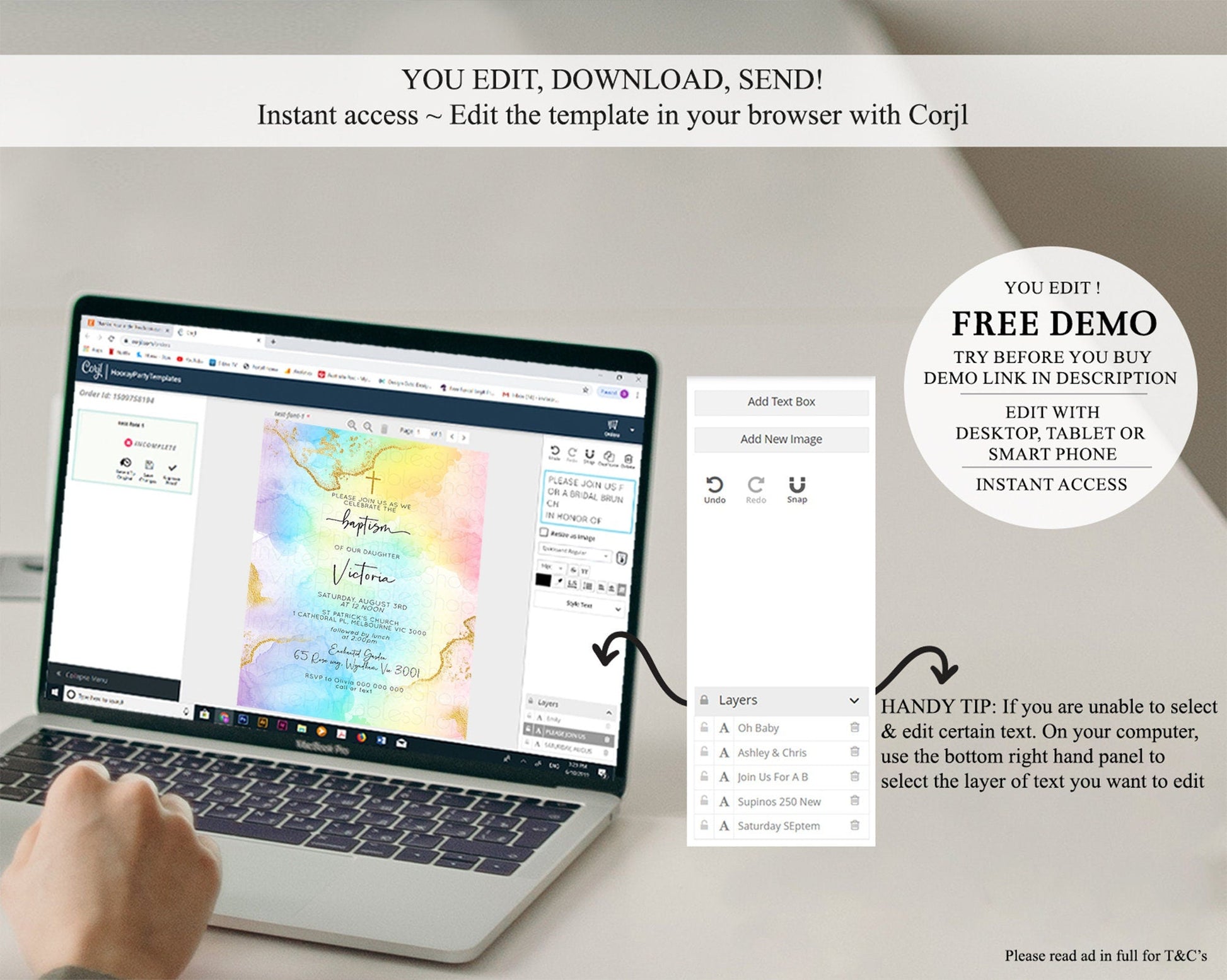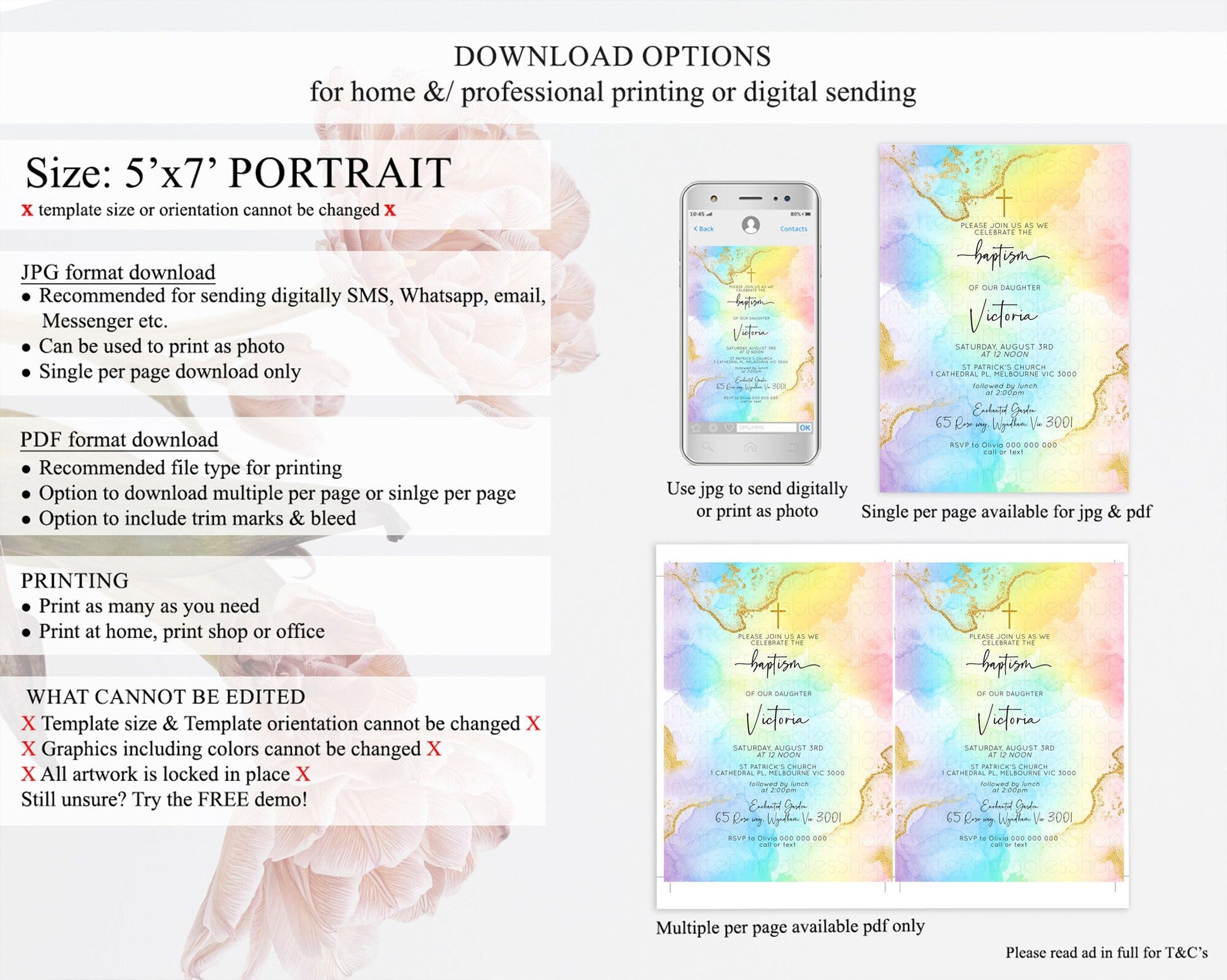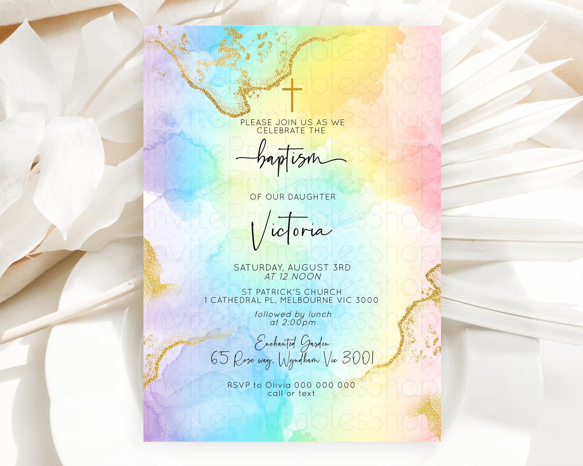 Pastel Baptism Invitation Pastel Colors Watercolor Baptism 1st Birthday Party Gold Ombre Pastel Rainbow Christening Holy Communion D10588