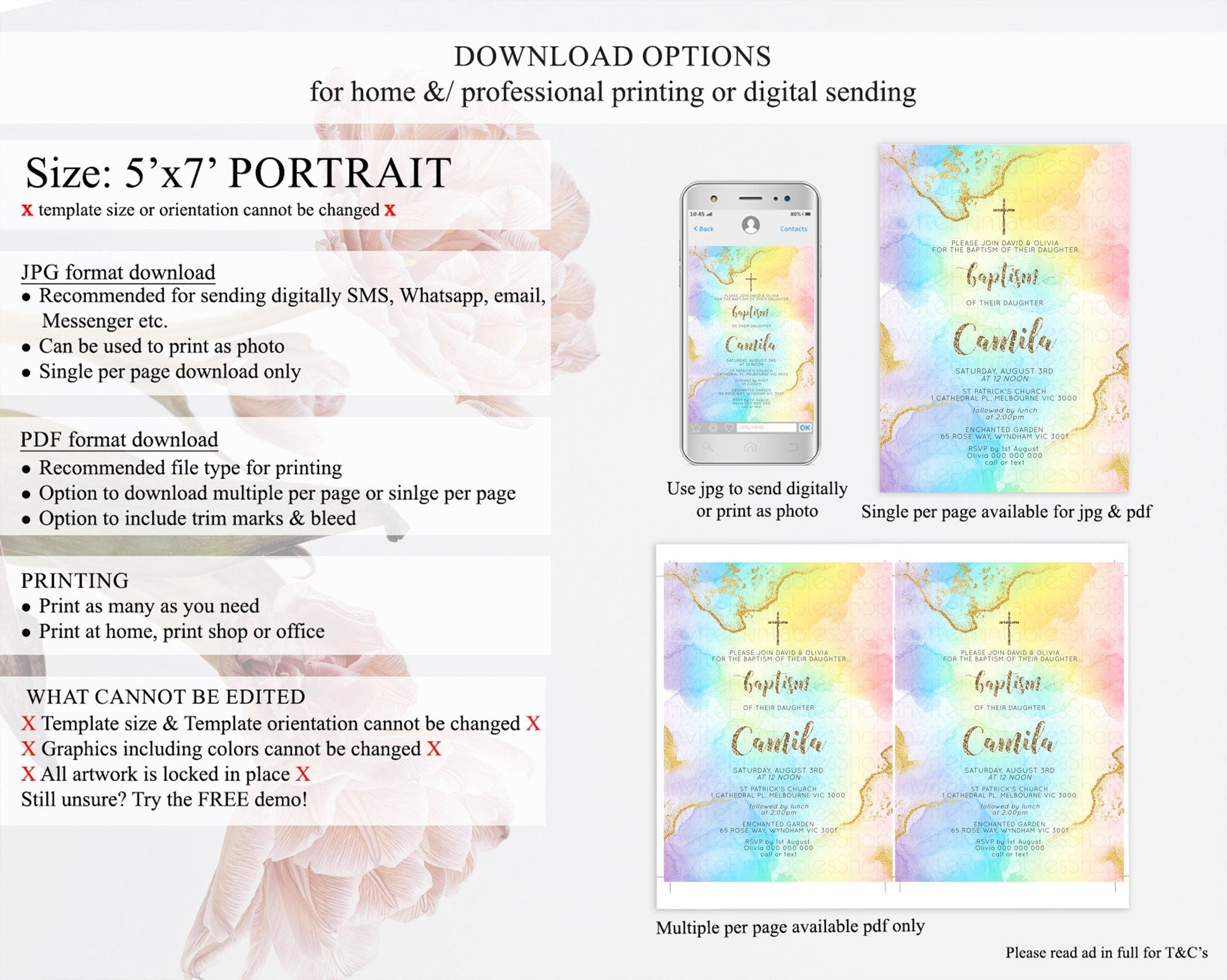 Pastel Baptism Invitation Pastel Colors Watercolor Baptism 1st Birthday Party Gold Ombre Pastel Rainbow Christening Holy Communion D10589